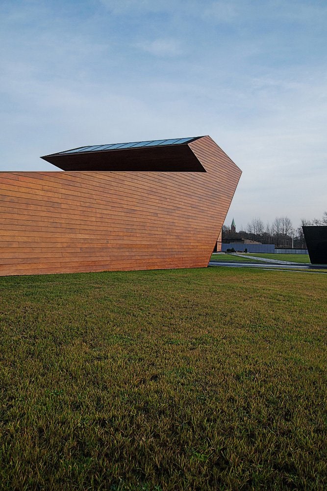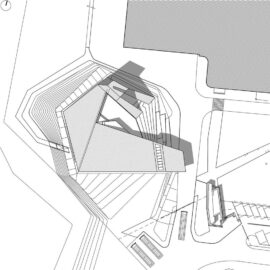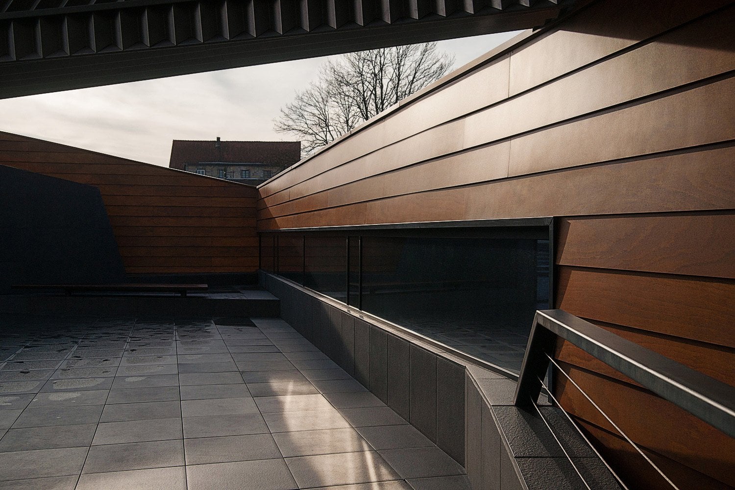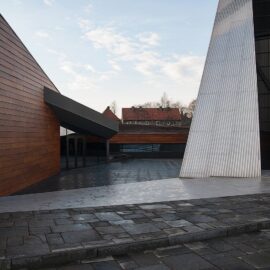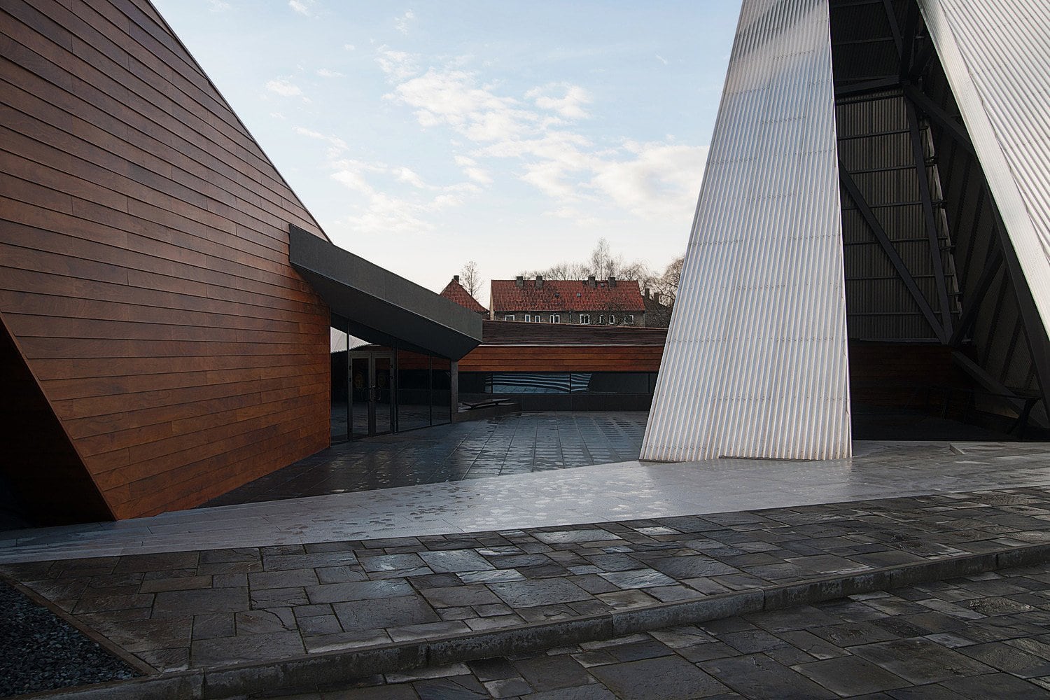 Приоткрытые зоны входных групп обоих объемов позволяют посетителям снаружи проникнуть в интерьер взглядом. В то же время, «хвост» деревянного блока, развернутый в сторону высокого белого объема, образует подобие треугольника, замыкает пространство, формируя внутренний двор.