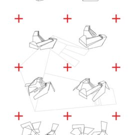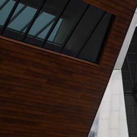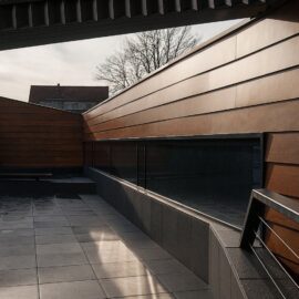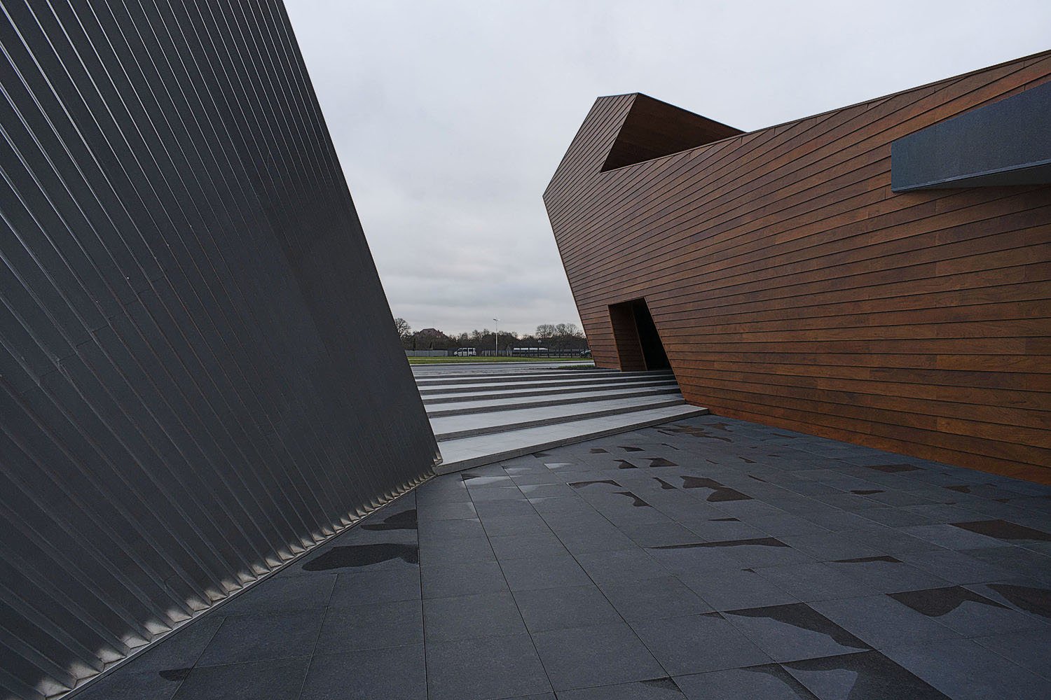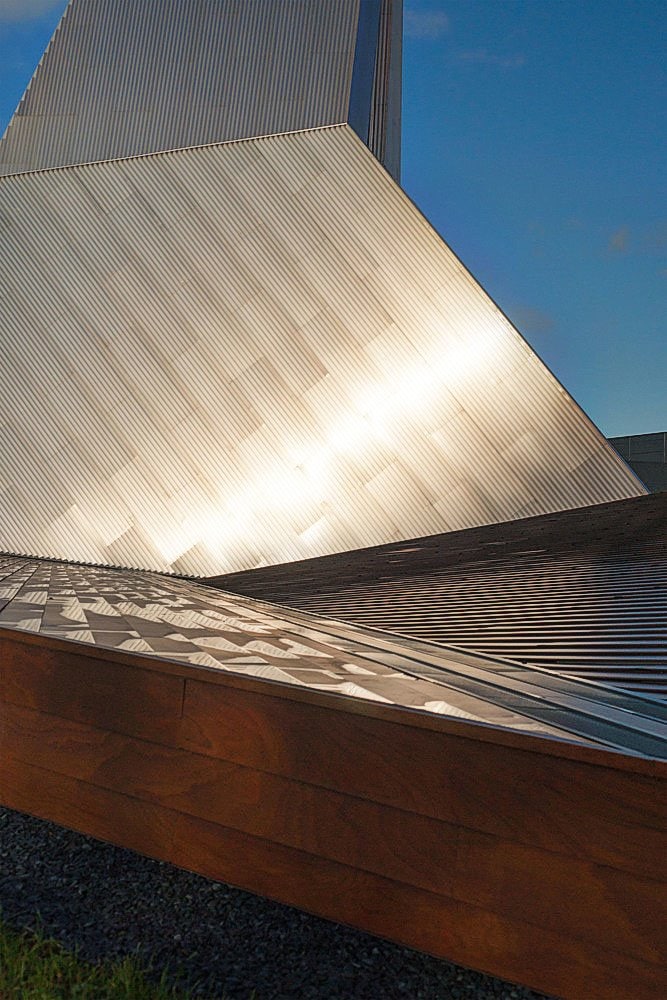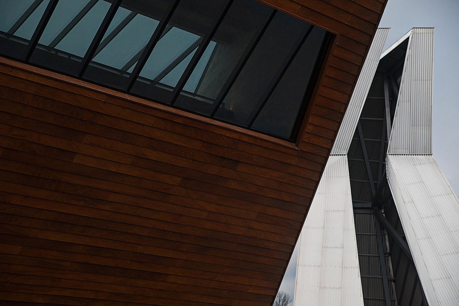 Приоткрытые зоны входных групп обоих объемов позволяют посетителям снаружи проникнуть в интерьер взглядом. В то же время, «хвост» деревянного блока, развернутый в сторону высокого белого объема, образует подобие треугольника, замыкает пространство, формируя внутренний двор.