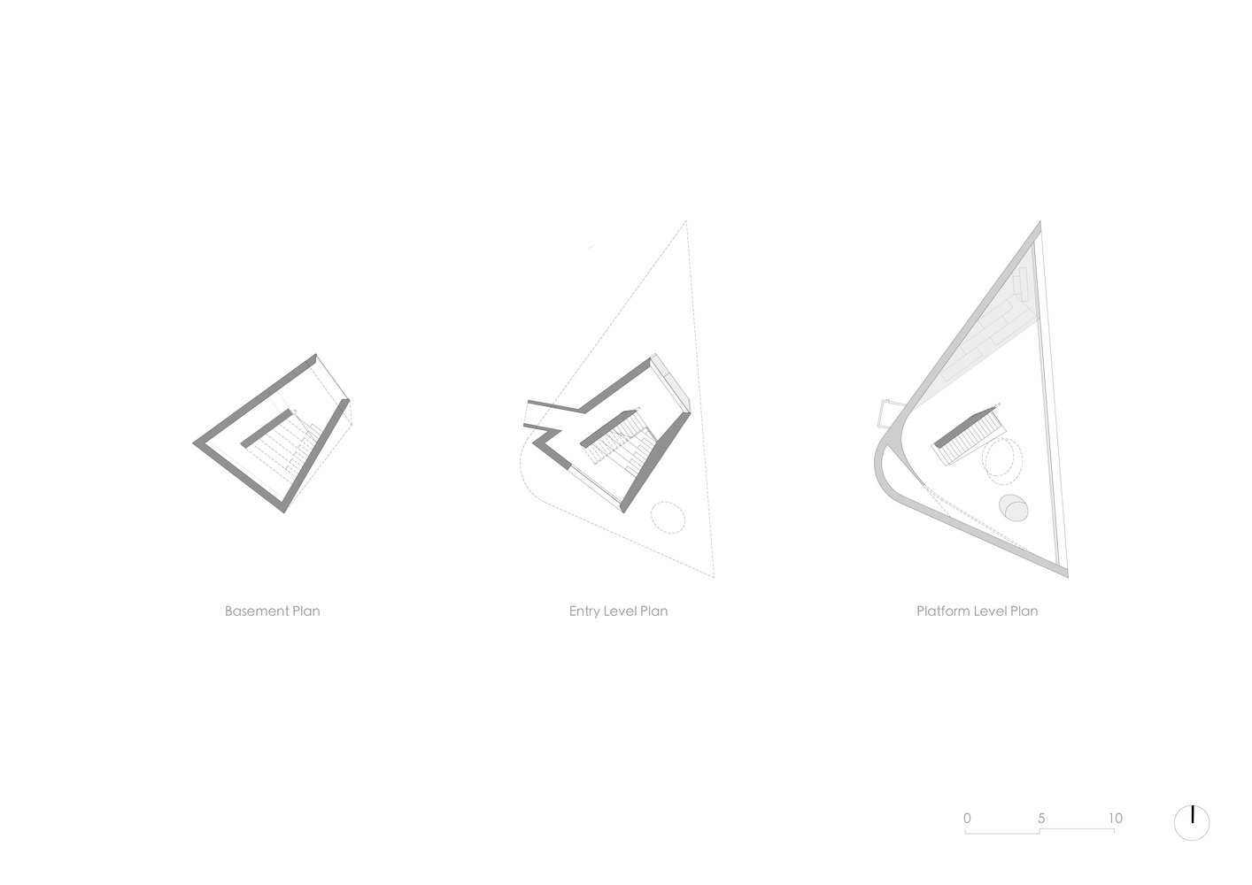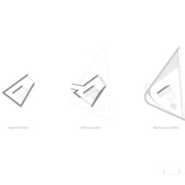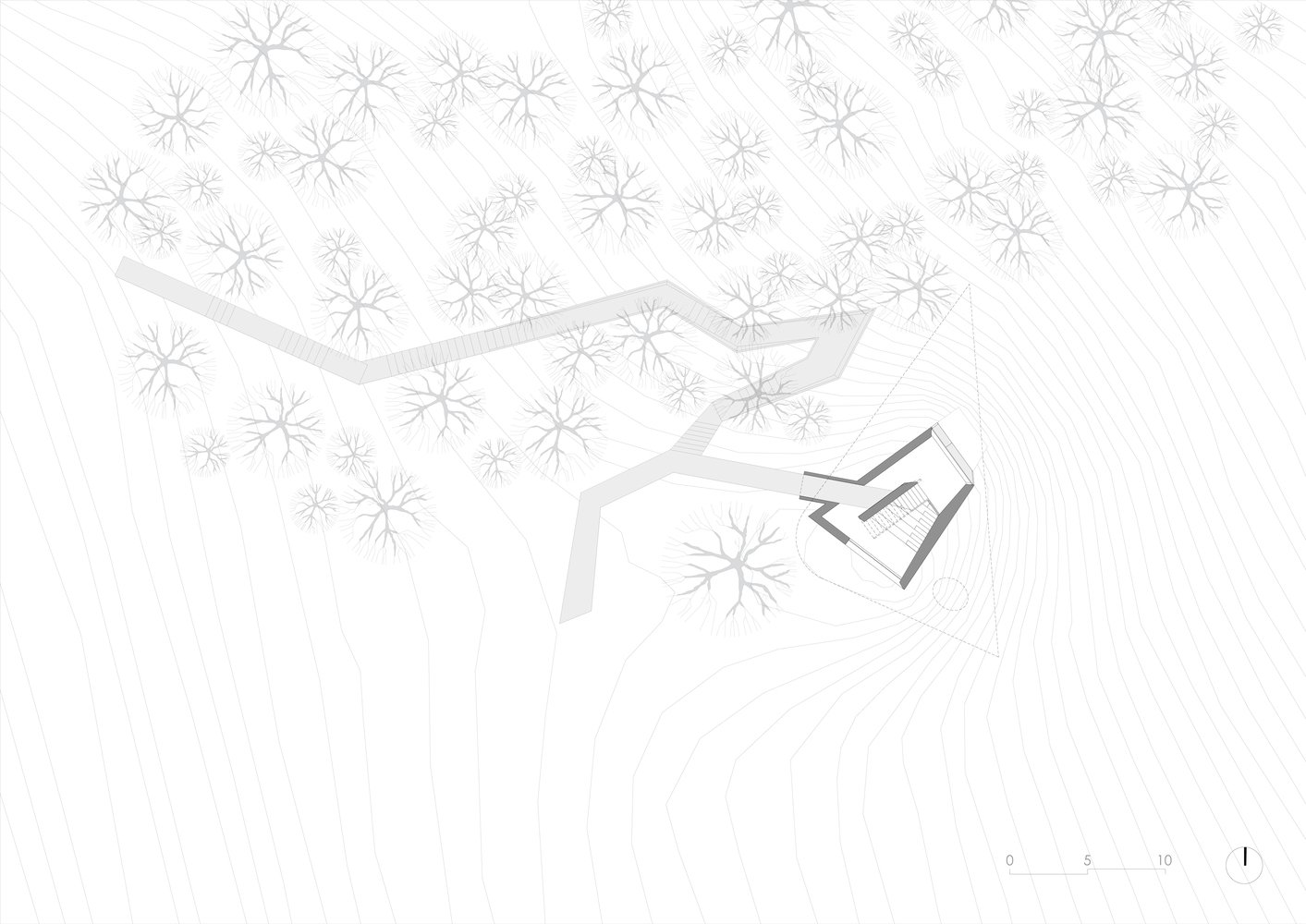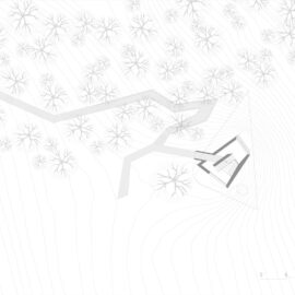 Первым этапом проектирования домика для отдыха было нанесение на план местности всех существующих на выделенном участке деревьев. Дизайнеры старались минимизировать воздействие своего сооружения на зеленые насаждения в месте постройки. Для этого они подняли треугольный объем смотровой площадки на круглый цокольный подиум. Архитекторы сориентировали открытую террасу на панорамы гор и озеро Сонгуа.