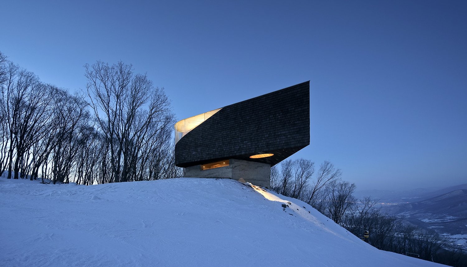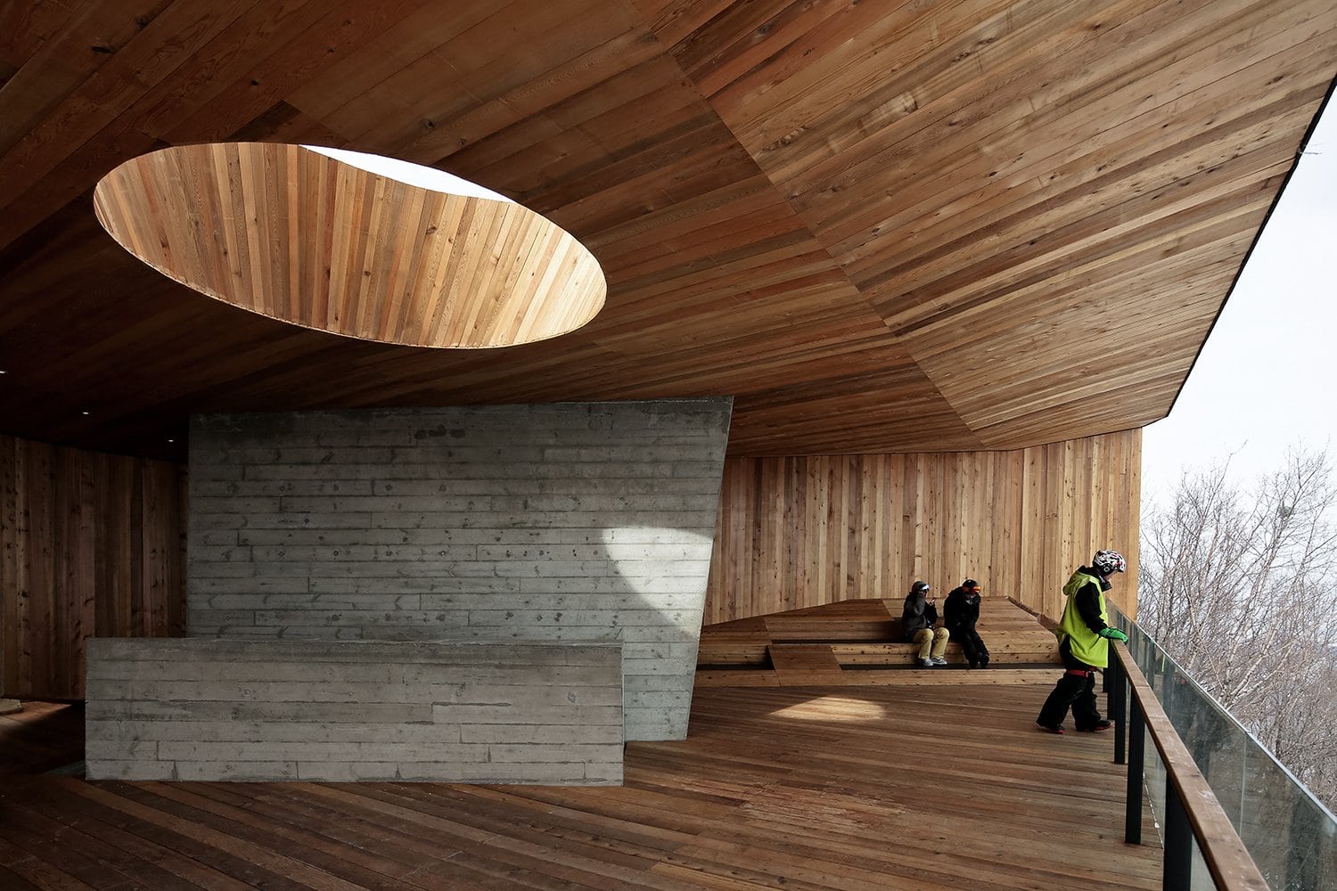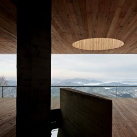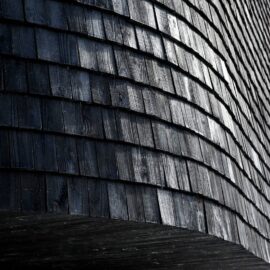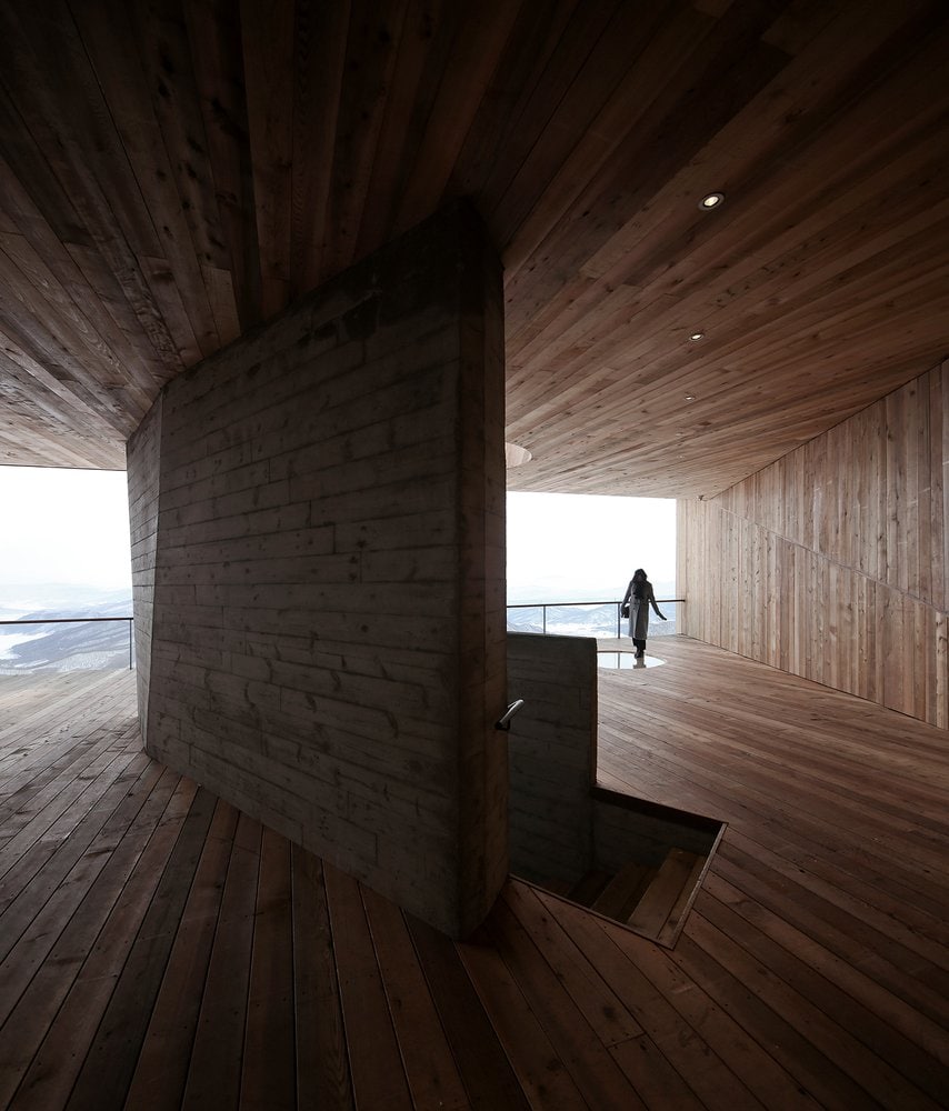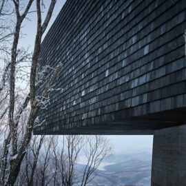 Нижний уровень смотровой площадки выполнен из монолитного бетона, который оставлен без отделки. А ее фасады отделаны обожжённым гонтом из кедра Shou-Sugi-Ban.