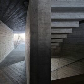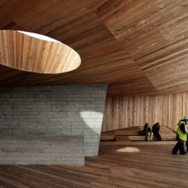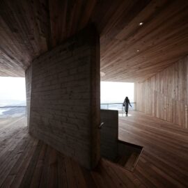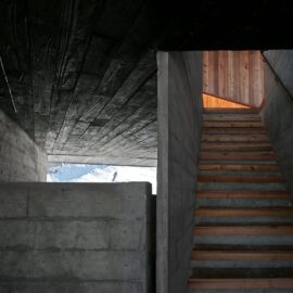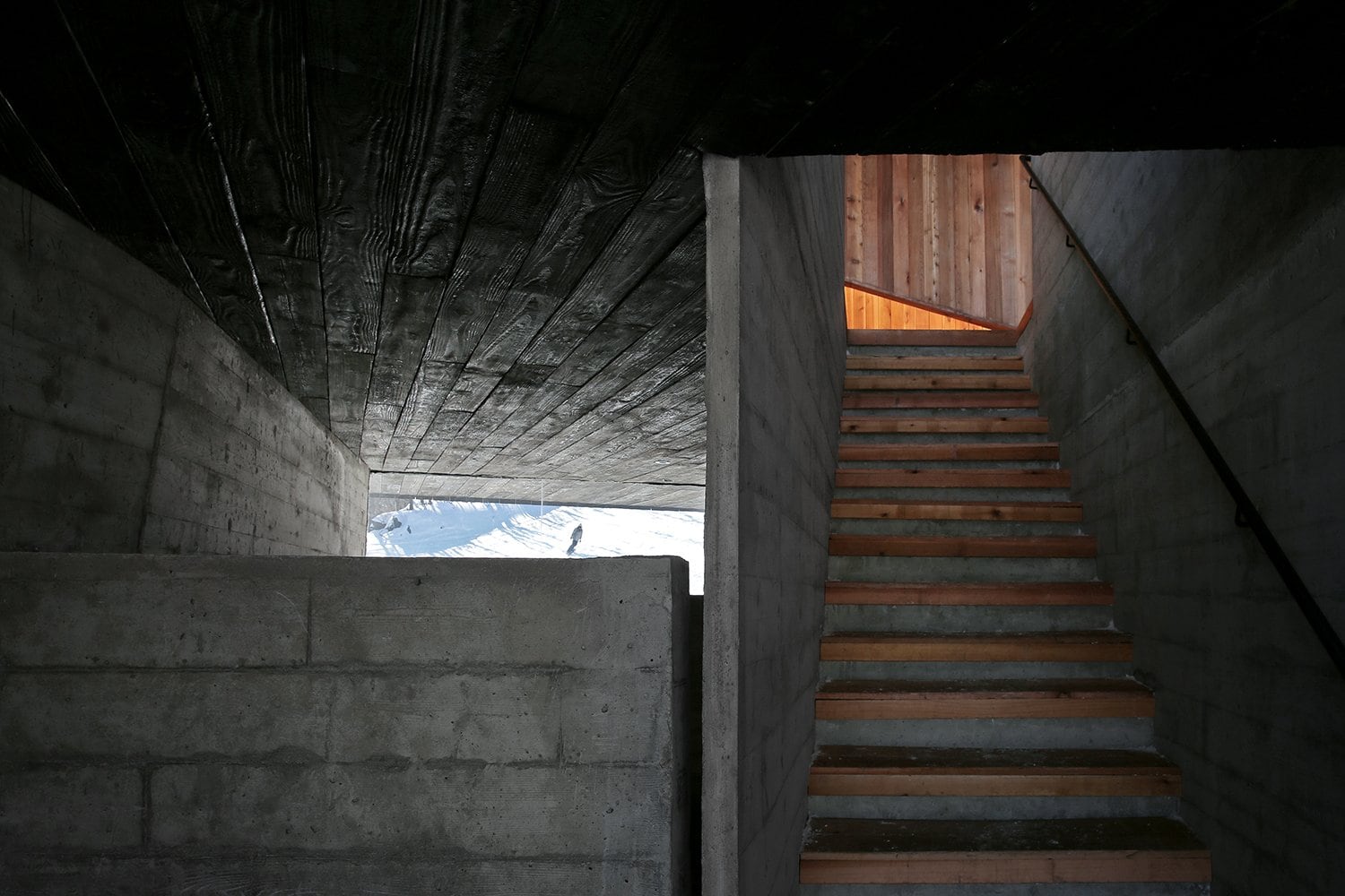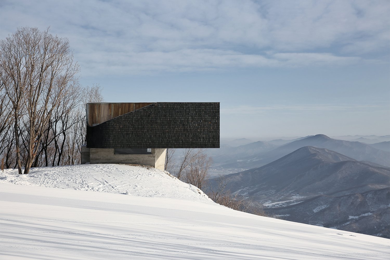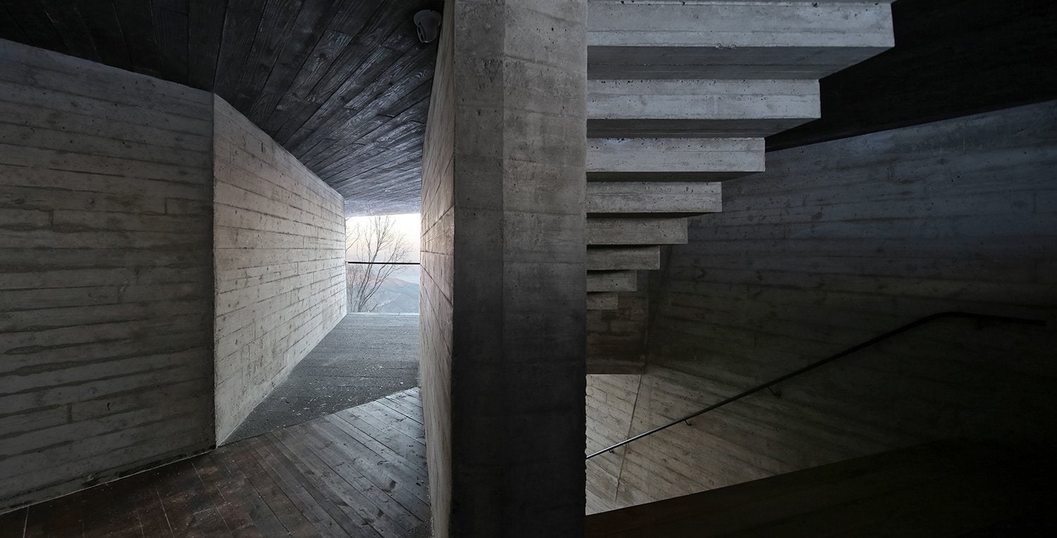 Нижний уровень смотровой площадки выполнен из монолитного бетона, который оставлен без отделки. А ее фасады отделаны обожжённым гонтом из кедра Shou-Sugi-Ban.
