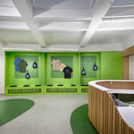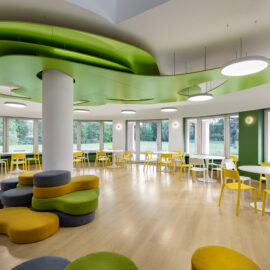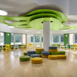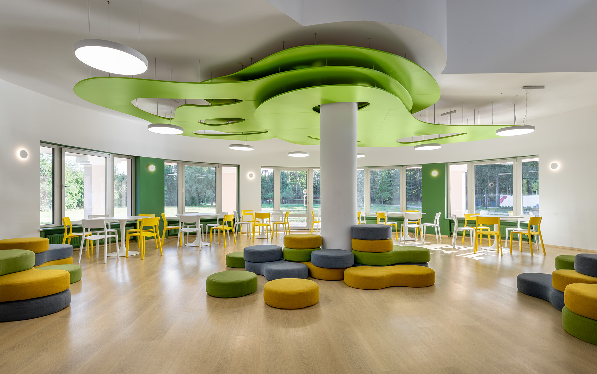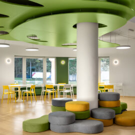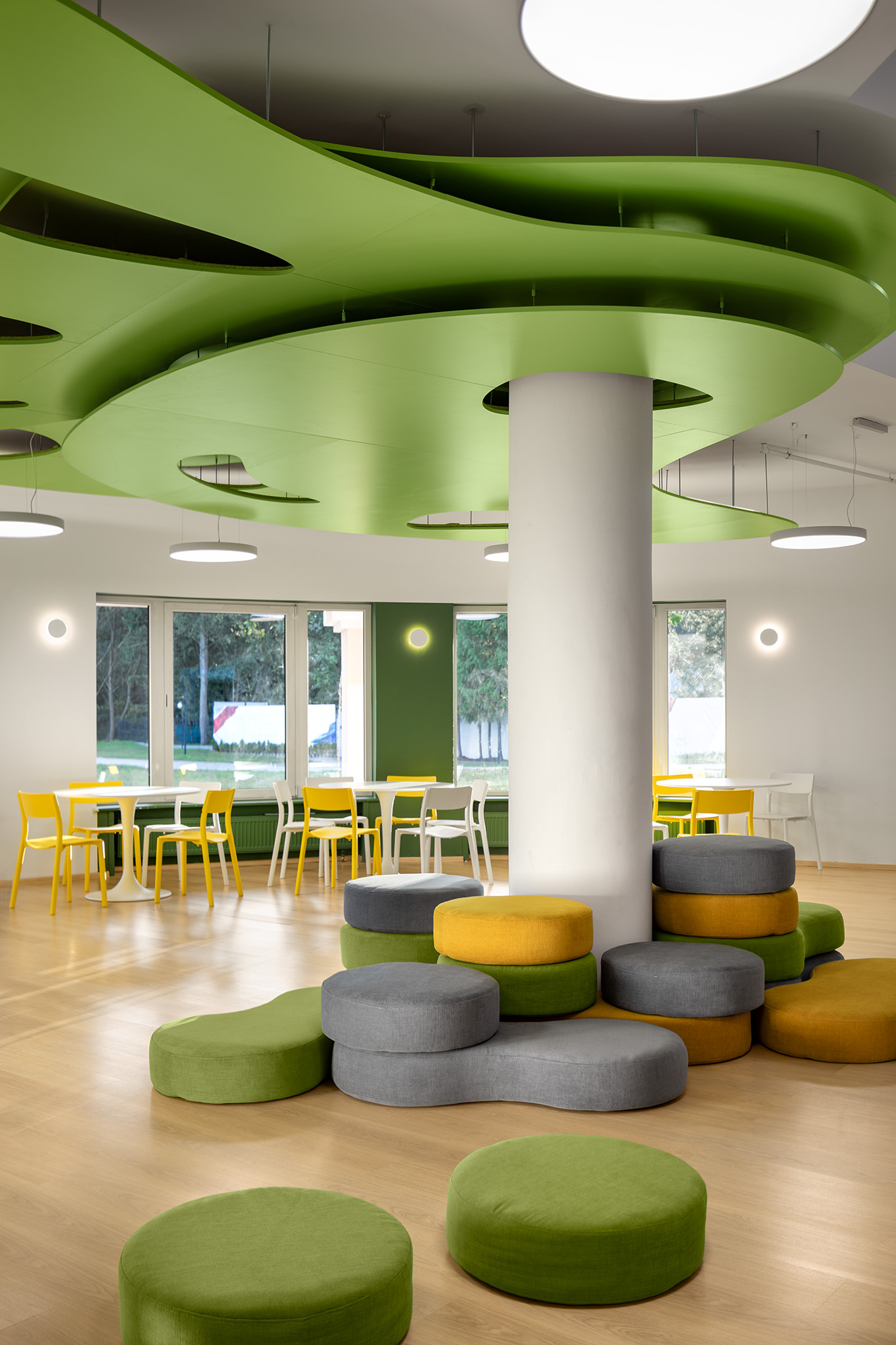 Дизайнери приділили особливу увагу текстурам, вони тут м’які й тактильно приємні. Пуфи під колоною можна рухати, будувати з них конструкції – це цікаво дітям. Доповнюють естетику івент-холу зелені сходи з тематичними декоративними елементами на стіні поруч.