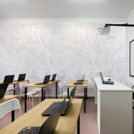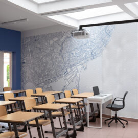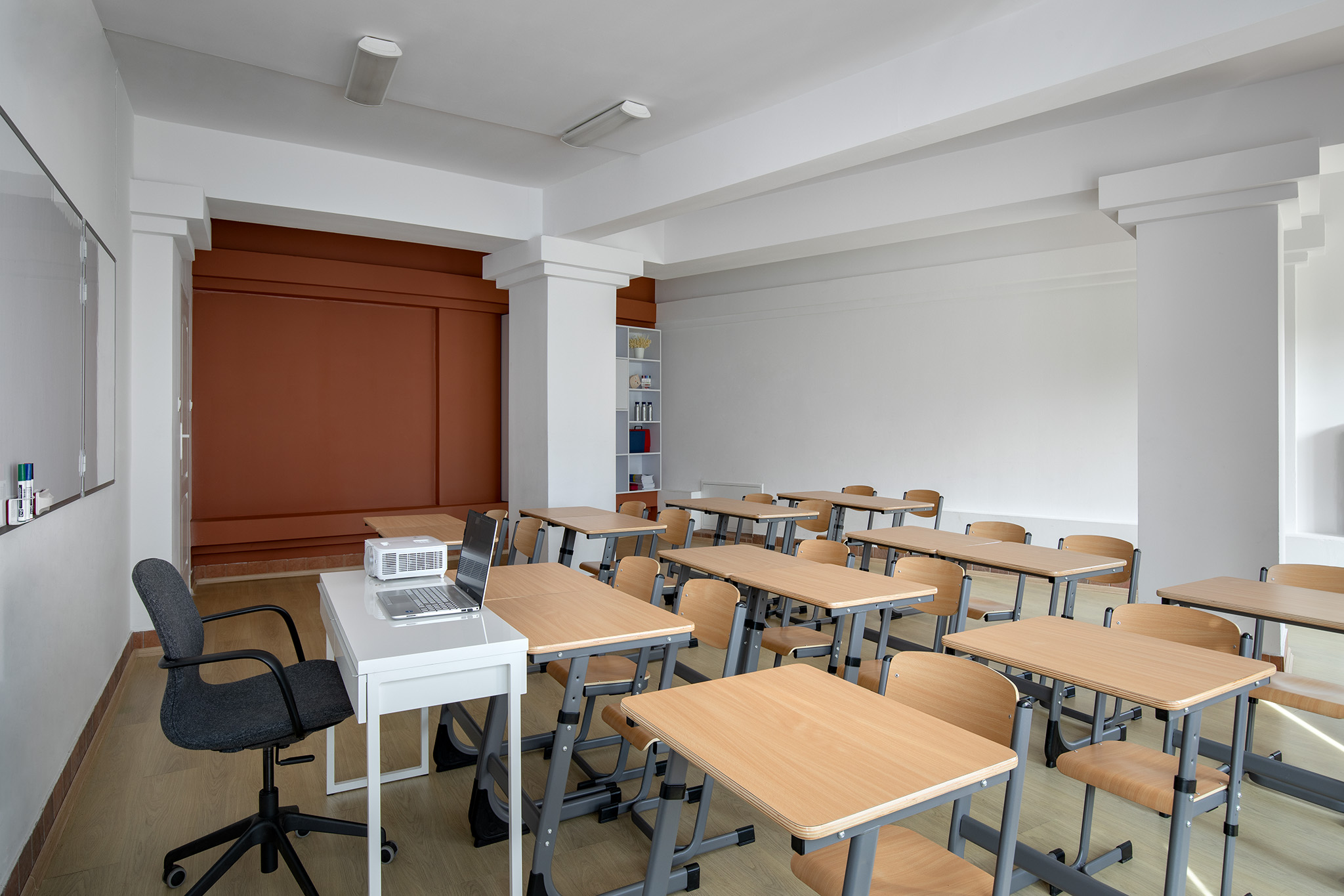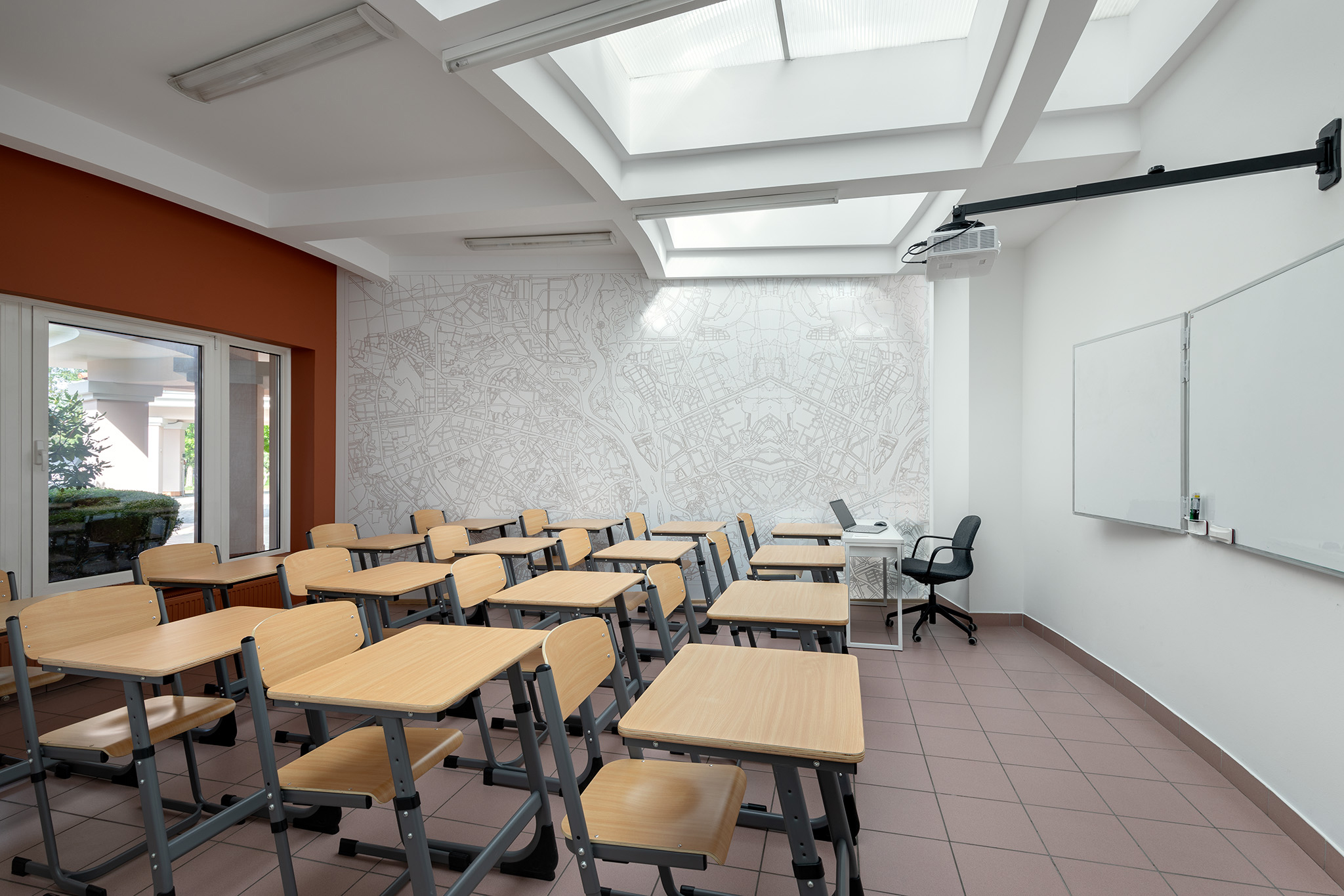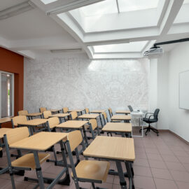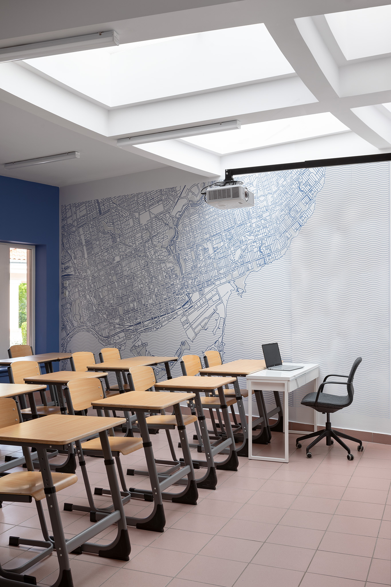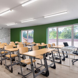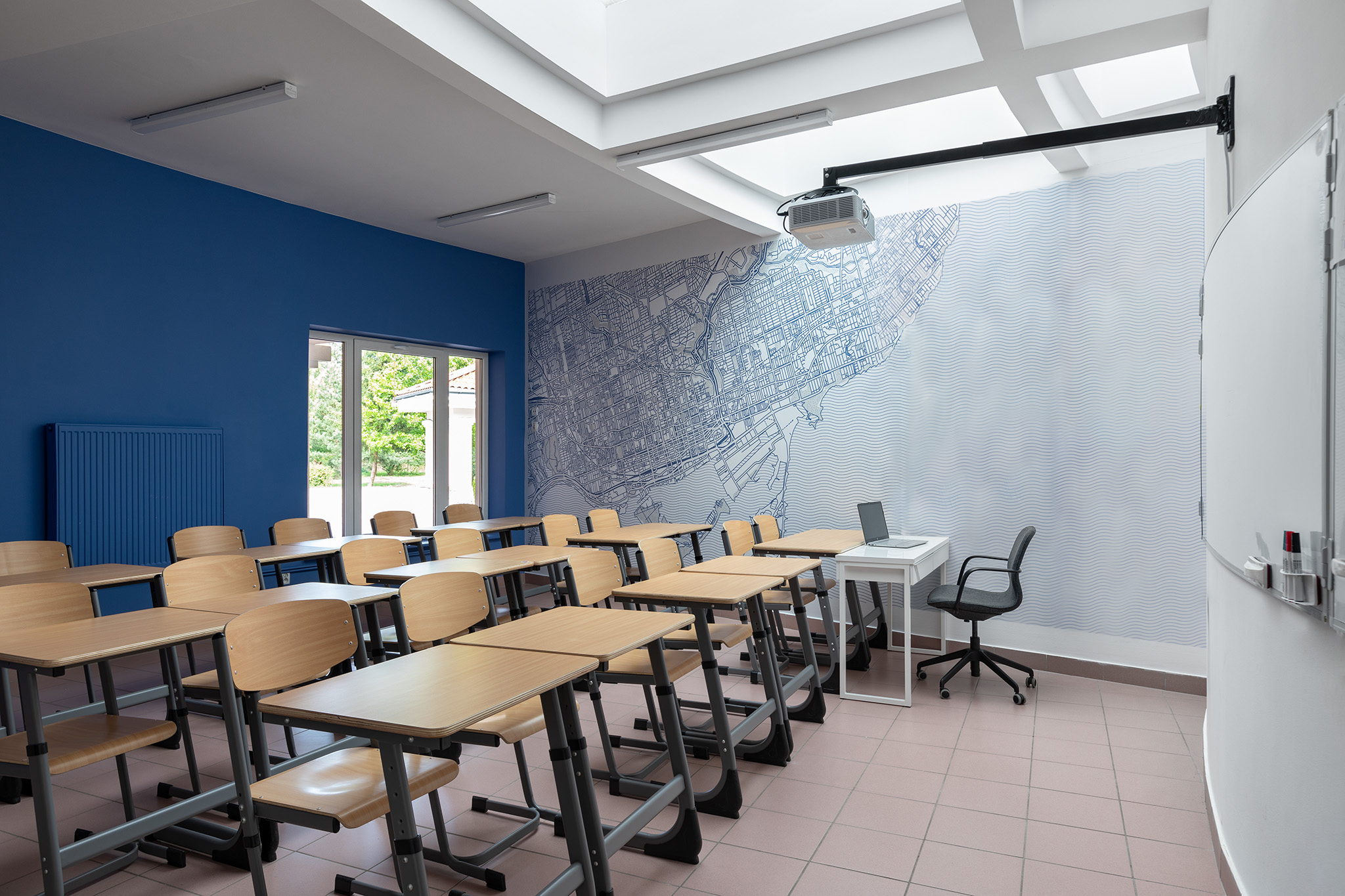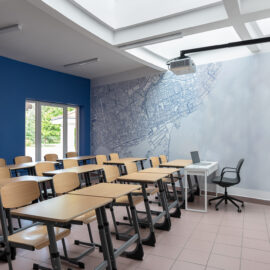 Для прогресивного освітнього процесу задіяли гнучкі просторові рішення: класи різноманітні за розмірами й конфігурацією. Кожна класна кімната має свою власну індивідуальність, виходячи навіть із єдиної естетики дизайну. Дерево з івент-холу проростає корінням у стаціонарні класи у вигляді ледь помітних натяків, як от малюнку карти на стіні, наприклад. Ріст і оновлення, безумовно, присутні у навчальних класах. Потрапляючи з івент-холу чи транзитної зони в учбове приміщення, школярі опиняються в абсолютно відмінному середовищі, цілком перефокусовуючись на навчання.