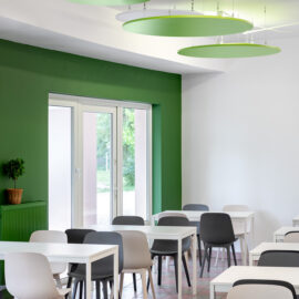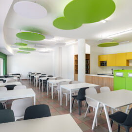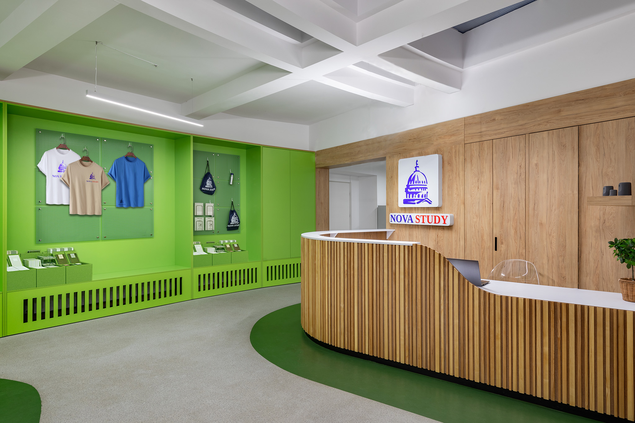 У дизайні інтер’єру втілили ріст і оновлення – два важливі компоненти навчального процесу. Завдяки мінімалізму, базованому на світлих відтінках, кремовому дереву у поєднанні з кольором соковитої трави школа виглядає теплою і гостинною. Дизайнери вибрали пастельні приглушені тони навіть для акцентних яскравих кольорів, щоб простір був м’яким і делікатним.