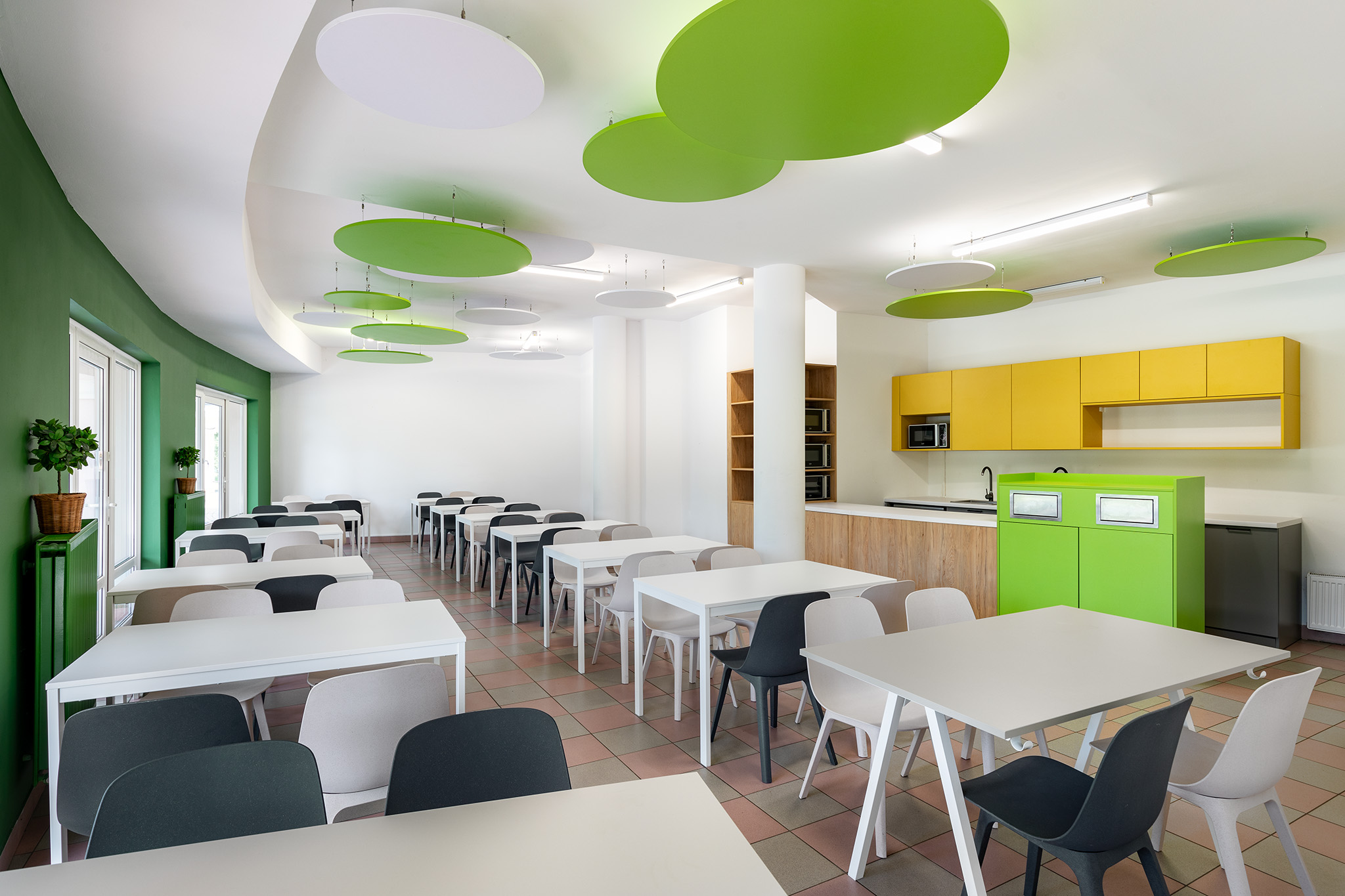 Приміщення архітектурні й багатогранні. Серце школи – це її івент-хол. Він мультифункціональний, передбачений для проведення виступів, зустрічей, відпочинку та спілкування дітей. Простір радіальний і задіяні деталі підтримують цю радіальність. Акцент івент-холу – колона, яка продовжується до стелі нашаруванням великих кіл. За задумом це абстрактне дерево, а пуфи внизу – його плоди. Крона дерева розрослась, а підсвітка між її шарами надає йому магічності. Дерево уособлює потужну енергію знань, які ведуть до покорення вершин, символізує ріст і оновлення.