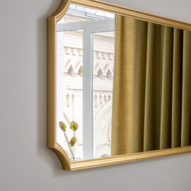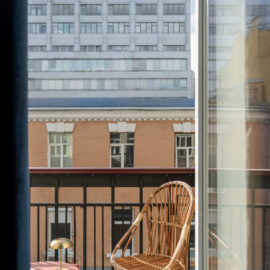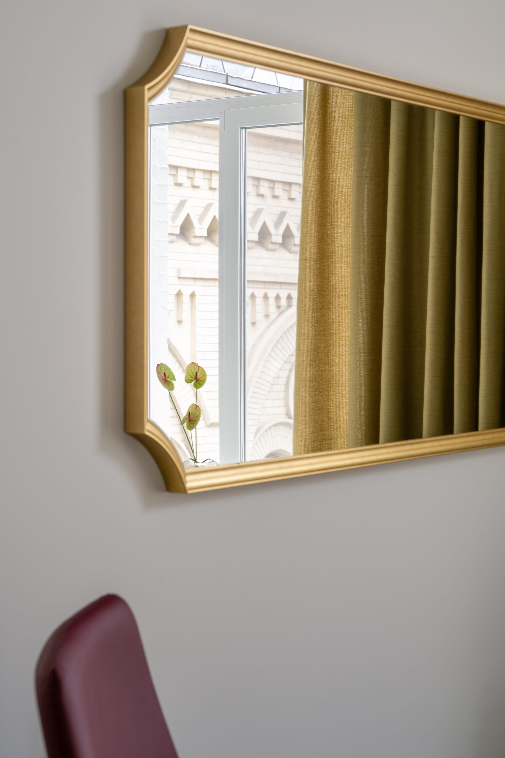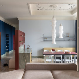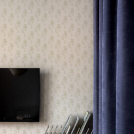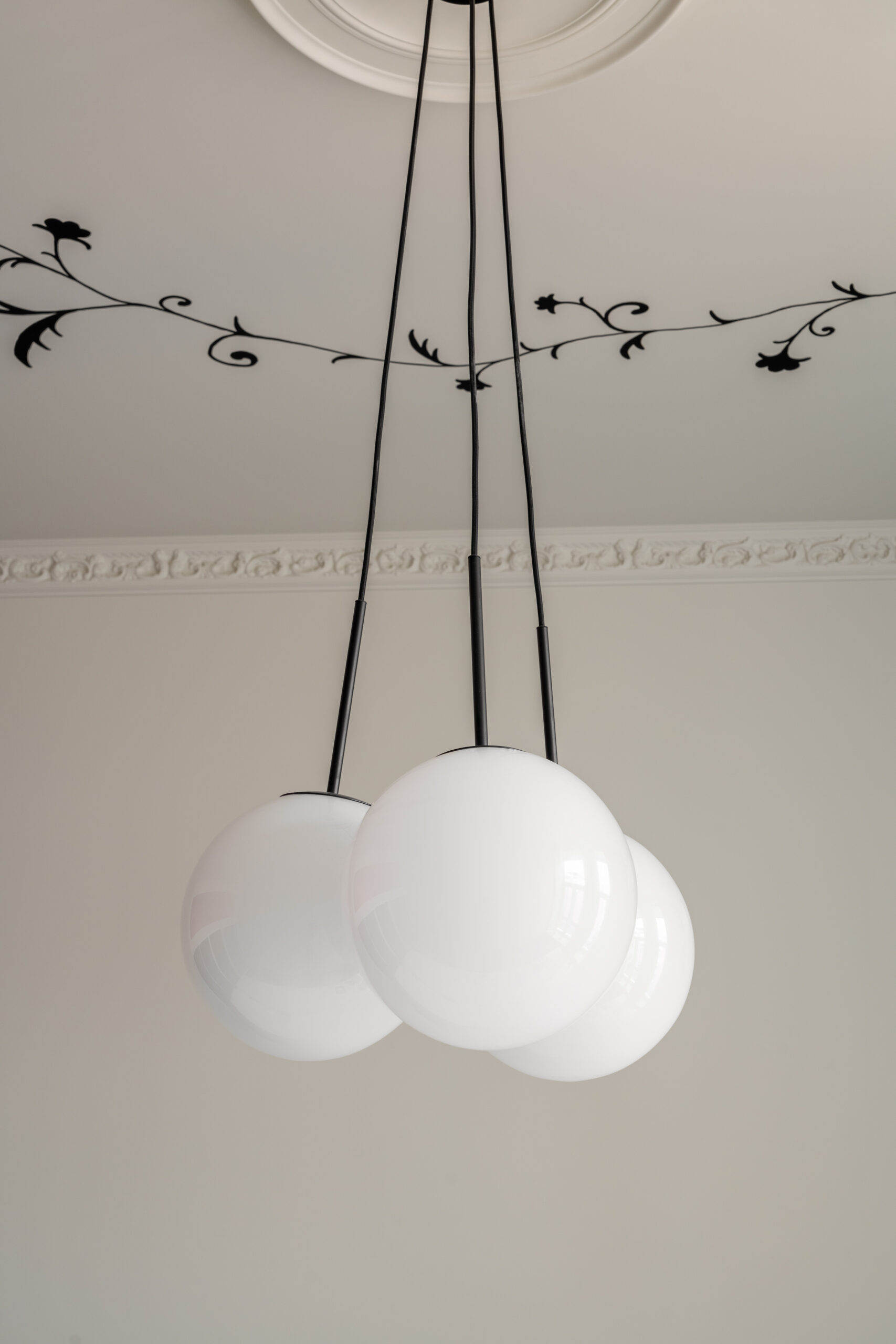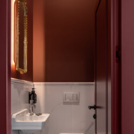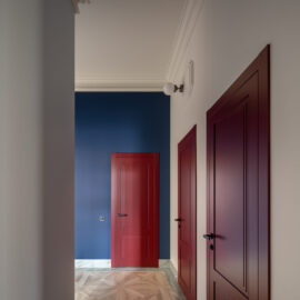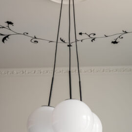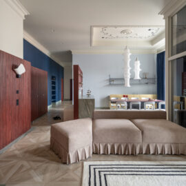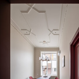 Класичні пропорції кімнати, декоративний фриз на стику стін і стелі, вінтажні деталі — усе це формує відчуття простору, який пов’язаний з історією місця, але осмислений крізь призму сучасного дизайну.
