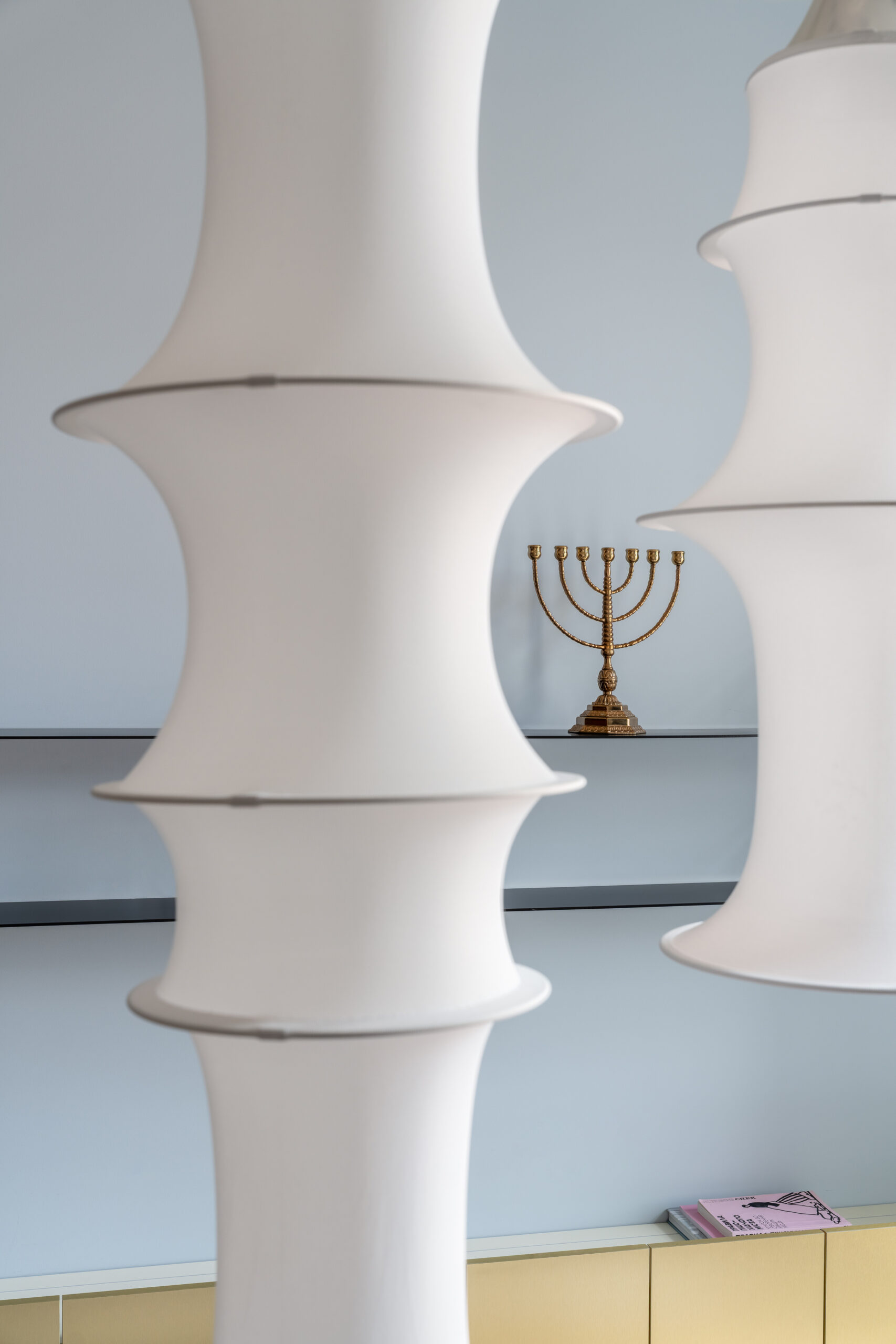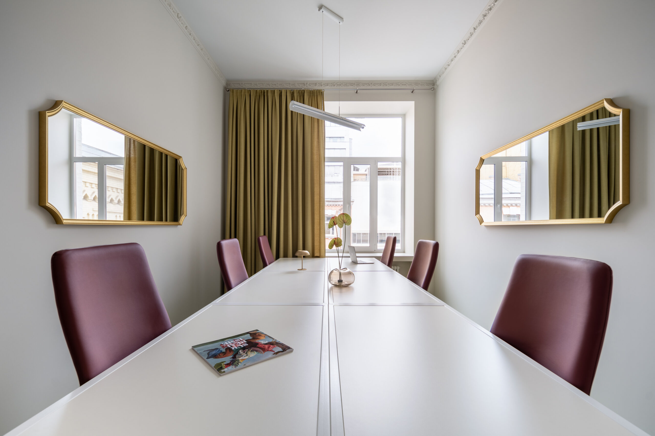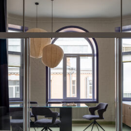 В офісі передбачені чотири функціональні робочі зони, кожна з яких вирішена у власній атмосфері. Одна з кімнат розташована найближче до сусідньої синагоги, що історично сформувала архітектурний та культурний контекст цієї частини міста. Саме тому простір ненав’язливо, але чутливо віддзеркалює навколишнє середовище: у палітрі з’являється теплий жовтий відтінок, що перегукується з кольором фасаду синагоги, а гірчична штора підкреслює це візуальне перекличення.