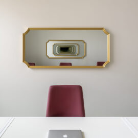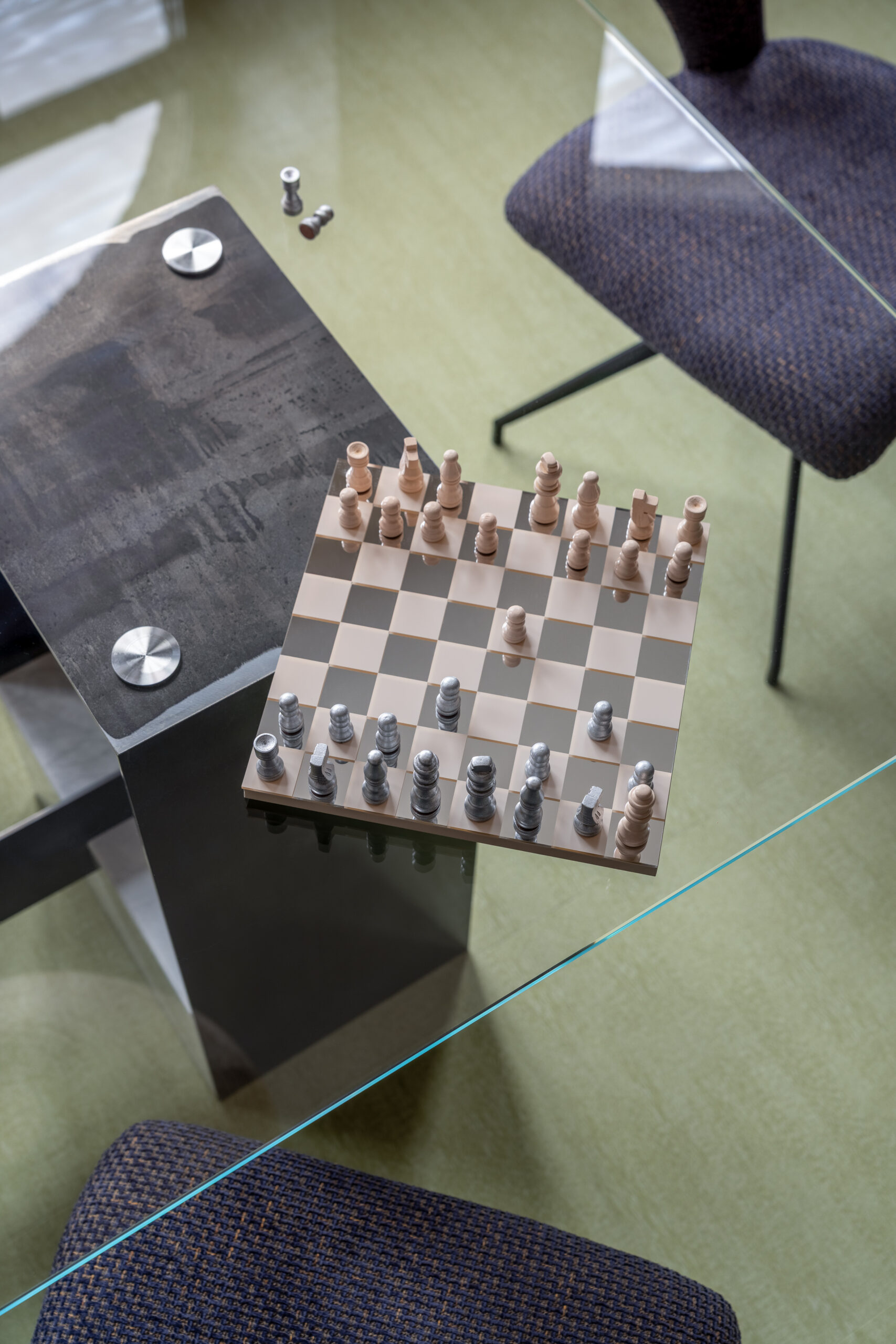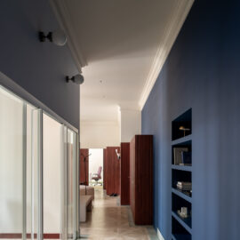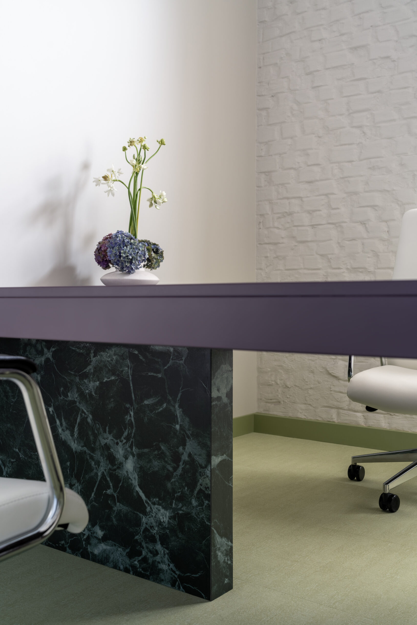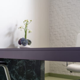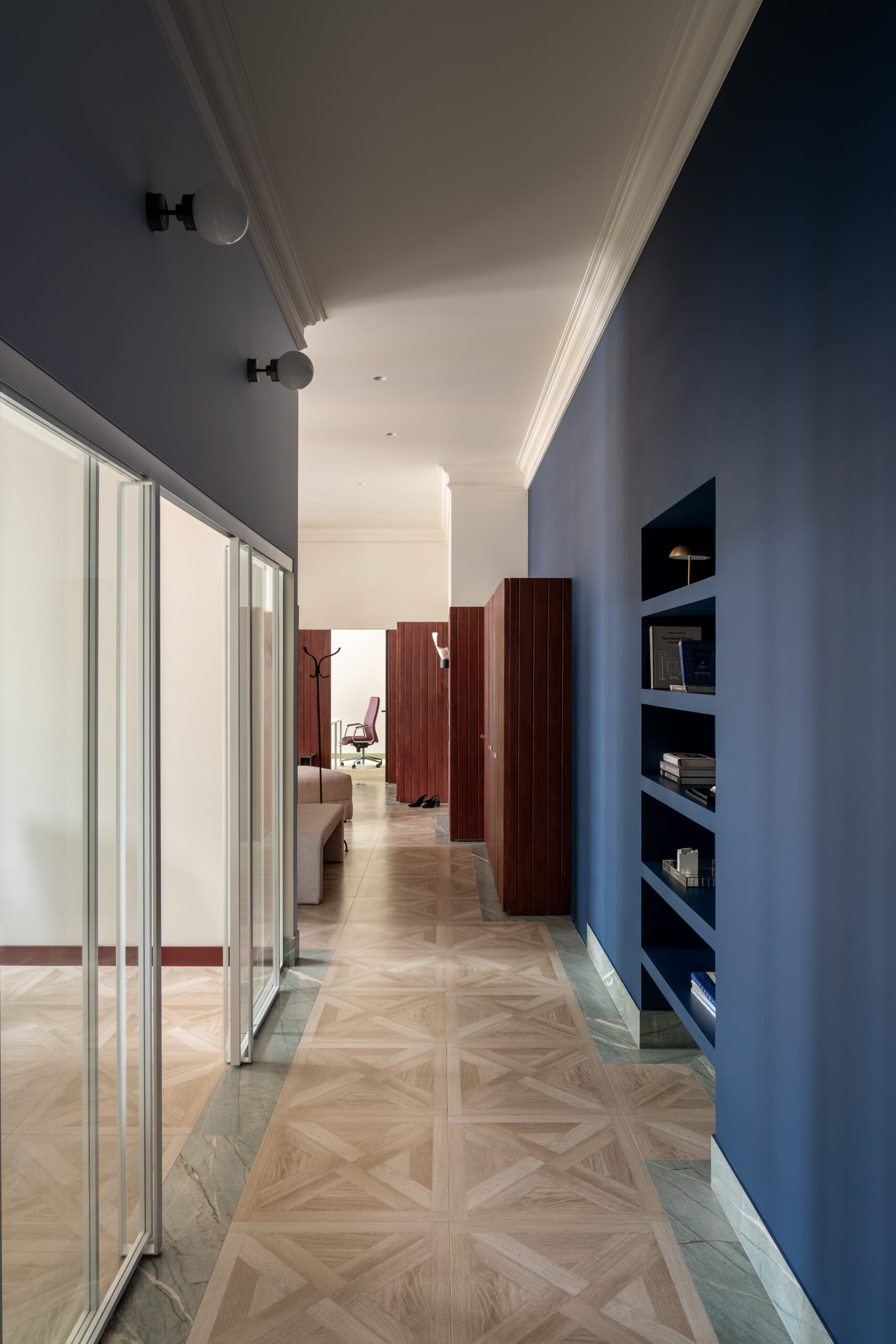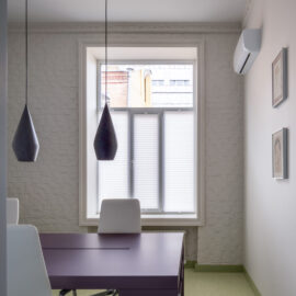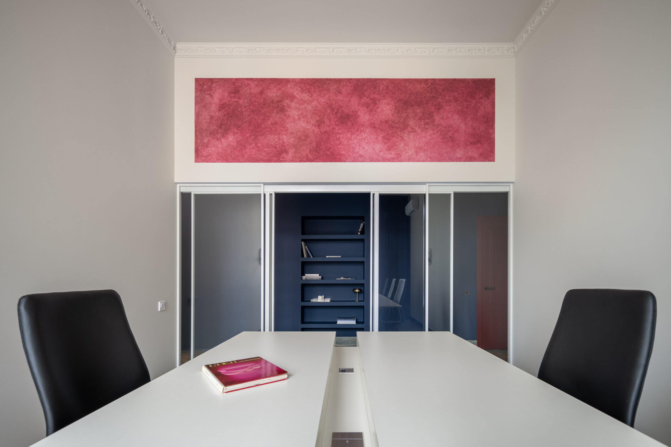 Кабінет директора розміщено у віддаленій зоні, з додатковим виходом. До вишуканої мінімалістичної основи ми додали яскраві акценти: темно-сині навісні полиці у стилі Дональда Джадда та апсайклінг-крісло.
