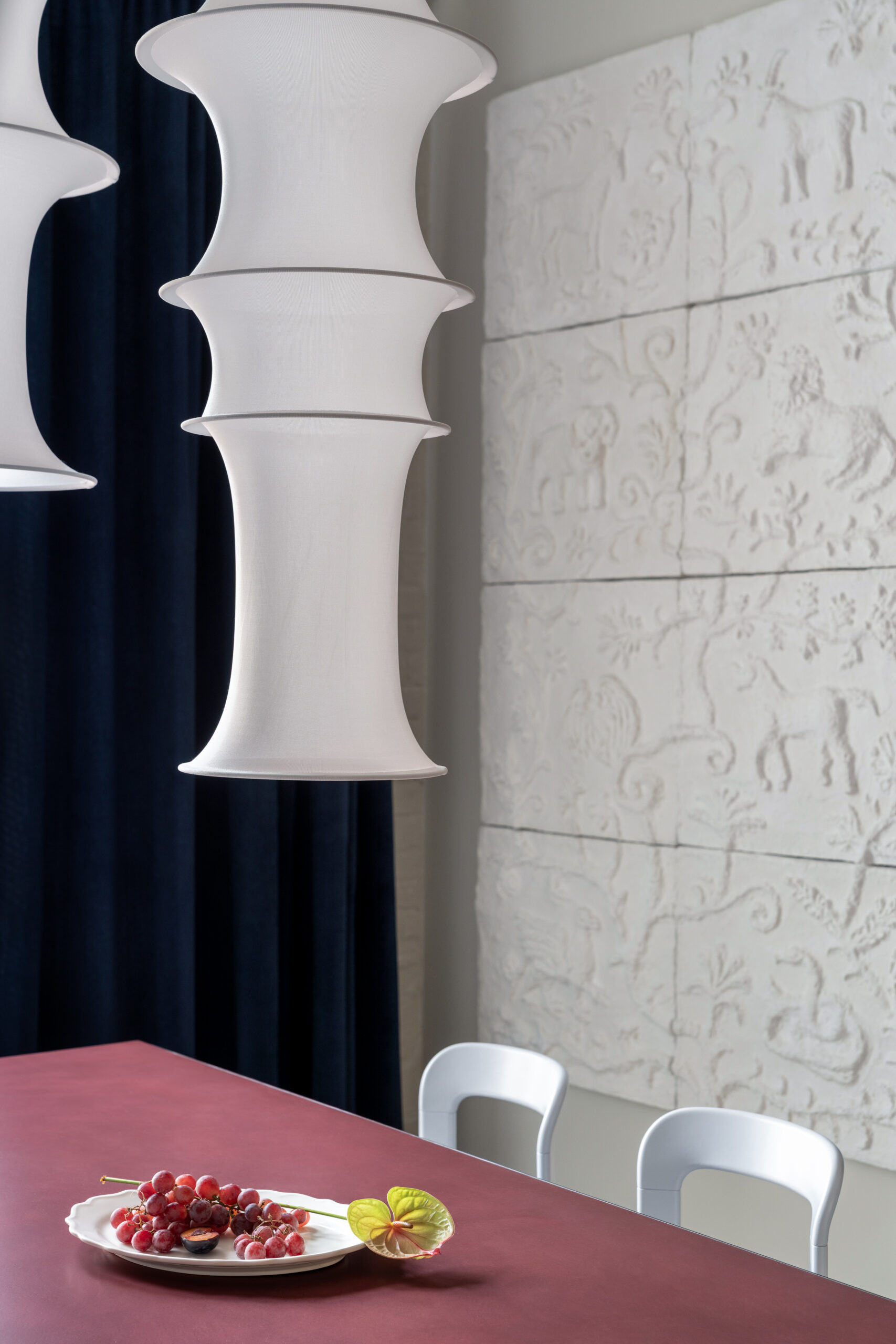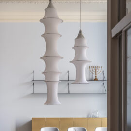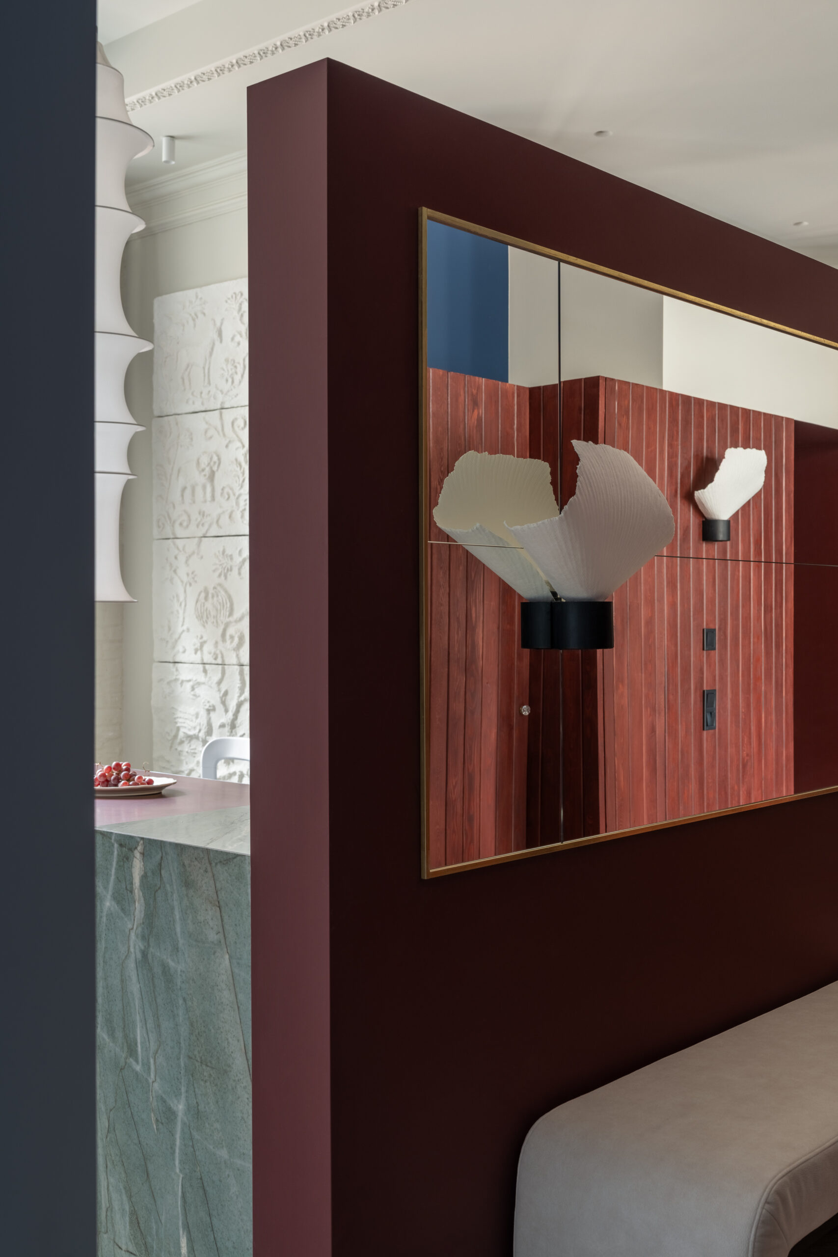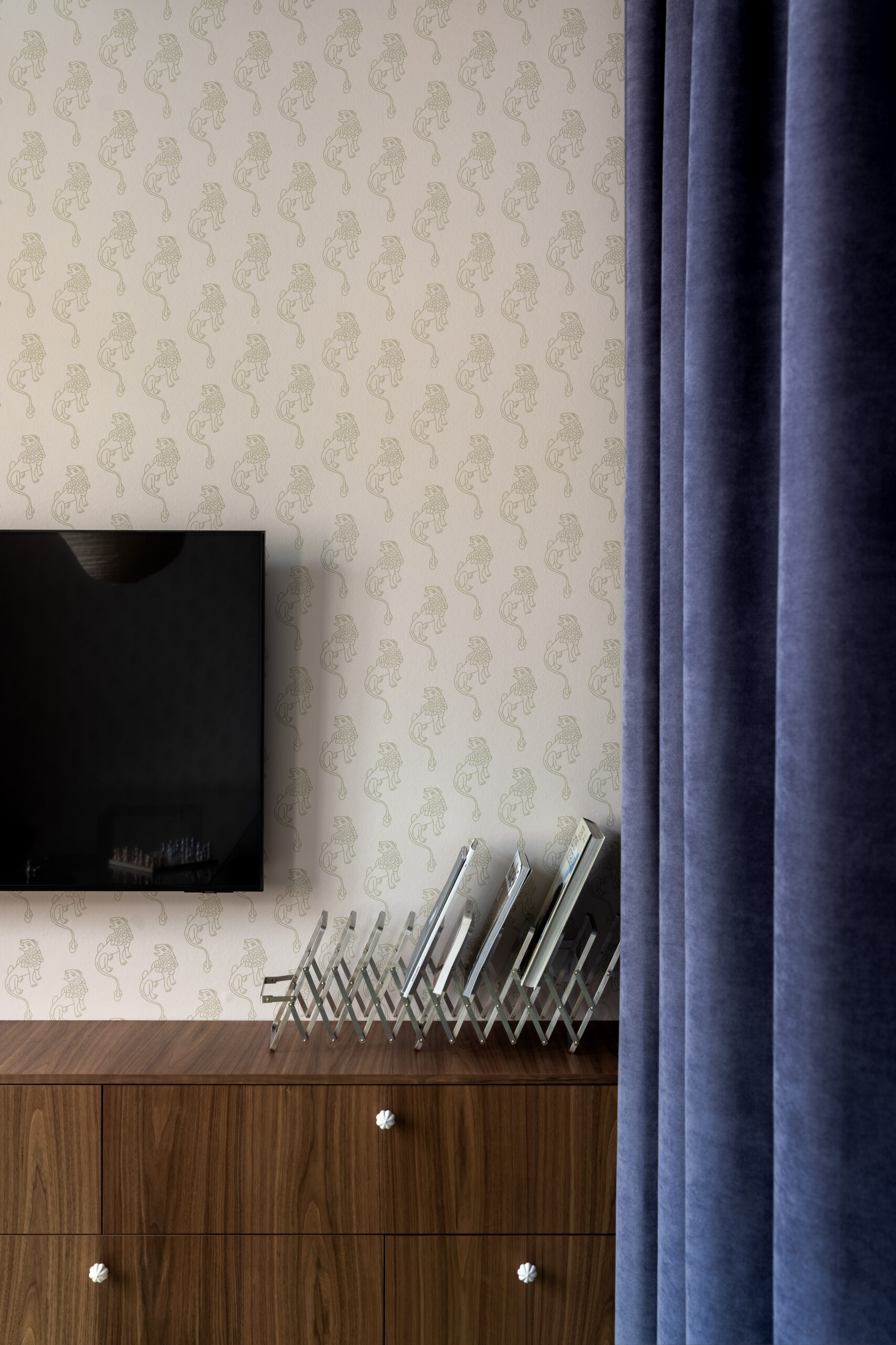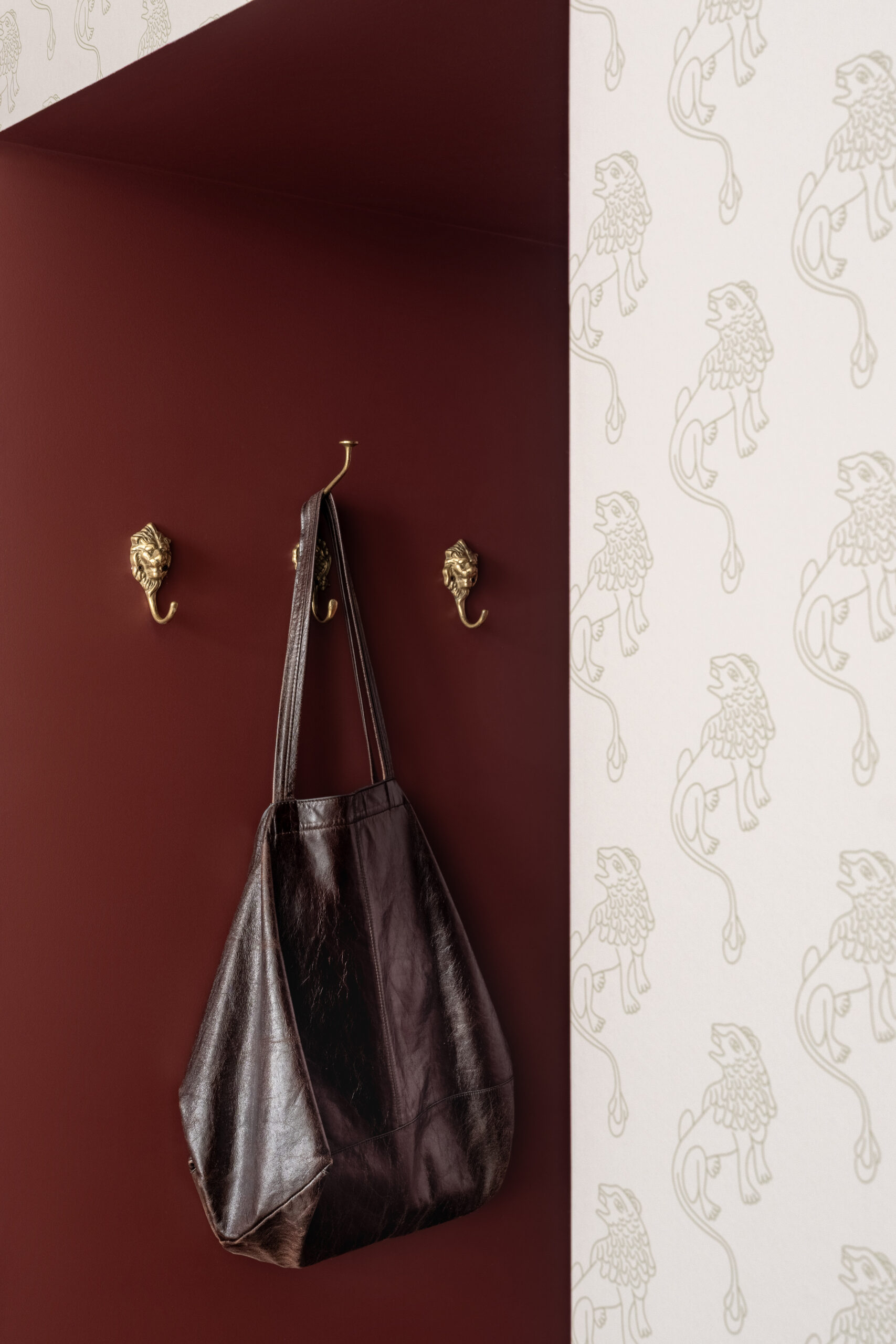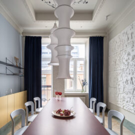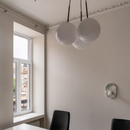 Шпалери фісташкового відтінку з ілюстрацією міфологічного лева були розроблені індивідуально дизайнерами Between the Walls, підкреслюючи єдину сюжетну лінію. Простір поєднує холодні та теплі відтінки, що підкреслюються абажури з японського паперу у формі коконів від Ferm Living, а також індивідуально розробленим столом із металу, мармуру та скла.
