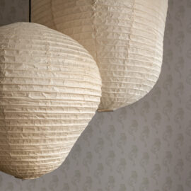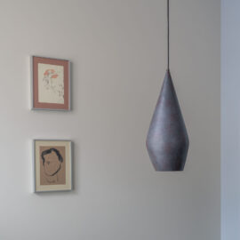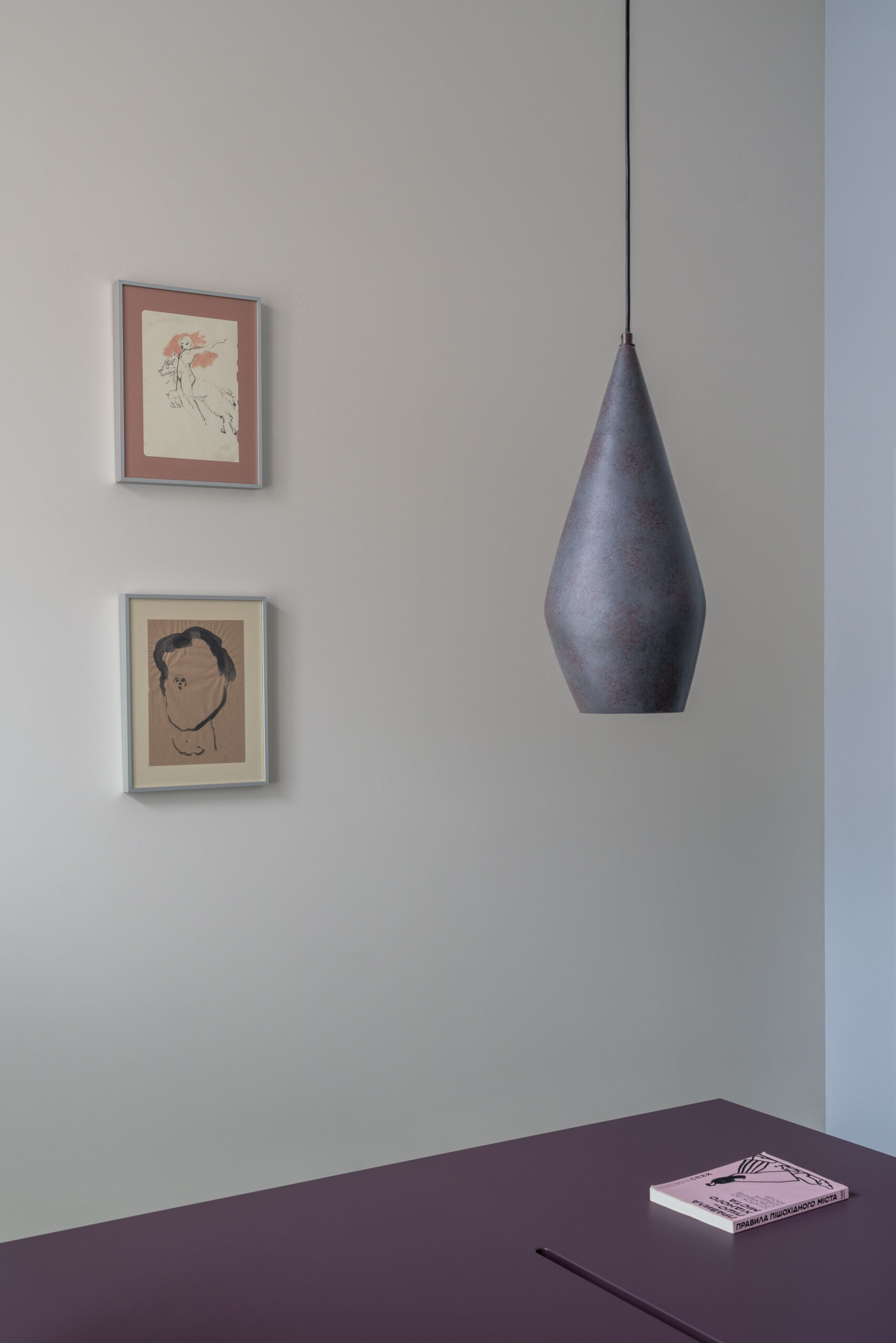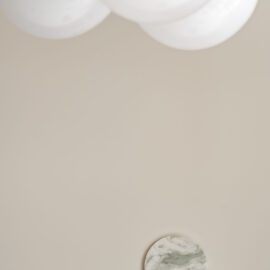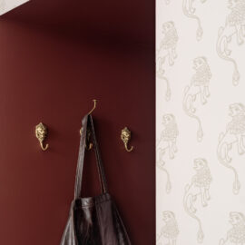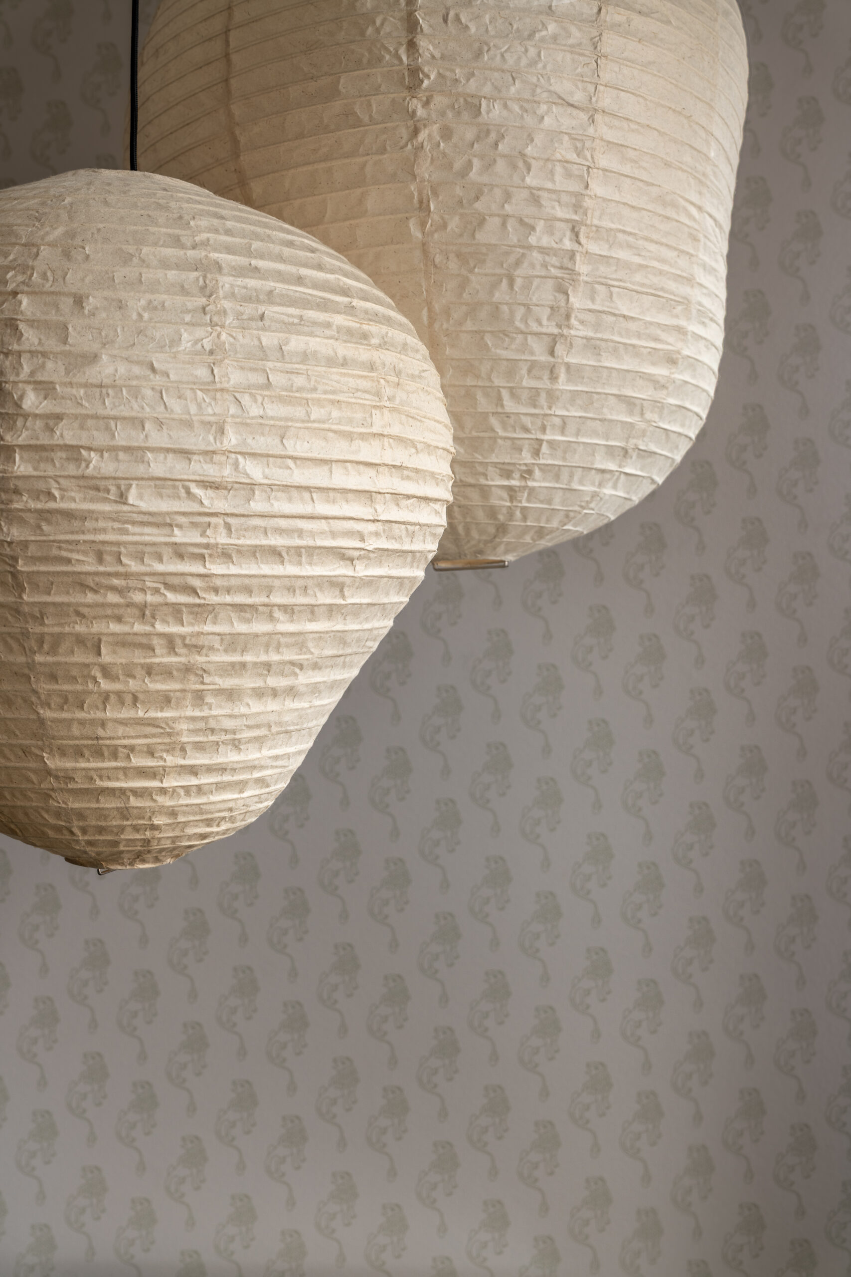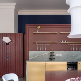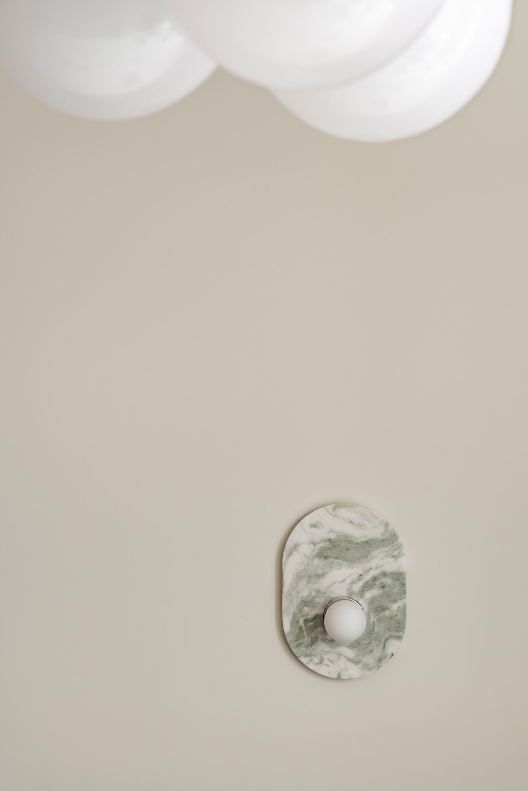 Шпалери фісташкового відтінку з ілюстрацією міфологічного лева були розроблені індивідуально дизайнерами Between the Walls, підкреслюючи єдину сюжетну лінію. Простір поєднує холодні та теплі відтінки, що підкреслюються абажури з японського паперу у формі коконів від Ferm Living, а також індивідуально розробленим столом із металу, мармуру та скла.