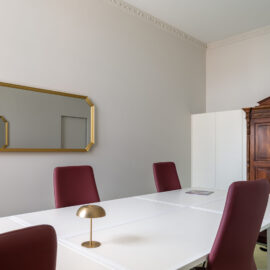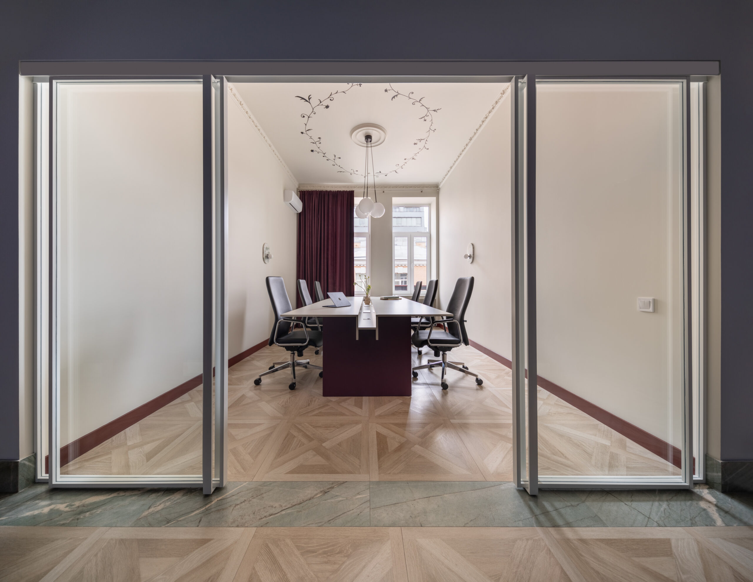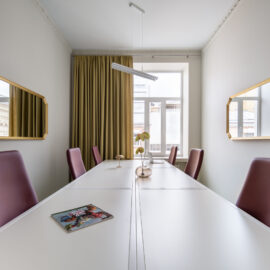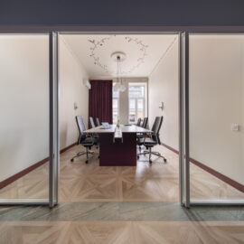 Кімната для переговорів є яскравим прикладом ретельно продуманої акустики та елегантного дизайну. Її шестикутна форма, у поєднанні зі скляними дверима, двошаровими шторами та м’яким ковроліном Forbo, створює приємну атмосферу з чудовим звукопоглинанням.