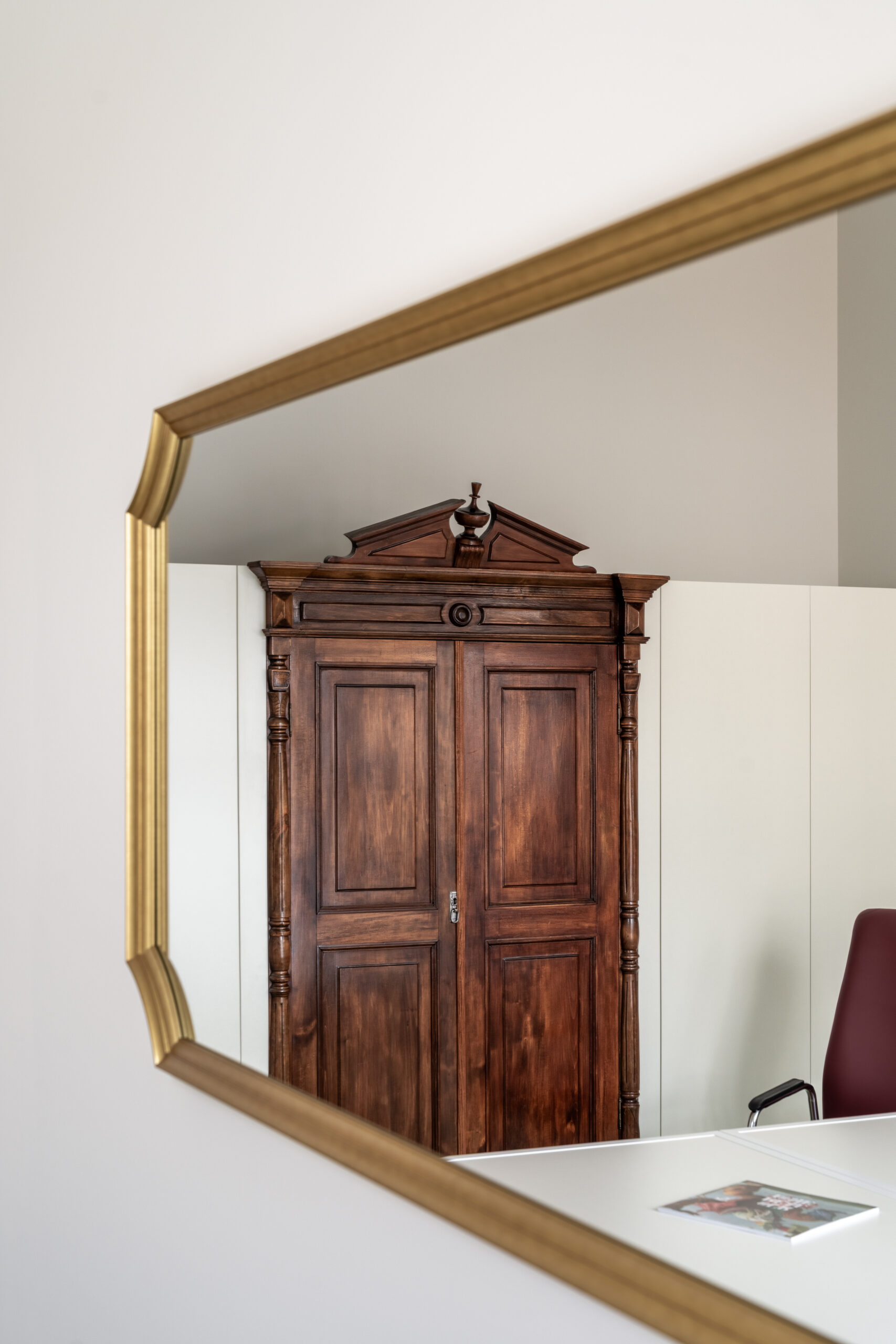 Особливим акцентом у кімнаті стала вінтажна шафа з Одеси — предмет, що задає тон усьому інтер’єру. Дизайнери Between the Walls натрапили на неї випадково, у майже ідеальному стані. Після делікатної реставрації та оновлення внутрішнього наповнення вона набула нової функціональності й сенсу.