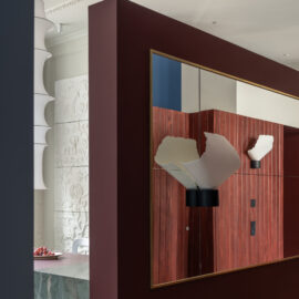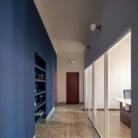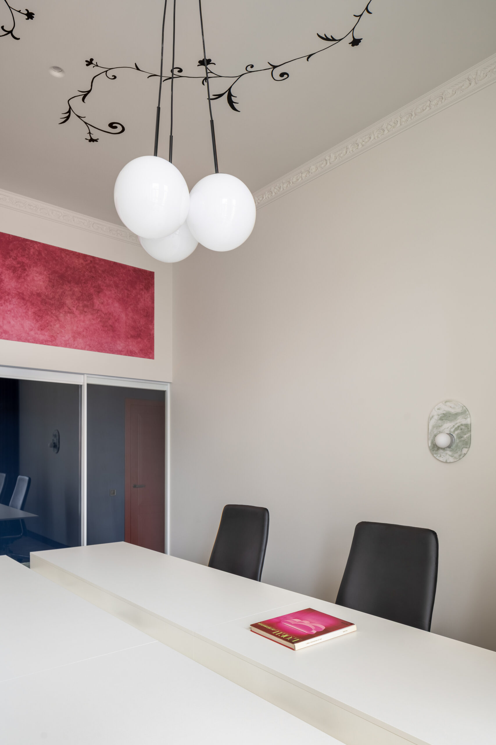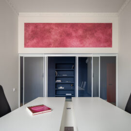 Наступний простір, розташований за скляною перегородкою, вражає сміливими контрастами кутастих та округлих форм. Чорний і червоний кольори створюють серйозну робочу атмосферу, тоді як світлі тони та декоративні мотиви на стелі додають затишку та візуально розвантажують простір. Підлога, обрамлена керамогранітом Imola, кольорово перегукується з мармуровими накладками навколо бра, а світильники зі зеленого мармуру власного дизайну створюють витончену гармонію між кабінетом і загальною зоною. Стіл спроектовано таким чином, щоб мінімізувати візуальний шум та забезпечити ергономічний доступ до розеток.