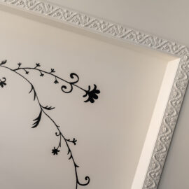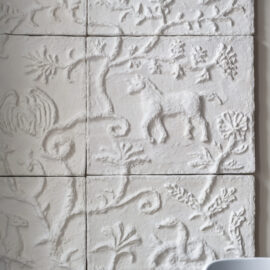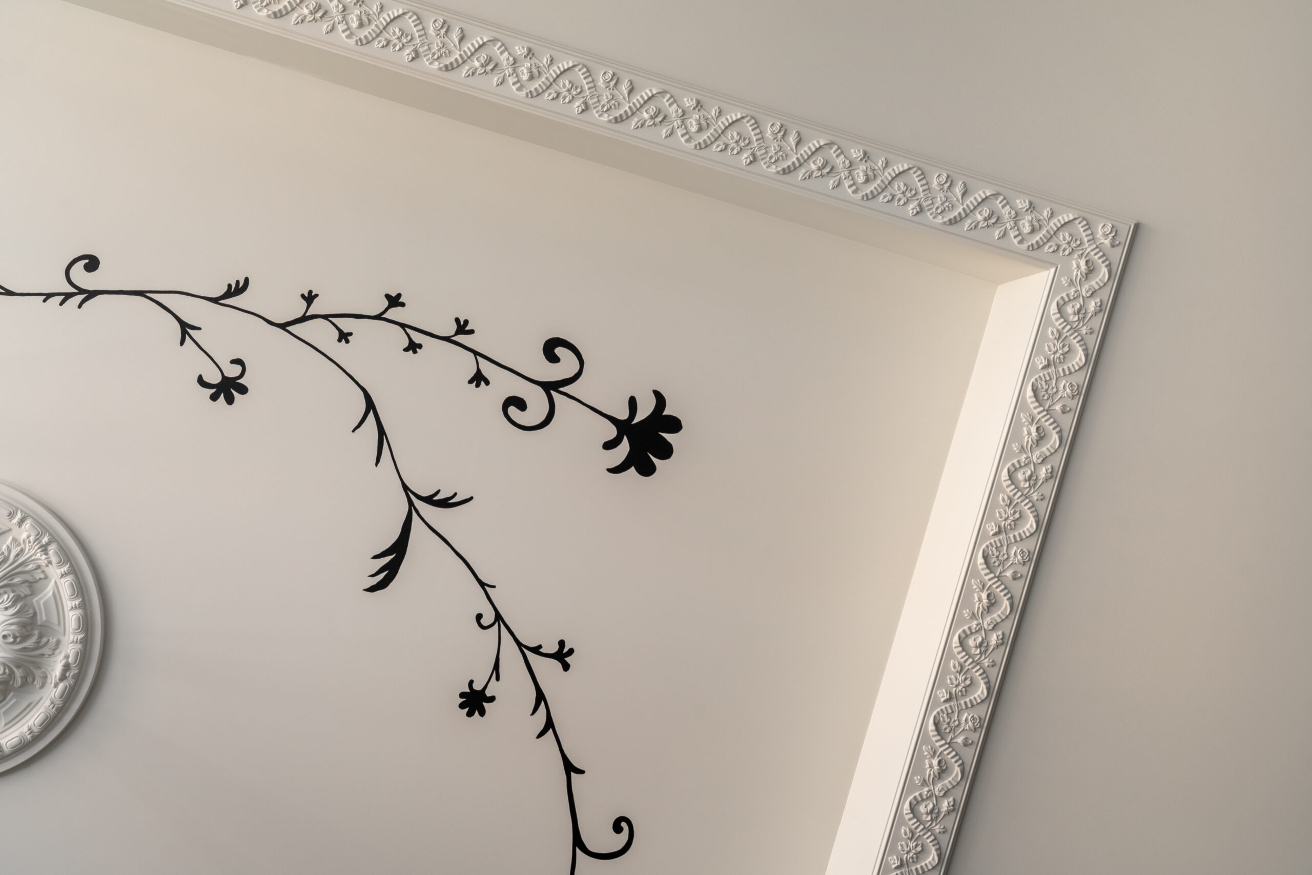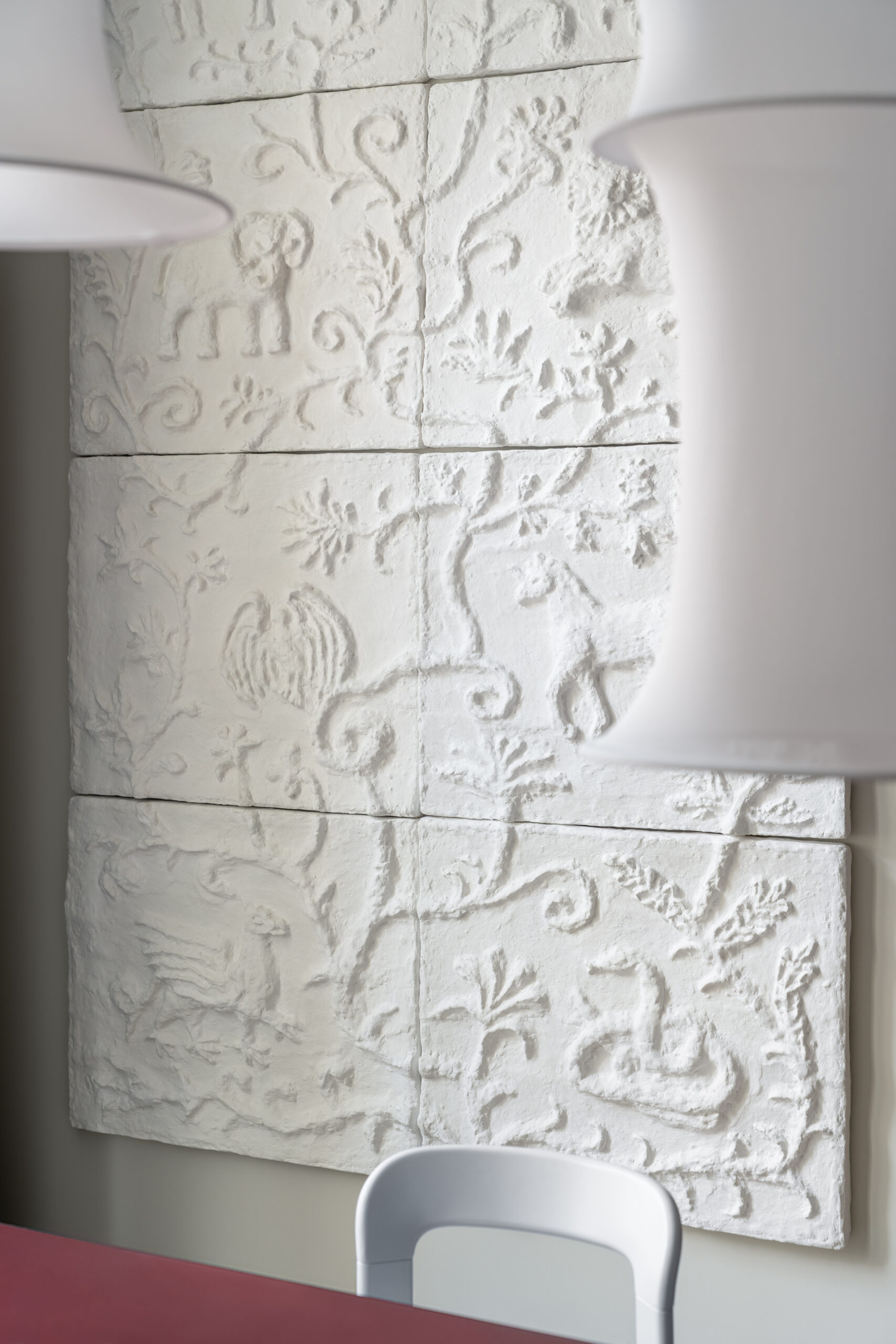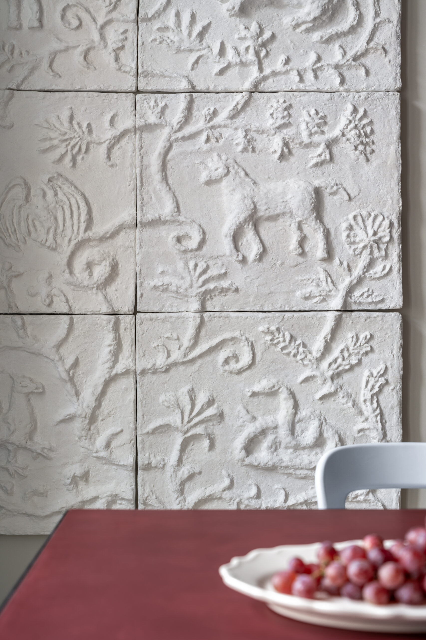 Анастасія створила масштабний барельєф у кухонній зоні із зображенням фантастичних звірів, натхненний міфологічними сюжетами, виконаний із розділених частин з пап’є-маше. Художниця також залишила розписи на стелях в зоні їдальні та робочих кімнатах, що візуально поєднують простір та додають йому легкості. Особливо виділяється настінний розпис під стелею, що імітує стільницю, створюючи діалог між кімнатами.