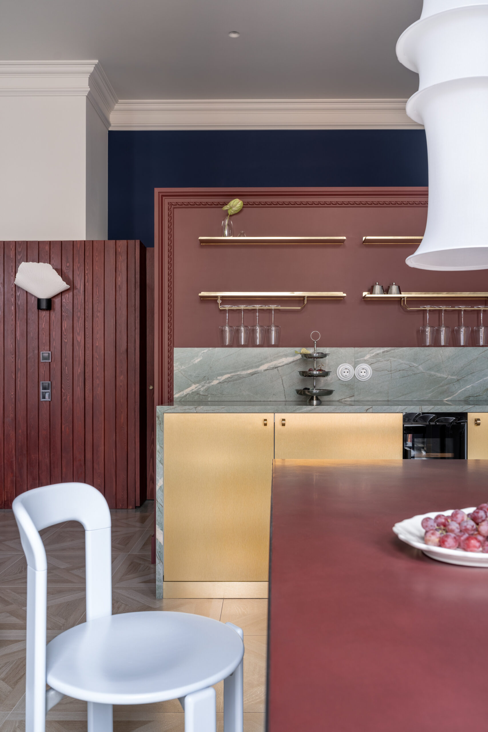 Дизайн також використовує насичені колірні контрасти: бордовий на дерев’яних панелях та перегородці кухонного куточка, поєднаний з евкаліптовим та яскравими синіми відтінками. Ця ретельно підібрана палітра в поєднанні з різноманітними текстурами створює візуально динамічне середовище, що поєднує комфорт із вишуканою елегантністю.