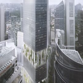 В 51-этажной башне площадью 93 000 кв. метра, которую возведут на месте бывшей автостоянки, будут размещены офисы премиум-класса, жилые апартаменты и торговые пространства. Здание будет выделяться из существующей застройки – архитекторы предусмотрели вертикальное озеленение фасадов.