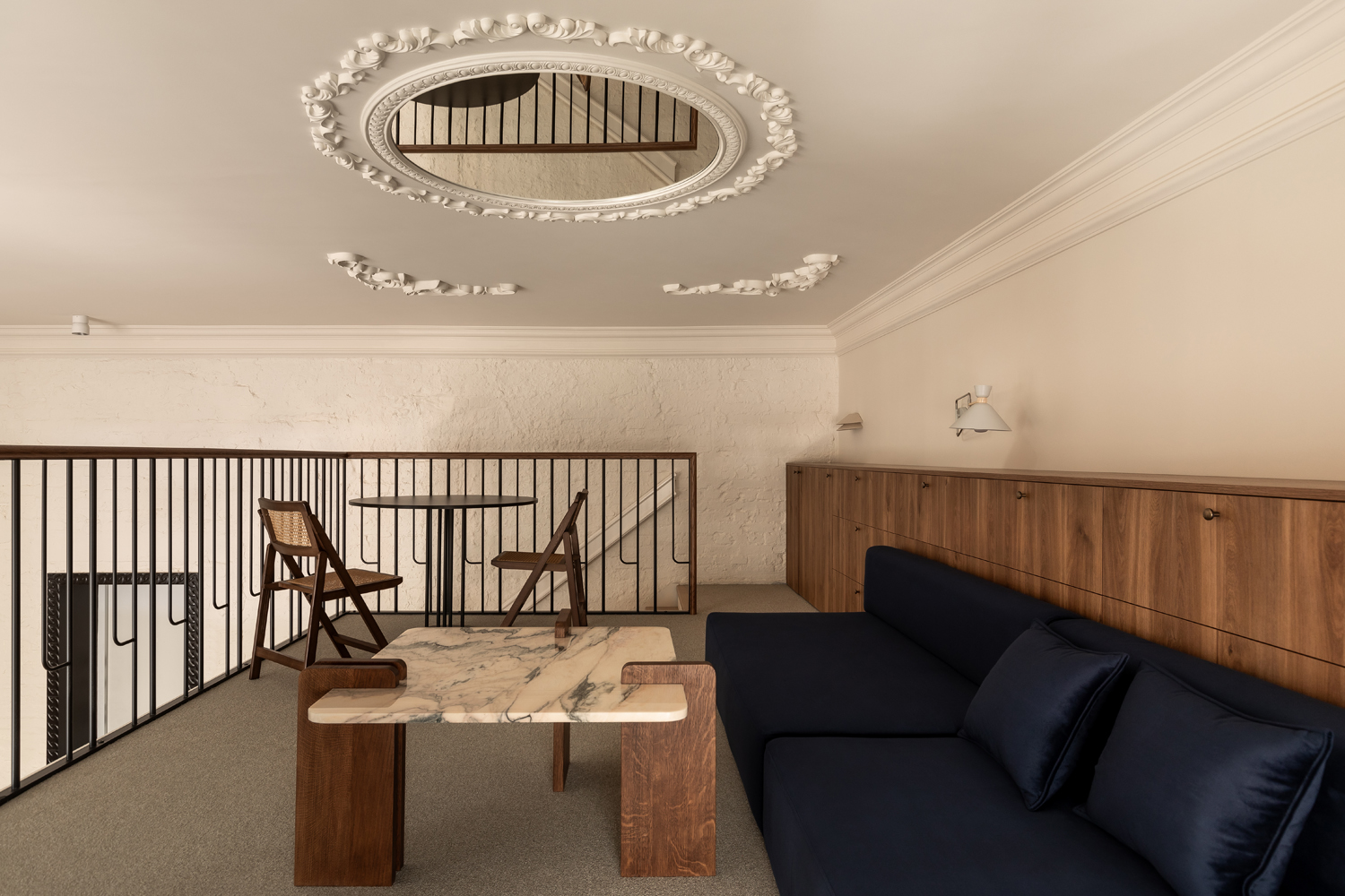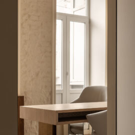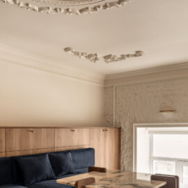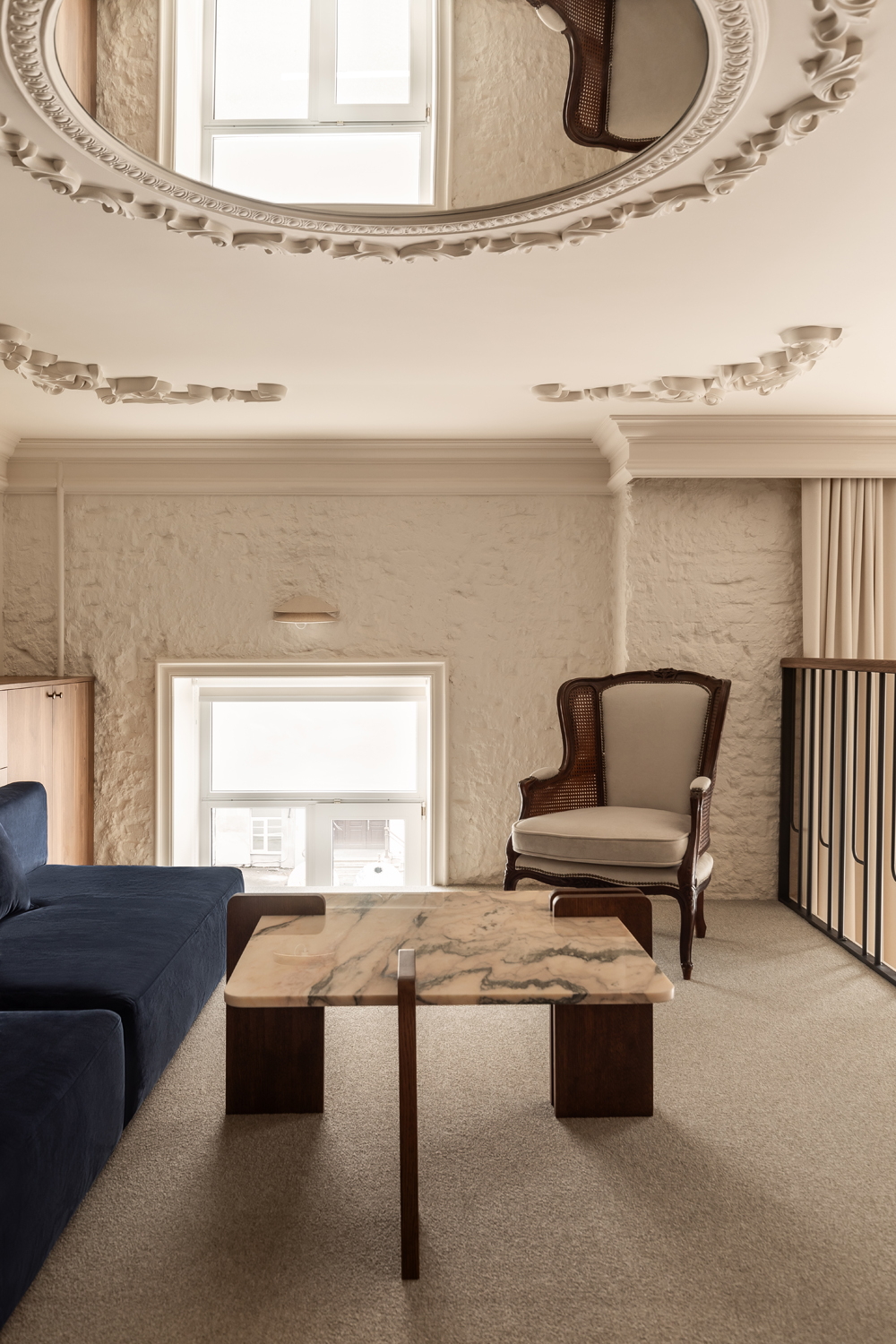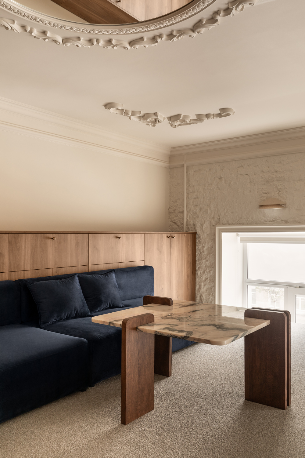 Матеріальна палітра свідомо уникає прямого цитування декоративних елементів фасаду – жодного буквального перенесення готичних мотивів всередину. Натомість Between the Walls обрали мову тонших відповідностей: естетика Quiet Luxury з її молочними і бежевими відтінками, акцентним синім і глибоким темним деревом.