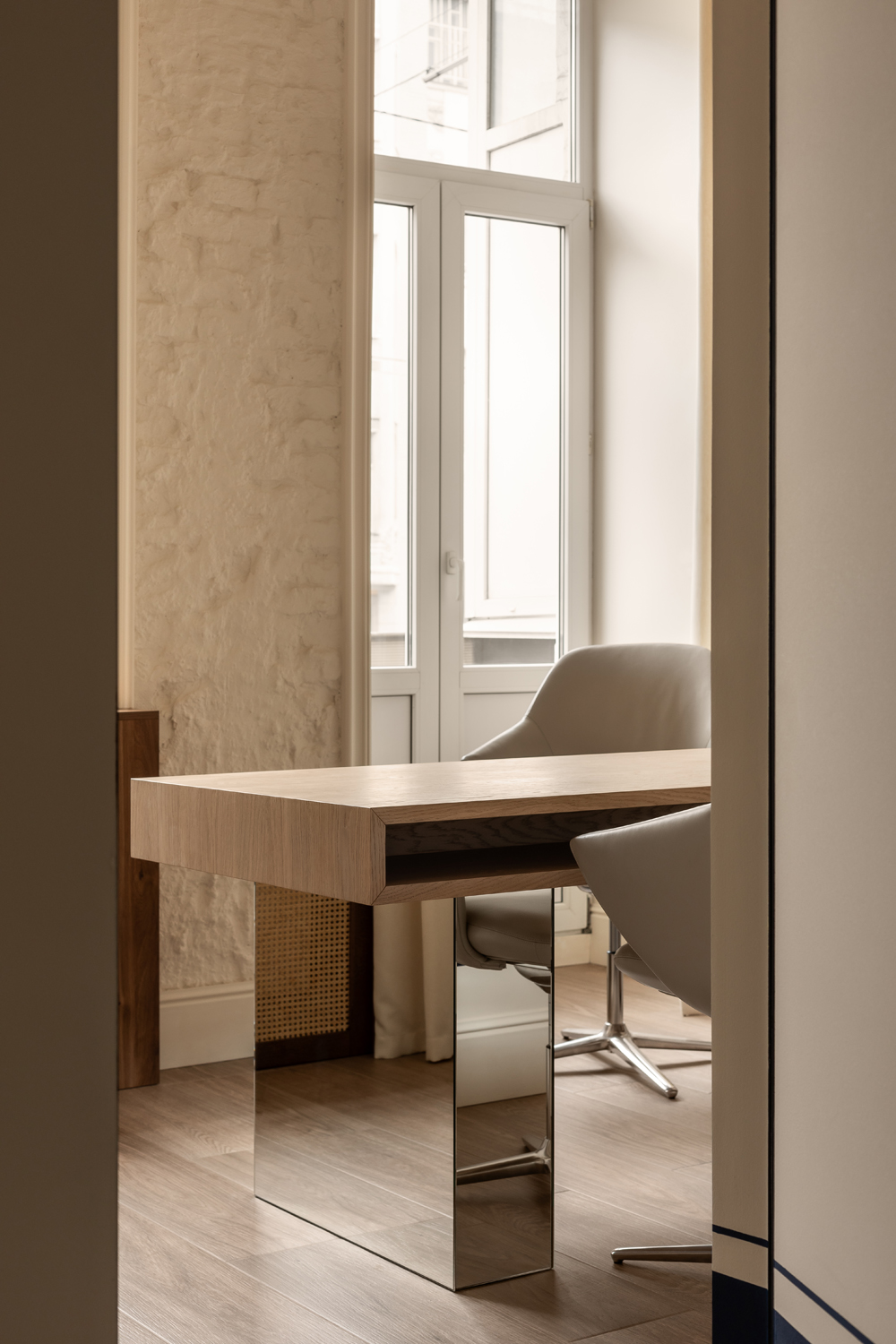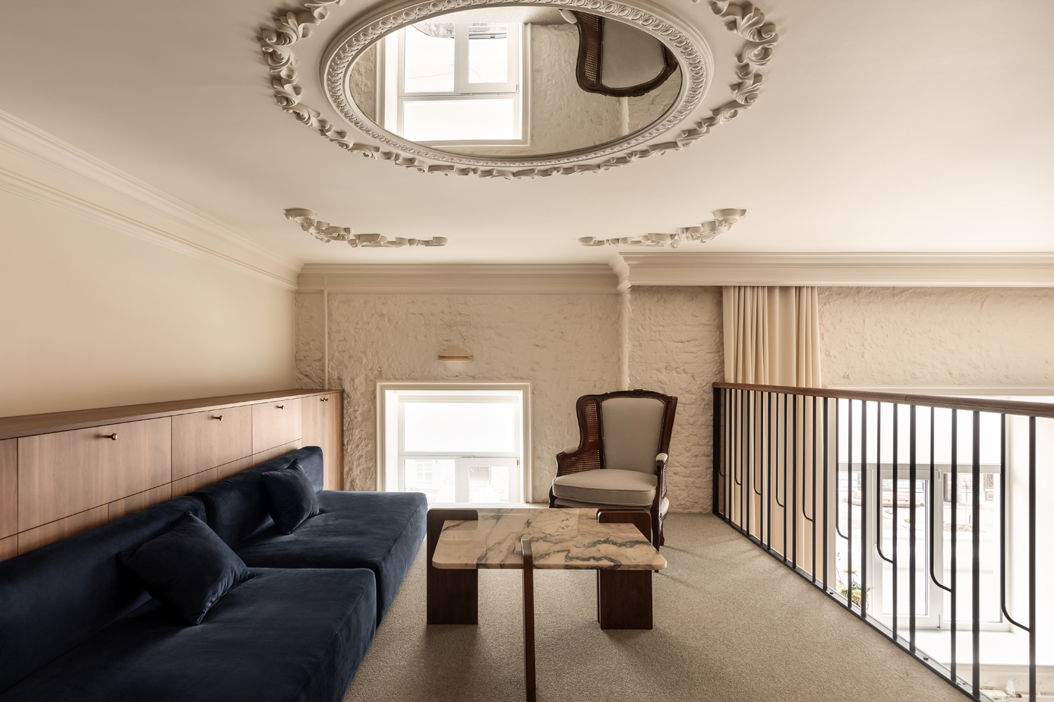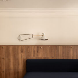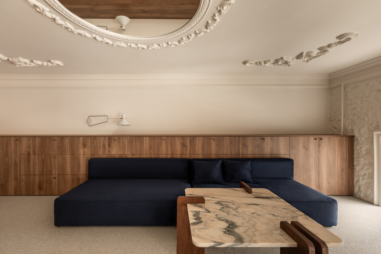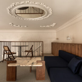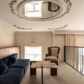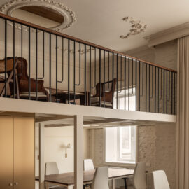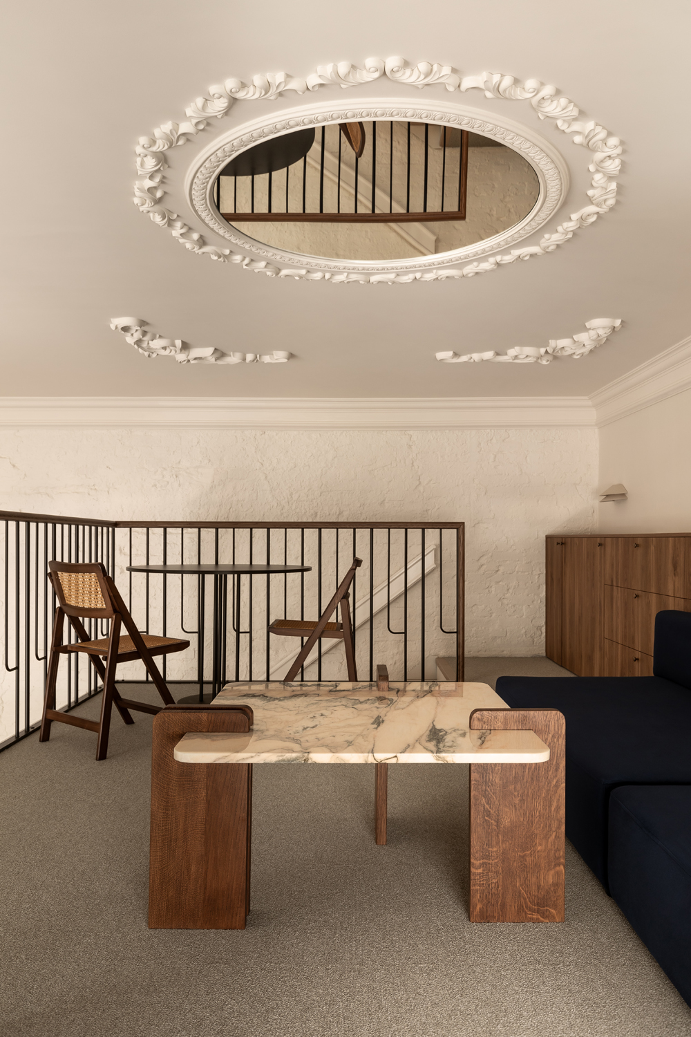 Матеріальна палітра свідомо уникає прямого цитування декоративних елементів фасаду – жодного буквального перенесення готичних мотивів всередину. Натомість Between the Walls обрали мову тонших відповідностей: естетика Quiet Luxury з її молочними і бежевими відтінками, акцентним синім і глибоким темним деревом.