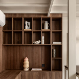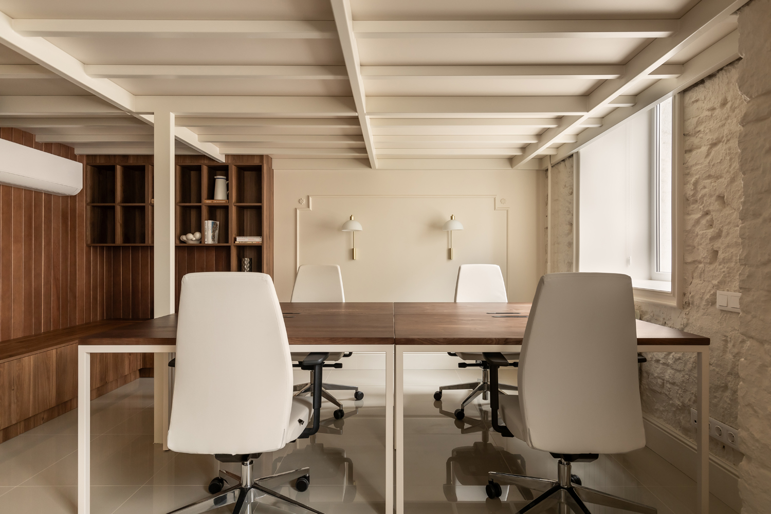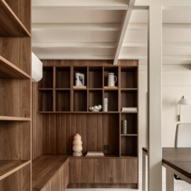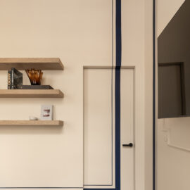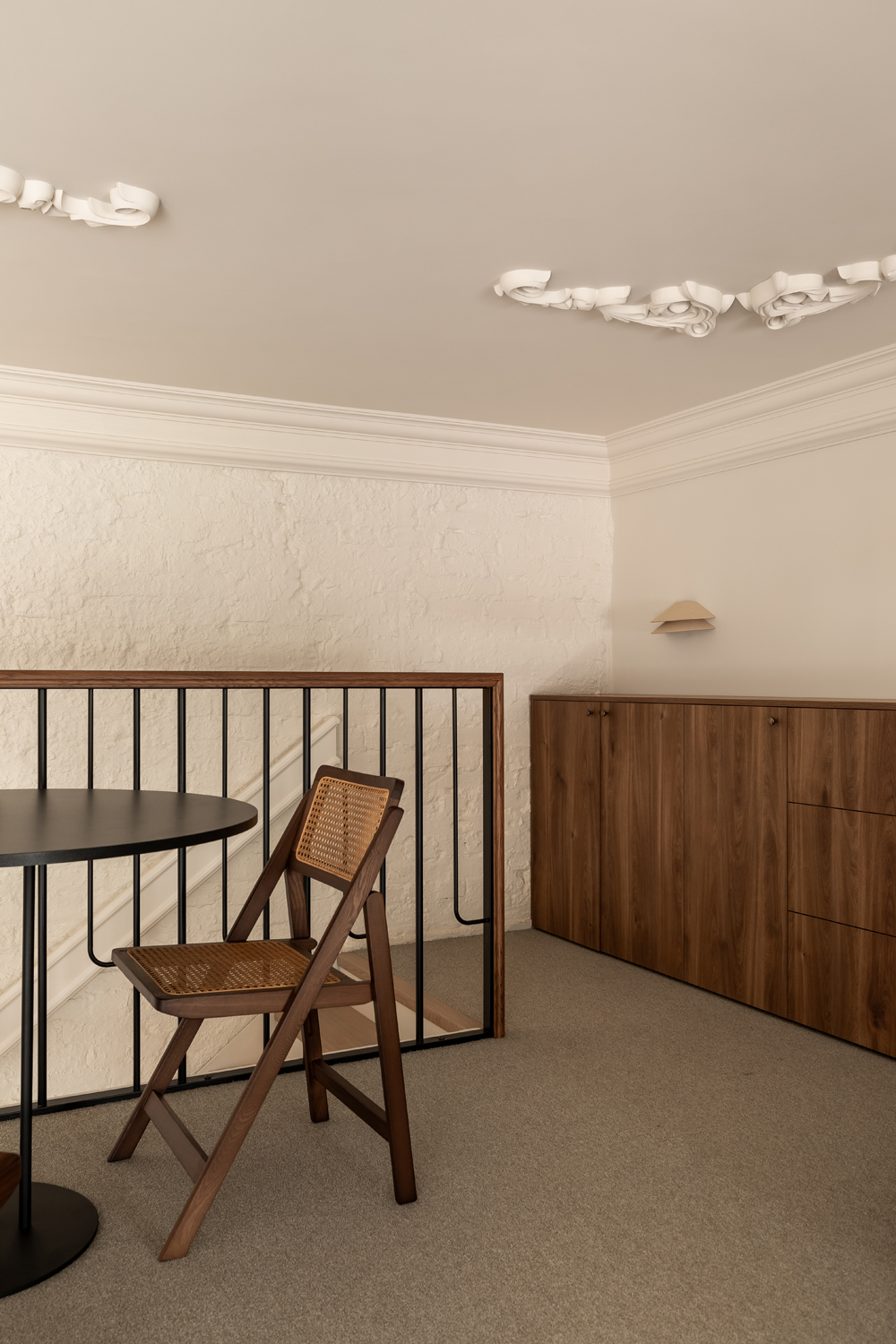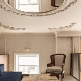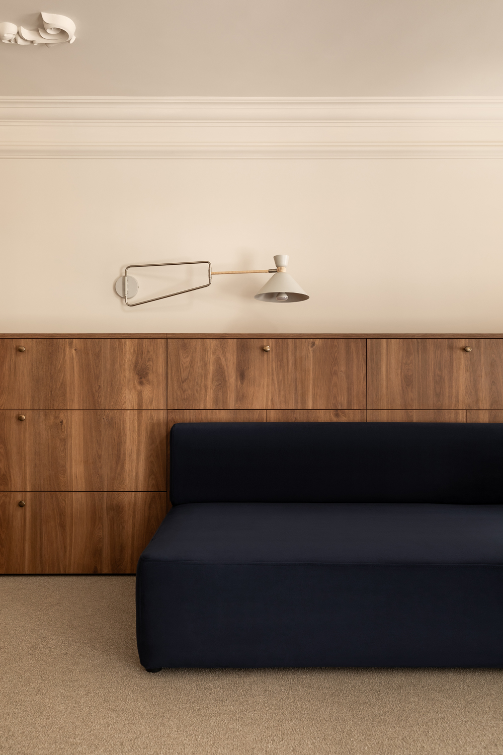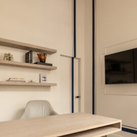 Матеріальна палітра свідомо уникає прямого цитування декоративних елементів фасаду – жодного буквального перенесення готичних мотивів всередину. Натомість Between the Walls обрали мову тонших відповідностей: естетика Quiet Luxury з її молочними і бежевими відтінками, акцентним синім і глибоким темним деревом.