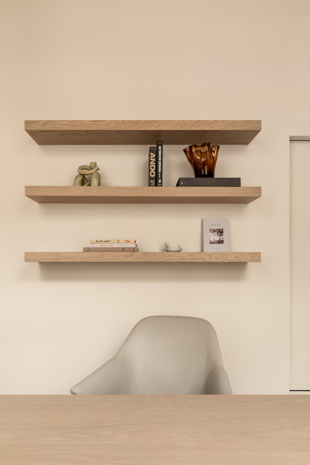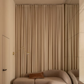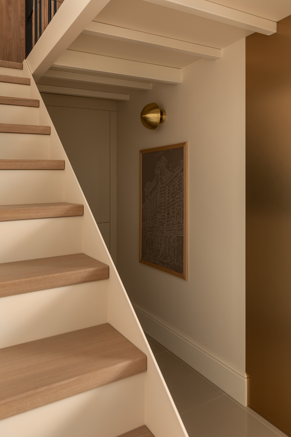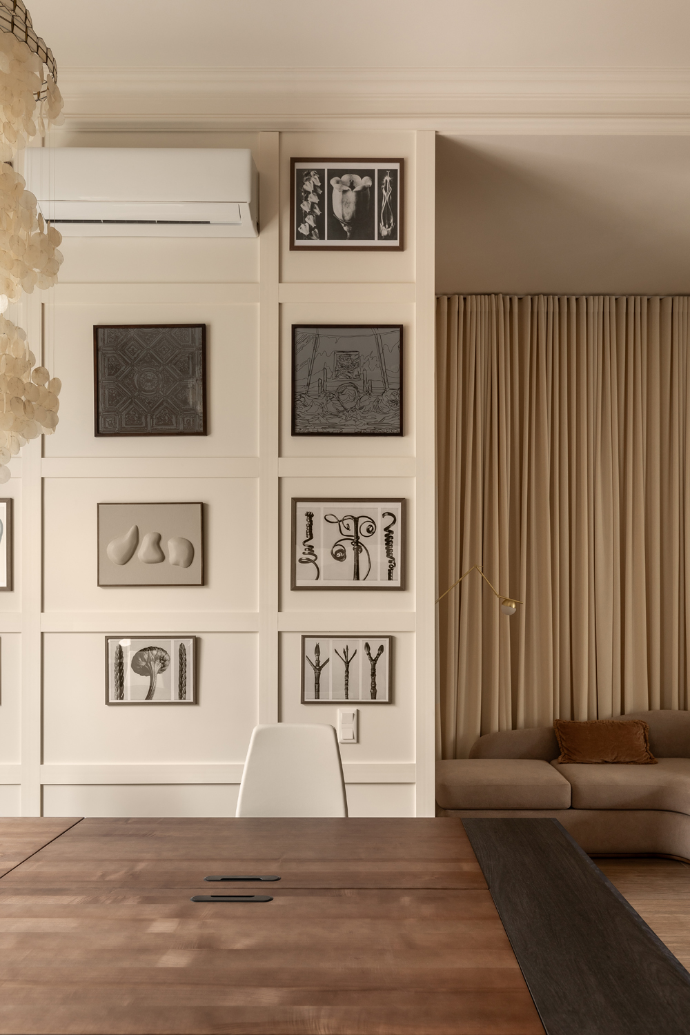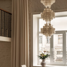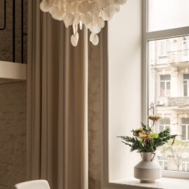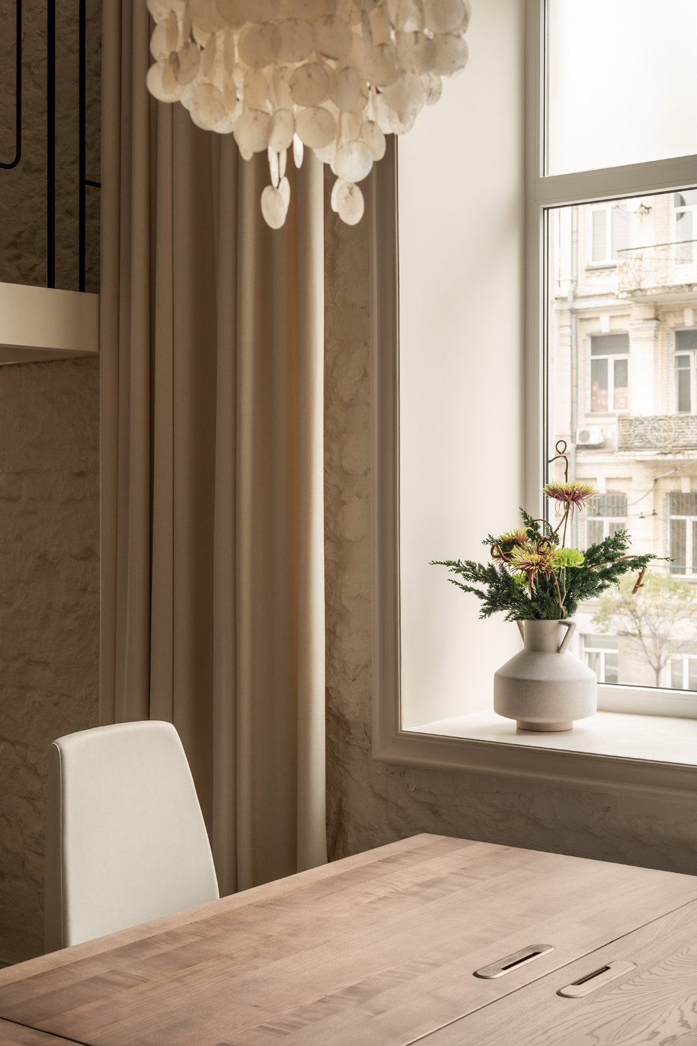 Але за цим вибором стоїть і конкретна спостережливість. Молочний колір – не просто тональне рішення: він проглядається з вікна, у фасаді сусіднього будинку, і саме звідти його було «знято» і перенесено всередину. Так інтер’єр продовжує архітектурний контекст вулиці, не повторюючи його, але усуваючи конфлікт між зовнішнім і внутрішнім і перетворюючи їх на одну неперервну розмову.