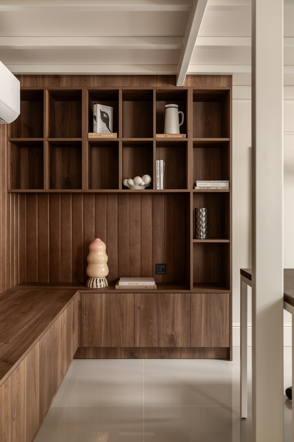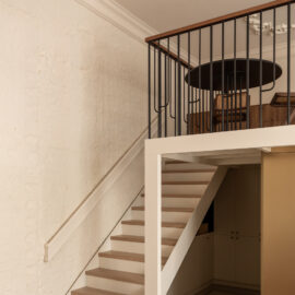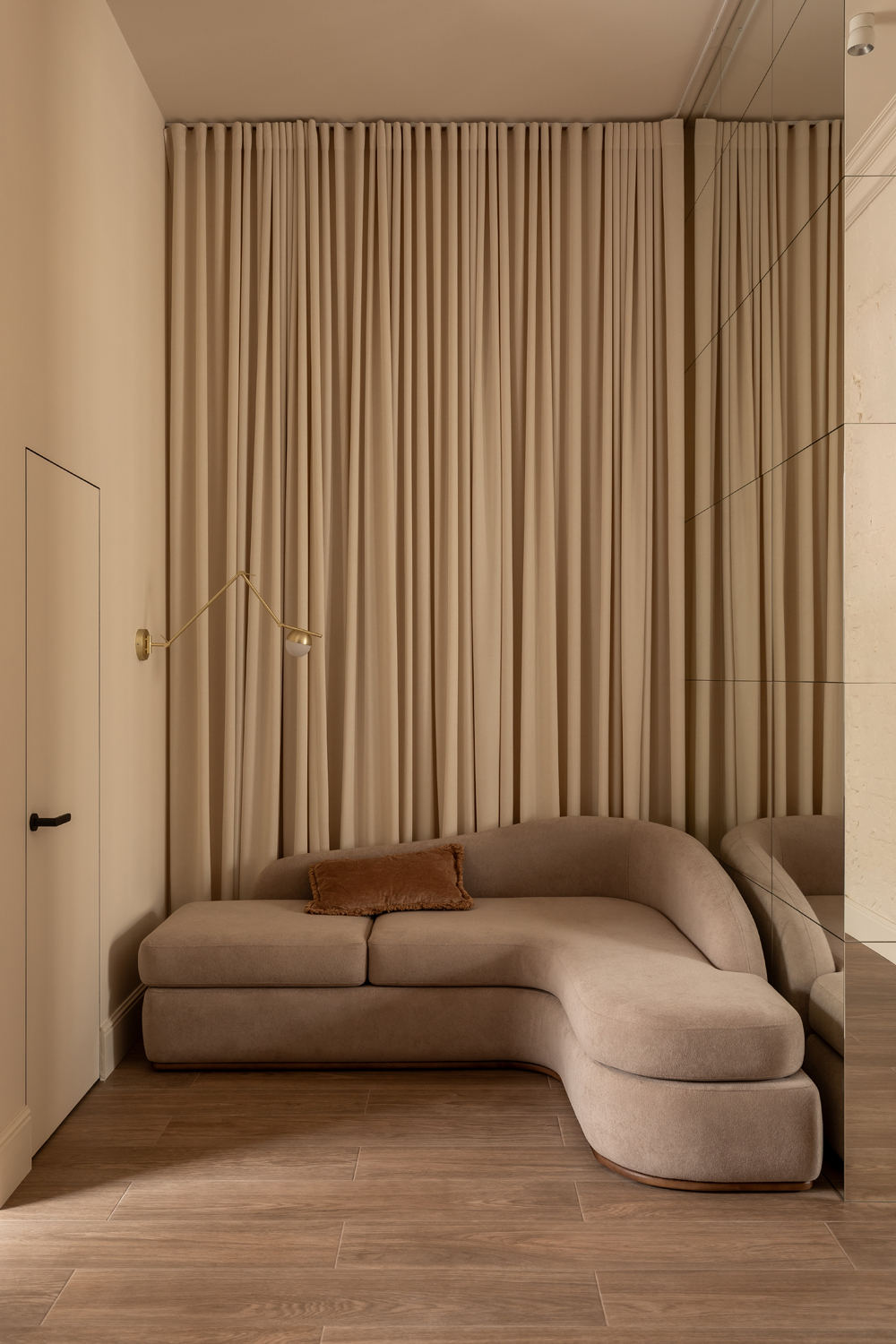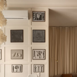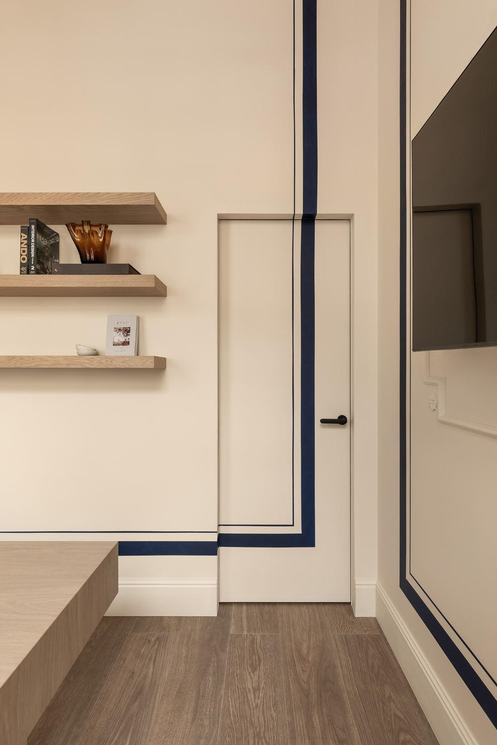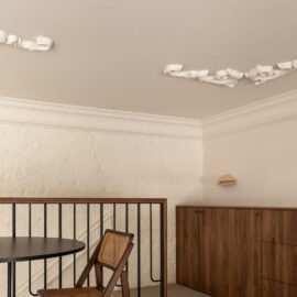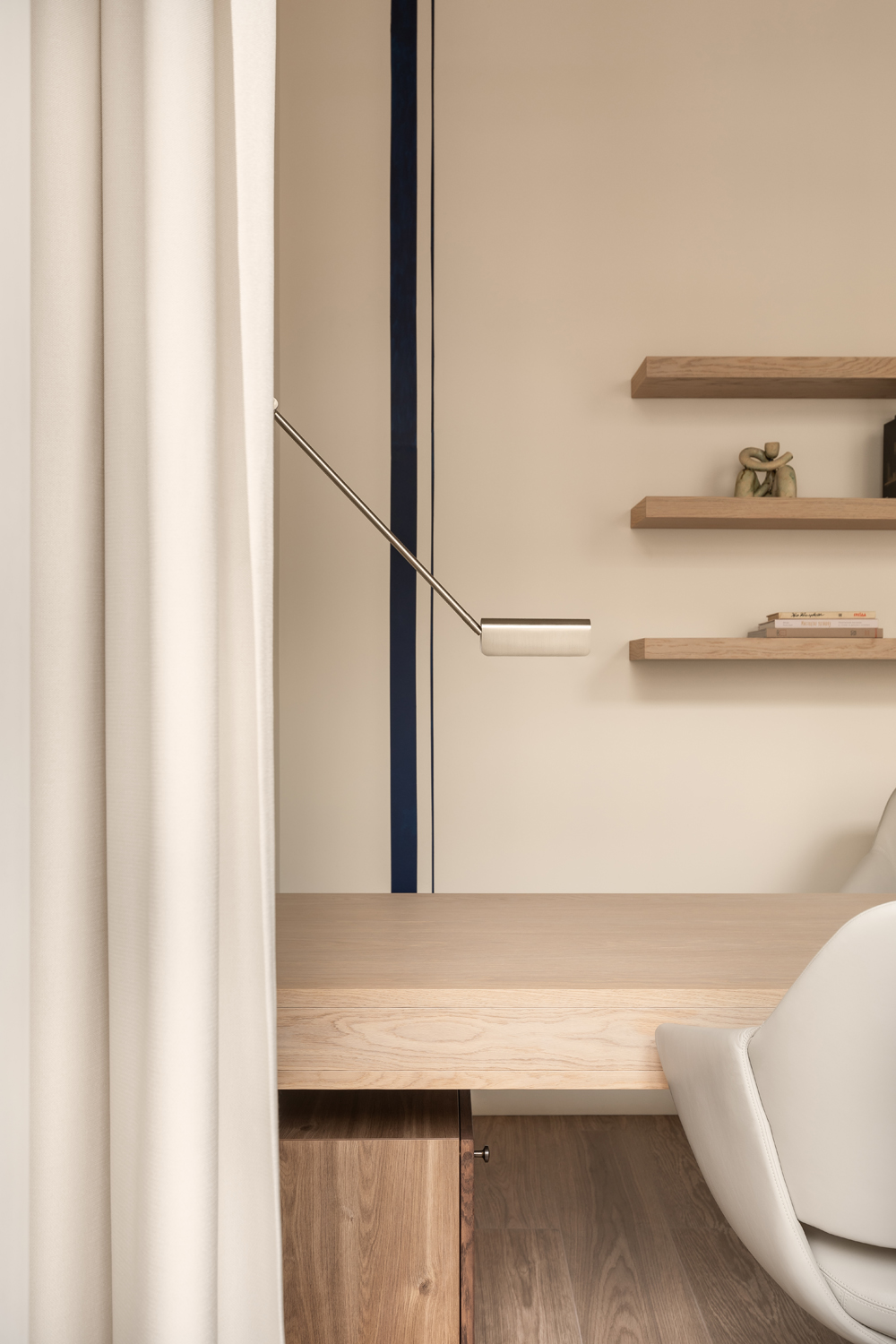 Але за цим вибором стоїть і конкретна спостережливість. Молочний колір – не просто тональне рішення: він проглядається з вікна, у фасаді сусіднього будинку, і саме звідти його було «знято» і перенесено всередину. Так інтер’єр продовжує архітектурний контекст вулиці, не повторюючи його, але усуваючи конфлікт між зовнішнім і внутрішнім і перетворюючи їх на одну неперервну розмову.