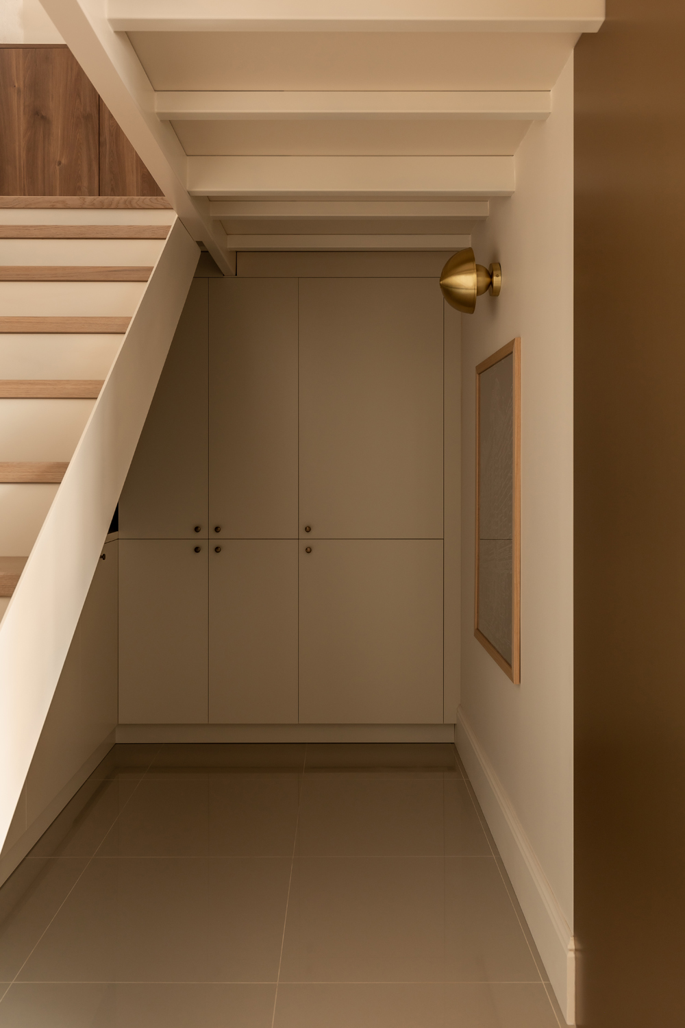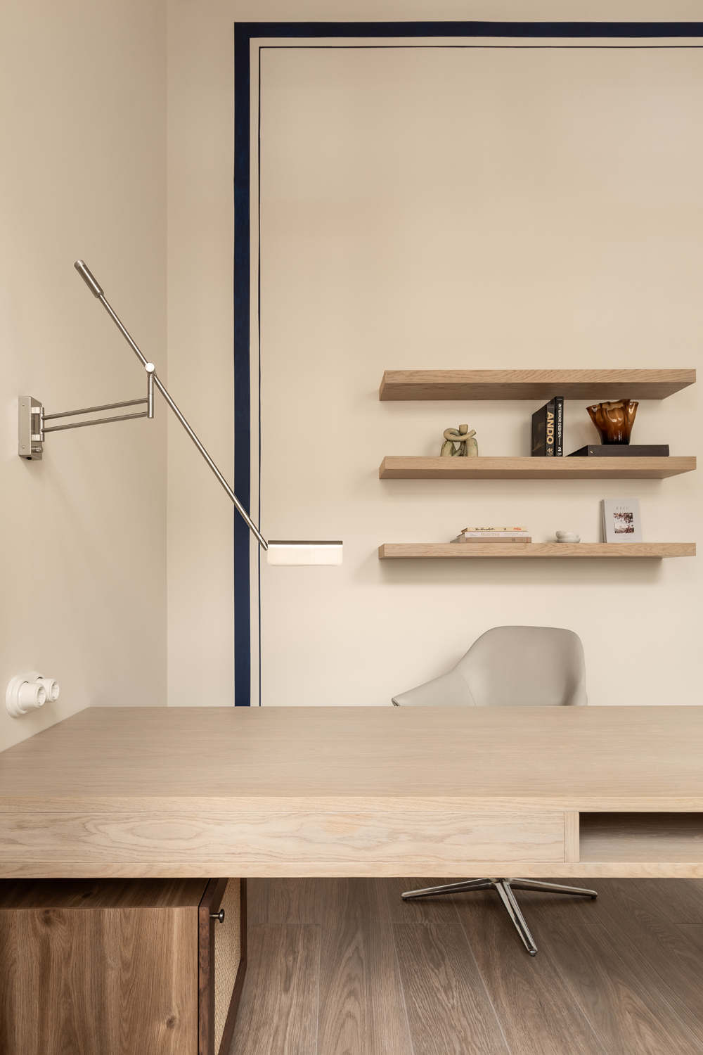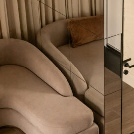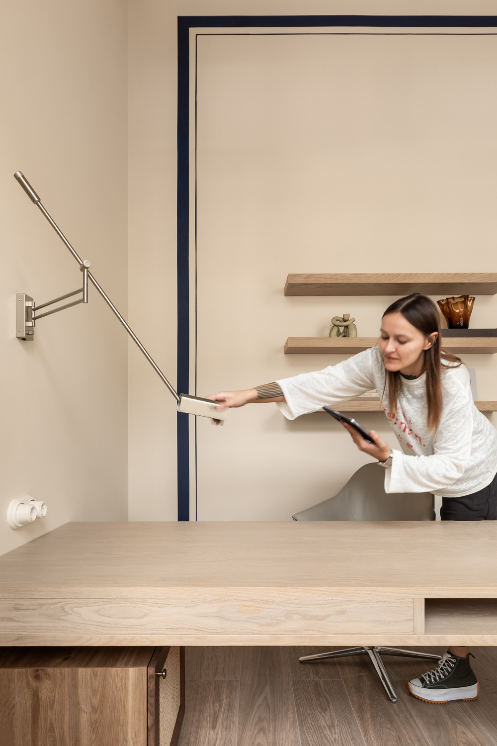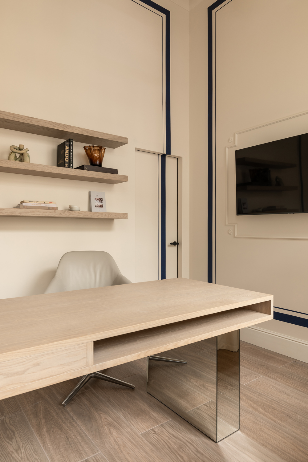 Але за цим вибором стоїть і конкретна спостережливість. Молочний колір – не просто тональне рішення: він проглядається з вікна, у фасаді сусіднього будинку, і саме звідти його було «знято» і перенесено всередину. Так інтер’єр продовжує архітектурний контекст вулиці, не повторюючи його, але усуваючи конфлікт між зовнішнім і внутрішнім і перетворюючи їх на одну неперервну розмову.