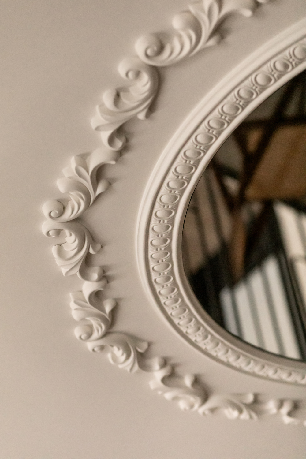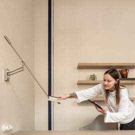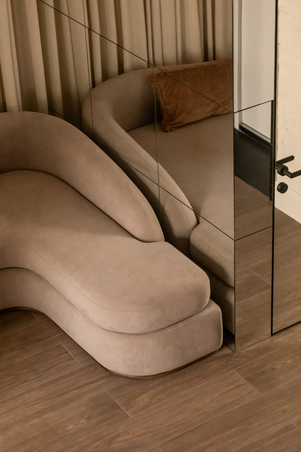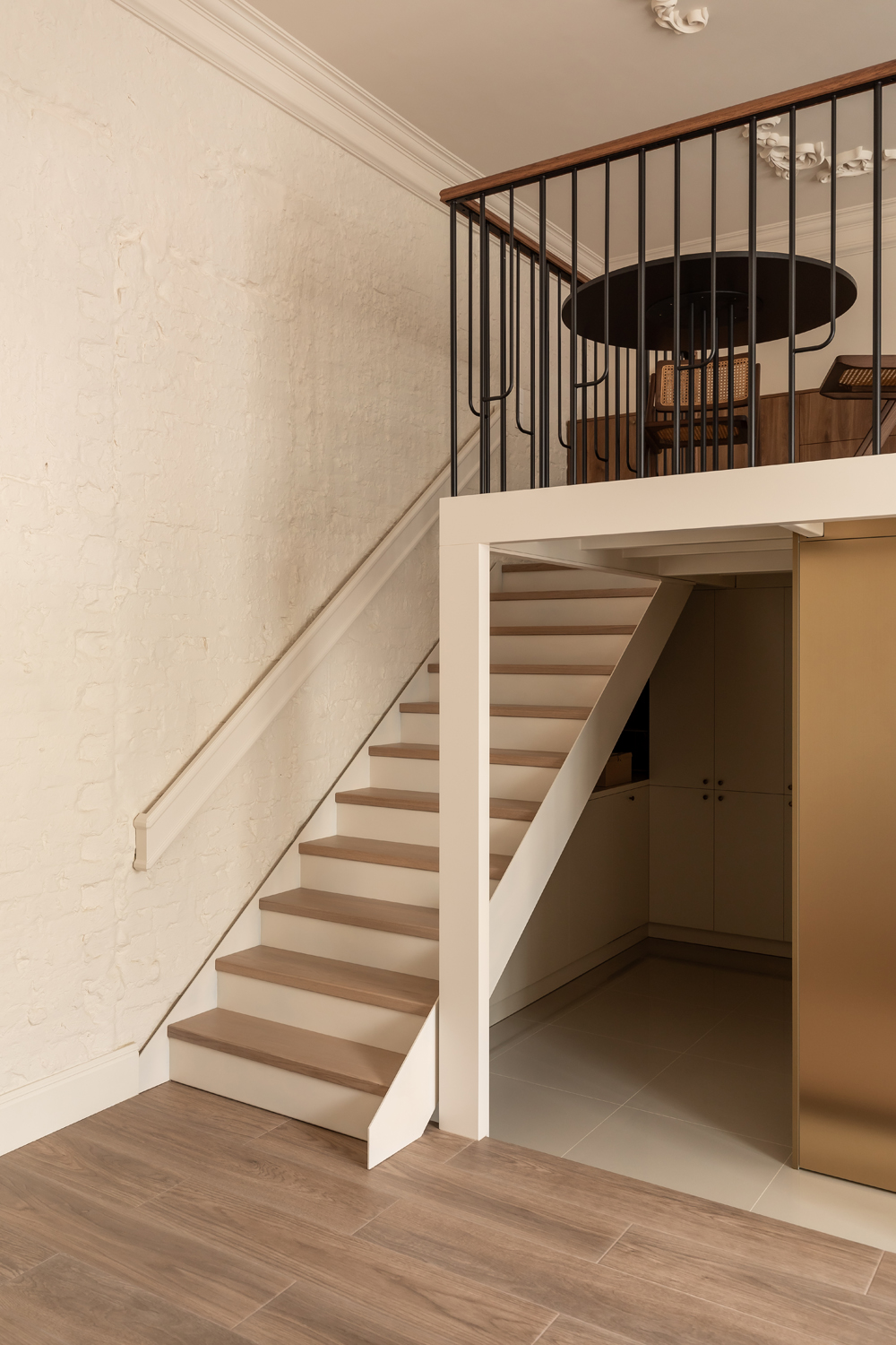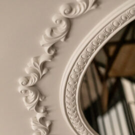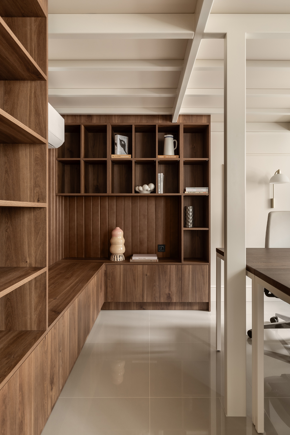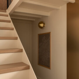 Але за цим вибором стоїть і конкретна спостережливість. Молочний колір – не просто тональне рішення: він проглядається з вікна, у фасаді сусіднього будинку, і саме звідти його було «знято» і перенесено всередину. Так інтер’єр продовжує архітектурний контекст вулиці, не повторюючи його, але усуваючи конфлікт між зовнішнім і внутрішнім і перетворюючи їх на одну неперервну розмову.