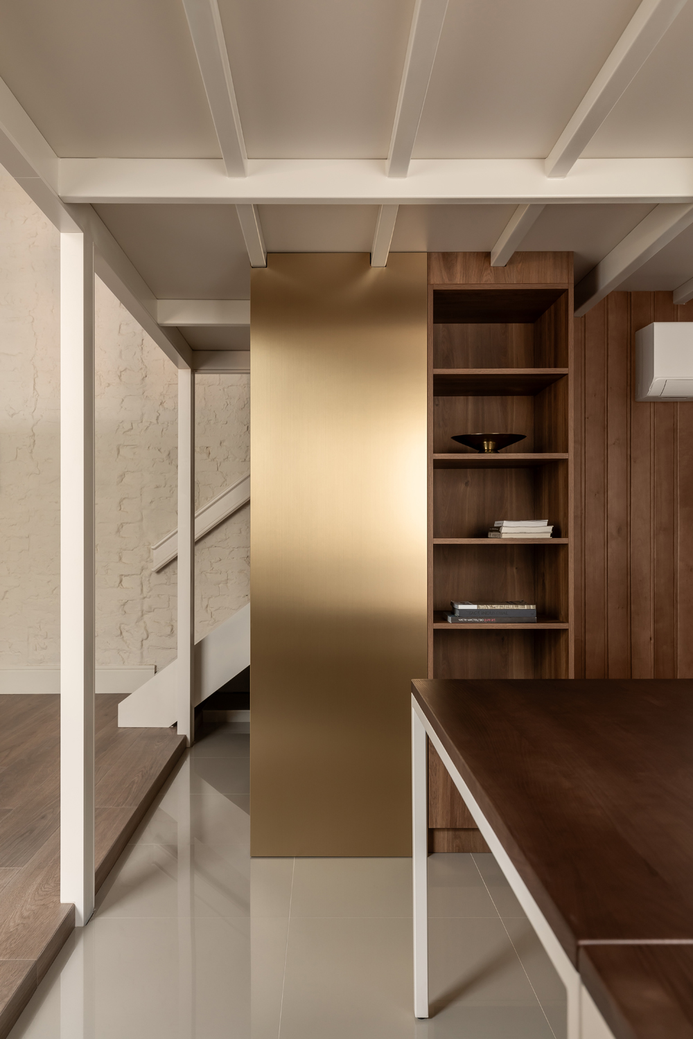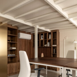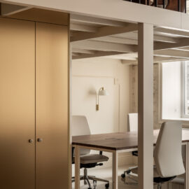 Функціональне ядро офісу приховане в деталях. Кухонний блок інтегрований у нішу під сходами та оздоблений золотою ламінацією, а санвузол замаскований за допомогою дзеркальних панелей, що створюють ефект «невидимого куба». Гнучкість простору забезпечується модульною системою меблів та прихованим проекційним обладнанням: за допомогою текстильної перегородки робоча зона легко трансформується у простір для презентацій та подій.