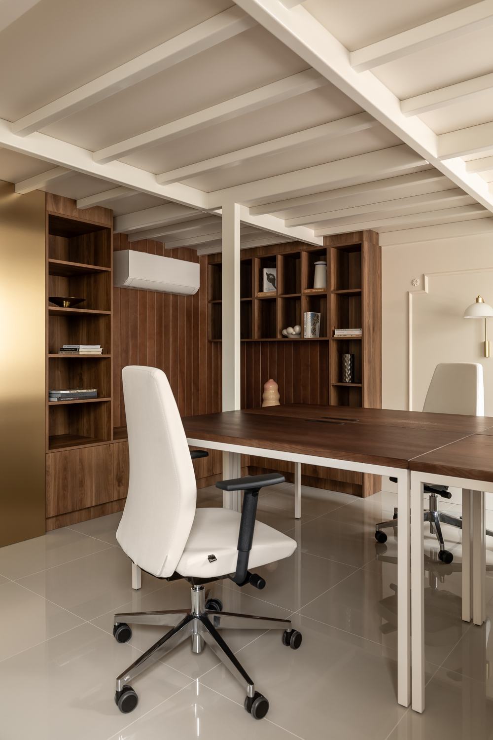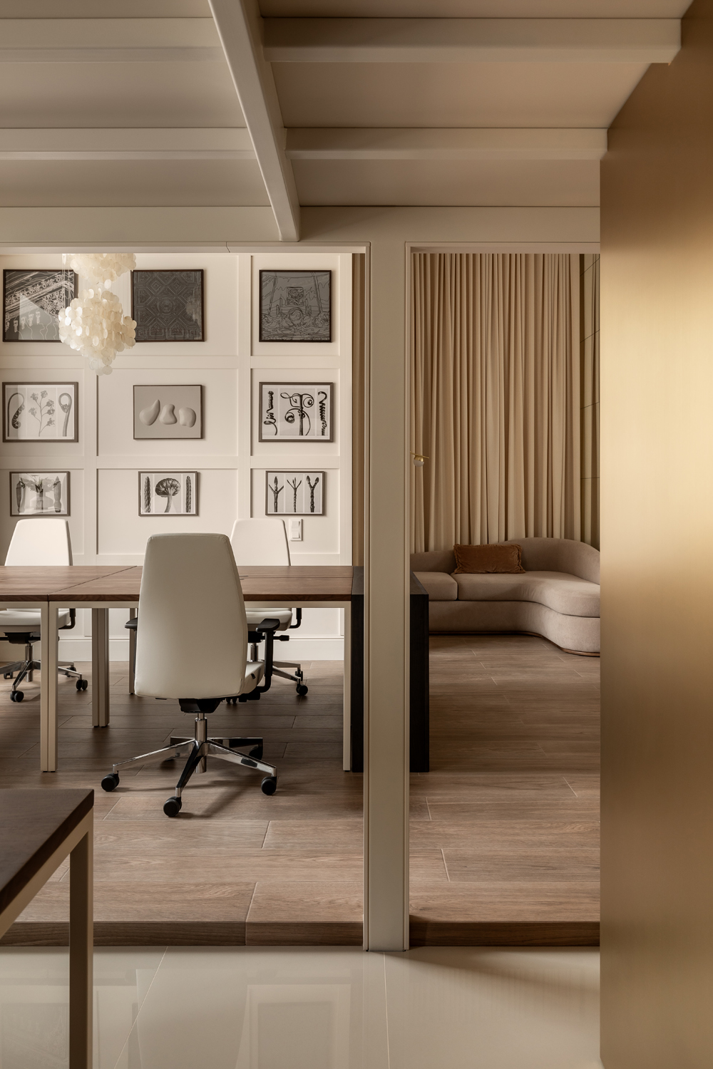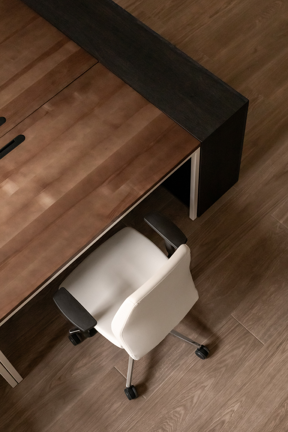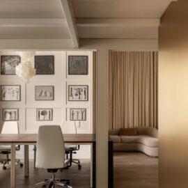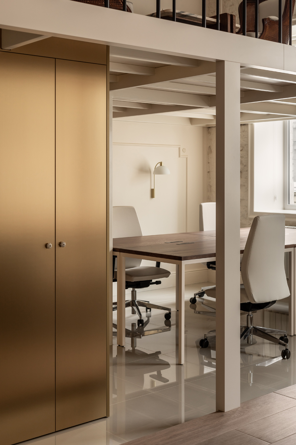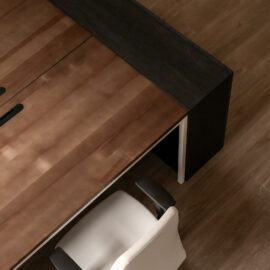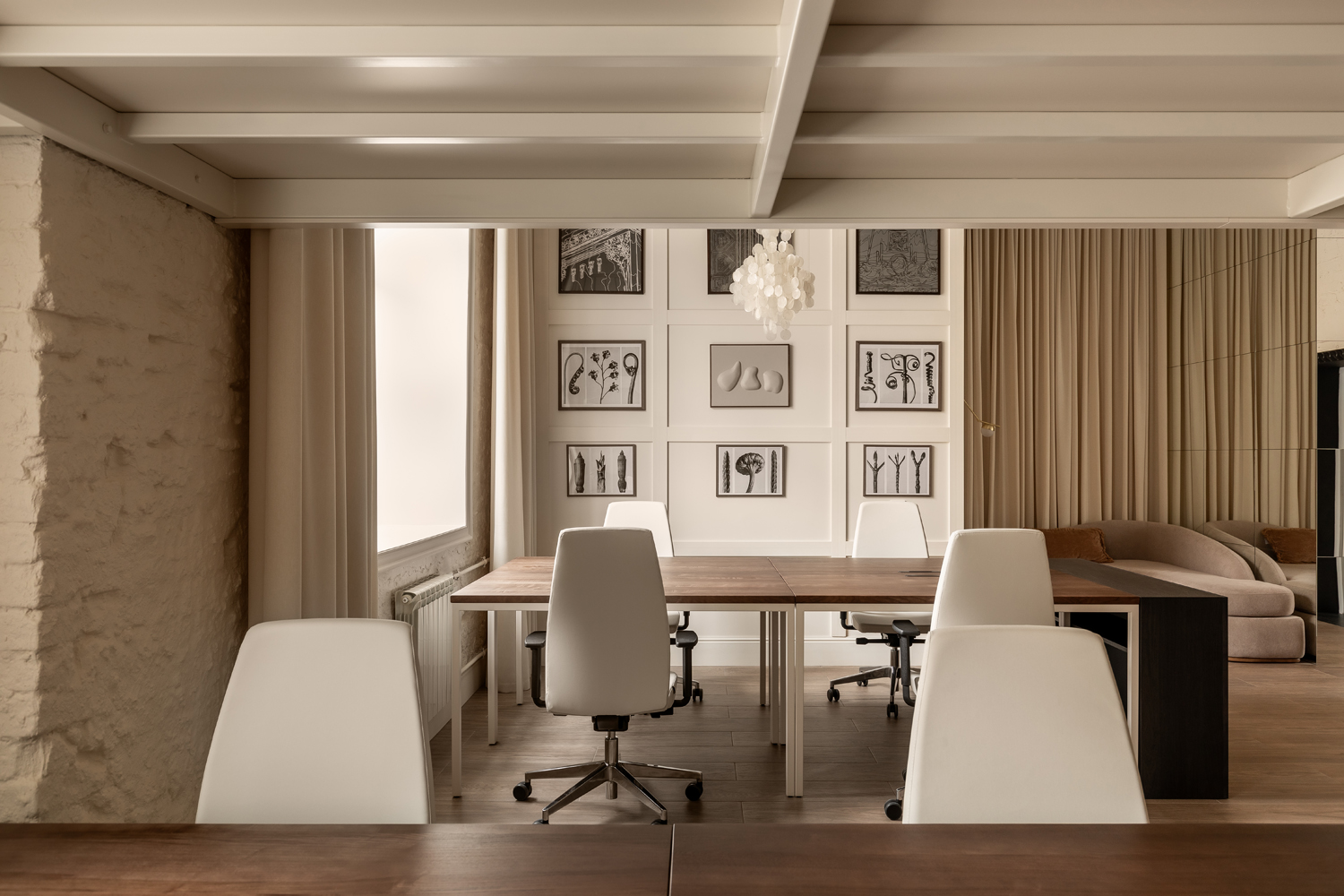 Більшість меблів у проєкті, зокрема масивний стіл у кабінеті директора та дивани, були виготовлені за індивідуальними кресленнями. Такий bespoke-підхід дозволив уникнути серійності, підкреслюючи унікальний характер офісу як місця, де історична тяглість зустрічається з актуальними вимогами ергономіки.
