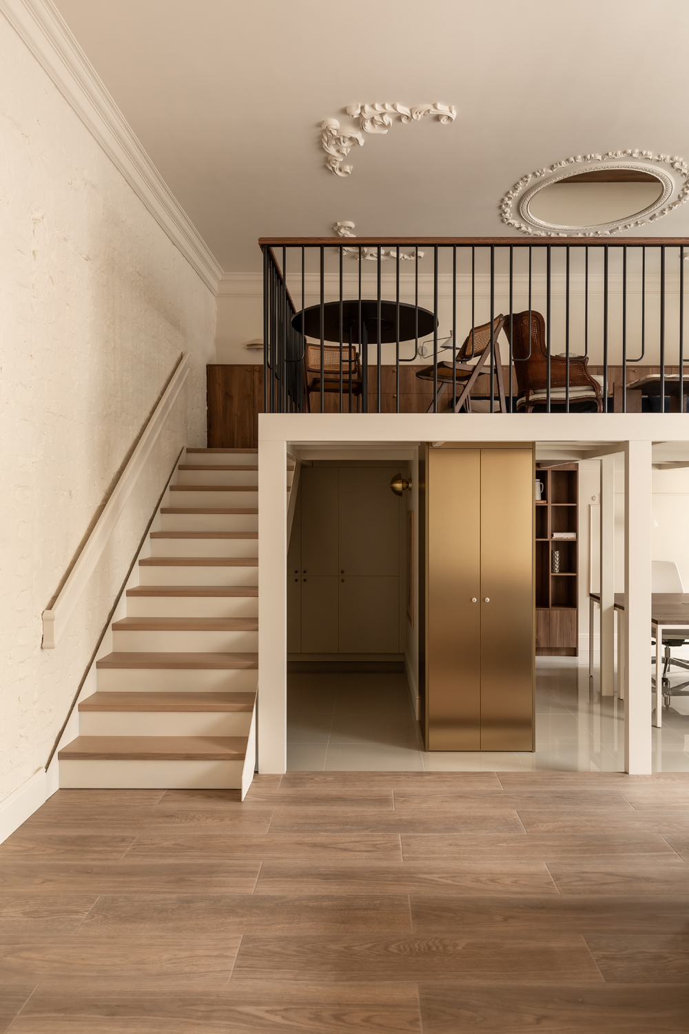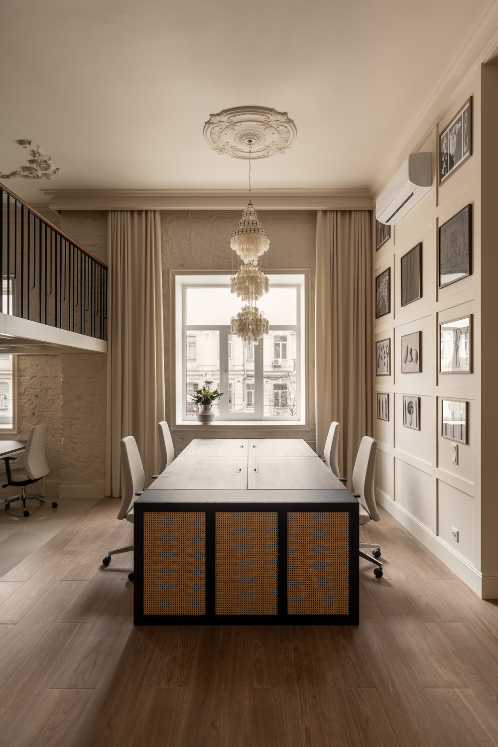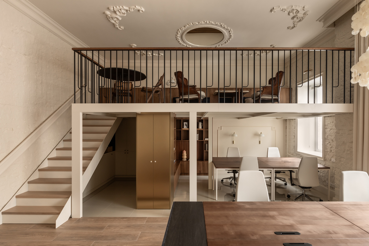 Головним архітектурним жестом стала робота з вертикаллю. Приміщення з висотою стелі 4,05 метра спонукало дизайнерів інтегрувати антресоль. Цей додатковий рівень не лише оптимізував корисну площу, а й створив чітку просторову ієрархію: перший поверх відведено для інтенсивної роботи та переговорів, тоді як верхній ярус функціонує як неформальна лаунж-зона для відпочинку та обідів.