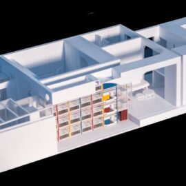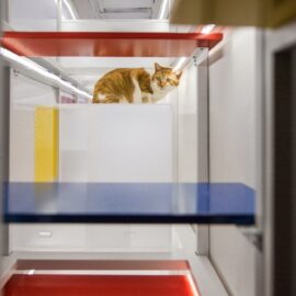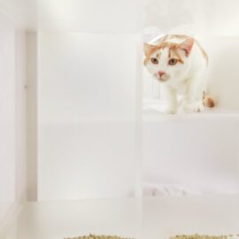 Полупрозрачные перегородки позволяют хозяевам следить за питомцами, а те, в свою очередь, чувствуют себя защищенными в укромных убежищах. Вытяжная вентиляция, вмонтированная над стеллажом, удаляет неприятные запахи, которые больше не доставляют дискомфорт людям и гостям. Рядом с вытяжкой в потолок интегрирована ультрафиолетовая лампа, используемая для дезинфекции.