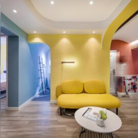 Несмотря на ограниченный метраж, применение полупрозрачных материалов, встроенного освещения и зеркальной стены в коридоре позволяет размыть границы, создавая иллюзию простора. Колористические решения, использованные в этом интерьере, создают жизнерадостное настроение у людей и животных.