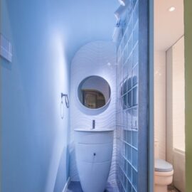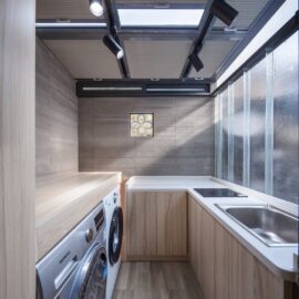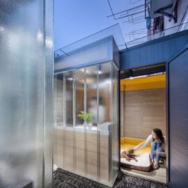 Владельцы квартиры хотели, чтобы их питомцы не чувствовали себя в изоляции, поэтому вариант расселения кошек и собак в клетках – изначально не рассматривался. С помощью раздвижной перегородки квартира была условно разделена на функциональные зоны для хозяев и животных. Ядром «кошачьей» территории стал многоуровневый стеллаж из полупрозрачного поликарбоната, своеобразный «капсульный отель», в который кошки входят по игровой лесенке. Каждая капсула состоит из места для сна и туалета, который легко убирать благодаря выдвижной системе.