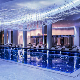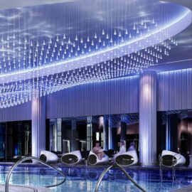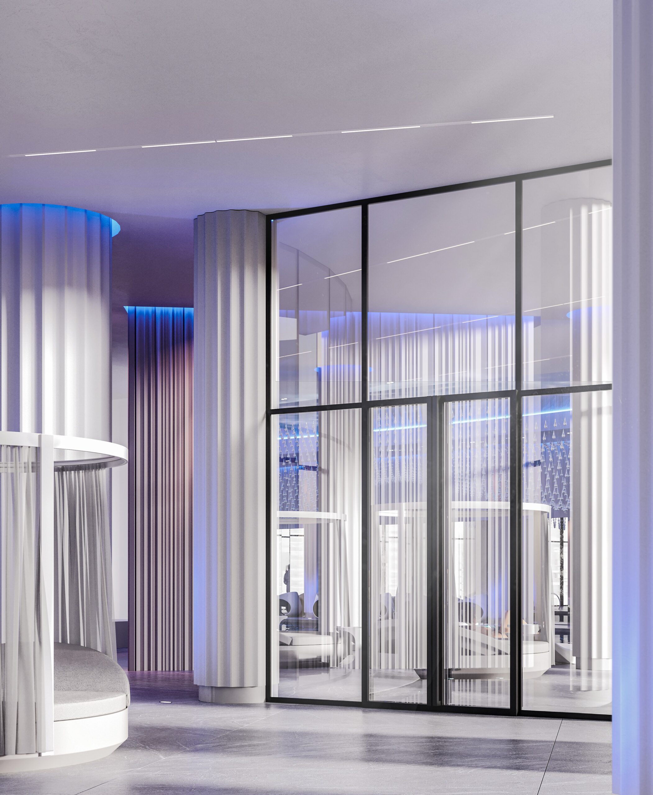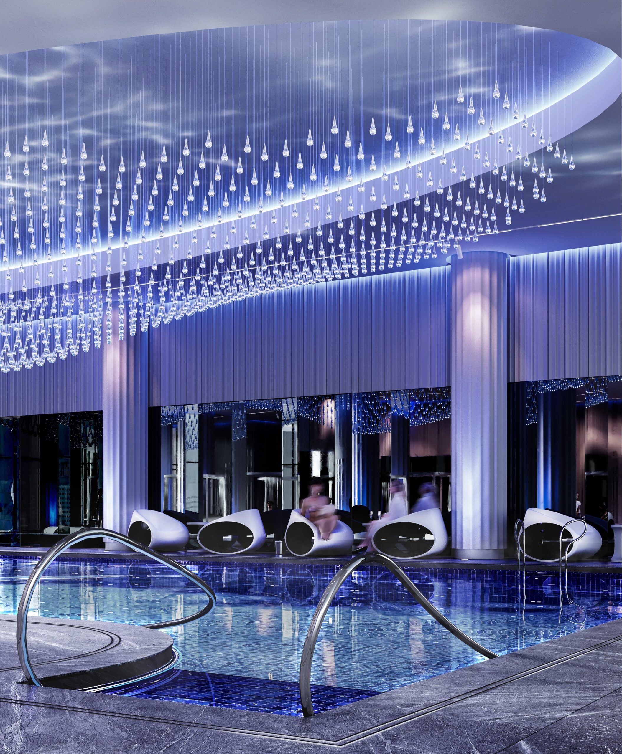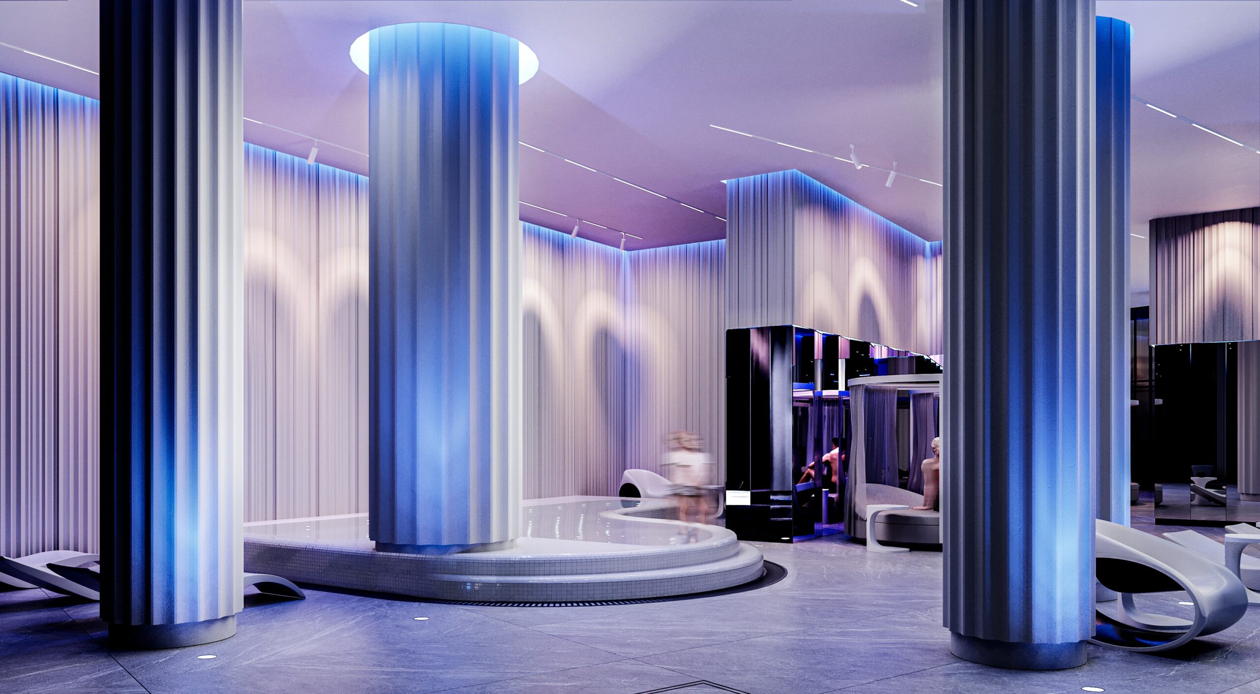 Вишуканий СПА-комплекс, де дизайн викликає асоціації з підводним царством, переосмислений через призму сучасної розкоші та футуристичності. Концепція аквазони побудована навколо метафори води та її плинності. Центральним елементом є інсталяція зі скляних крапель на стелі, яка створює ефект кристалізованих бризок. Ці краплі, розташовані хвилеподібним візерунком, відбивають і розсіюють світло, створюючи динамічну гру відблисків на поверхні басейну.