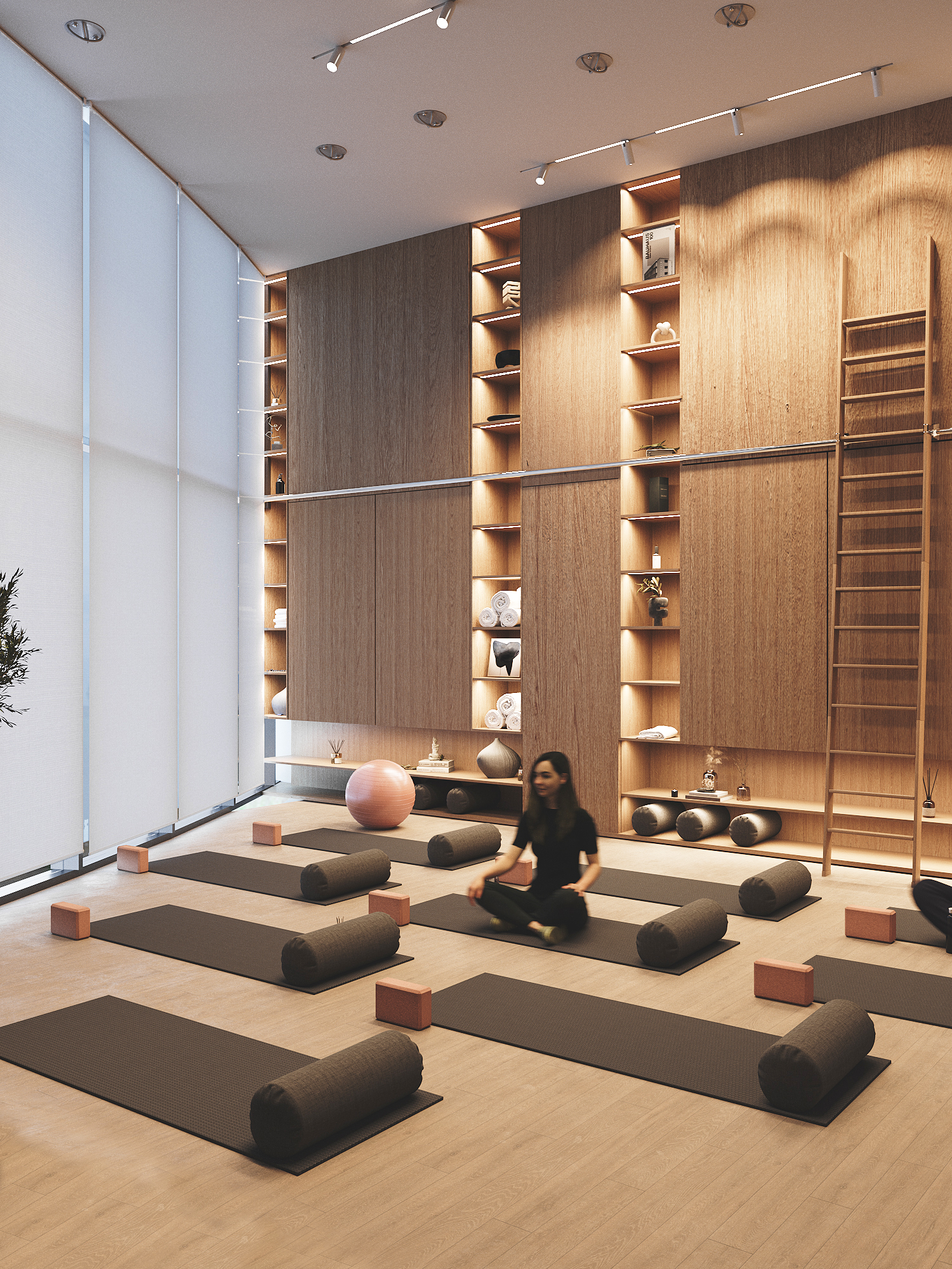 Зона йоги дарує відчуття гармонії завдяки аскетичному мінімалізму, живим рослинам і приглушеному освітленню.