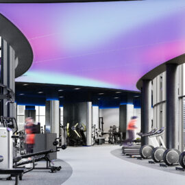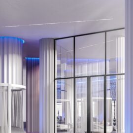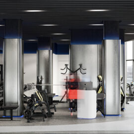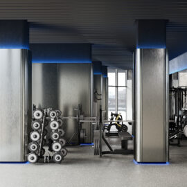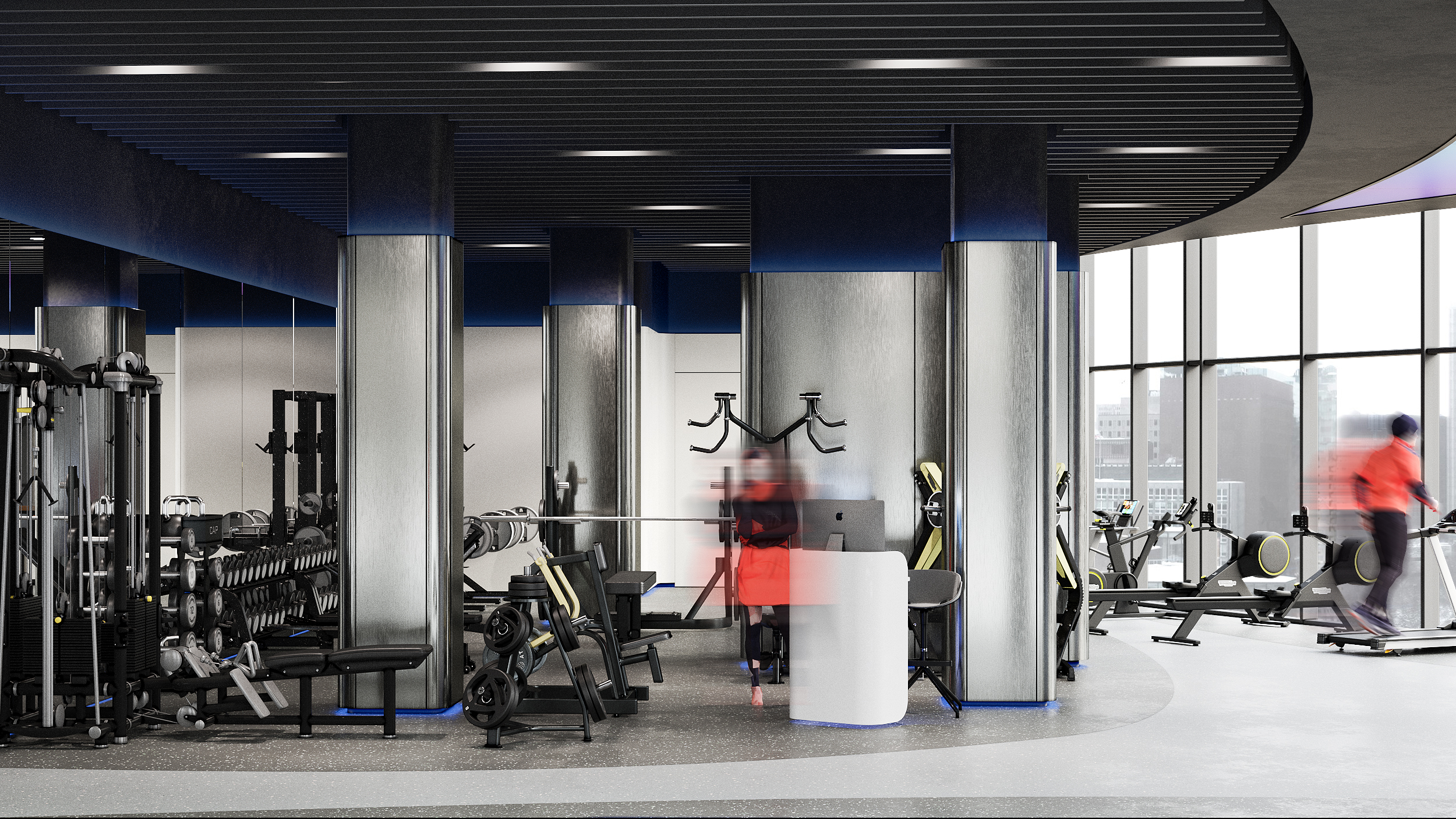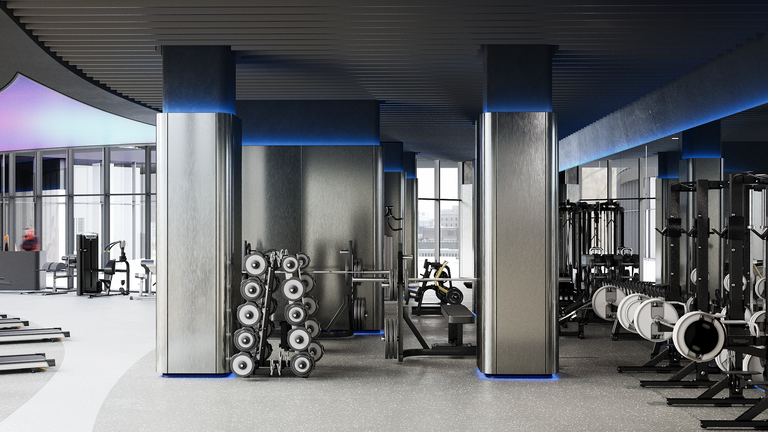 Фітнес-зона органічно продовжує футуристичну естетику. Її інтер’єр виконано в монохромній палітрі з акцентним синім підсвічуванням. Металеві колони з текстурною поверхнею створюють відчуття високотехнологічності простору. Функціональне зонування забезпечує плавний перехід між кардіо-зоною, зонами силових тренажерів, боксерським рингом і зонами для функціональних тренувань. LED-підсвічування підлоги створює ефект левітації. Мінімалістичний дизайн підкреслює преміальність, а продумана навігація забезпечує інтуїтивність простору.