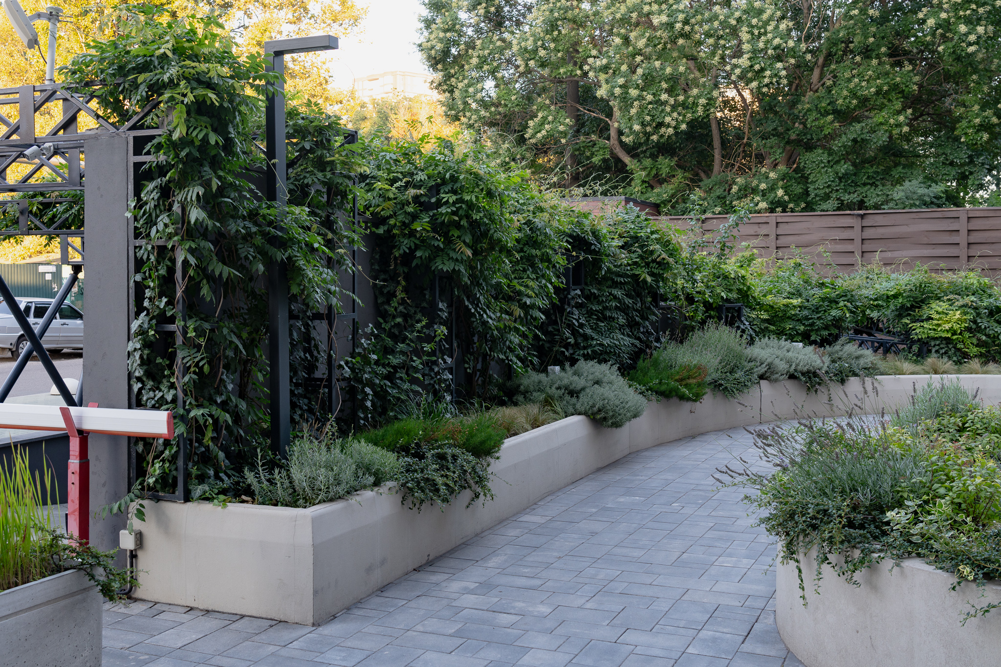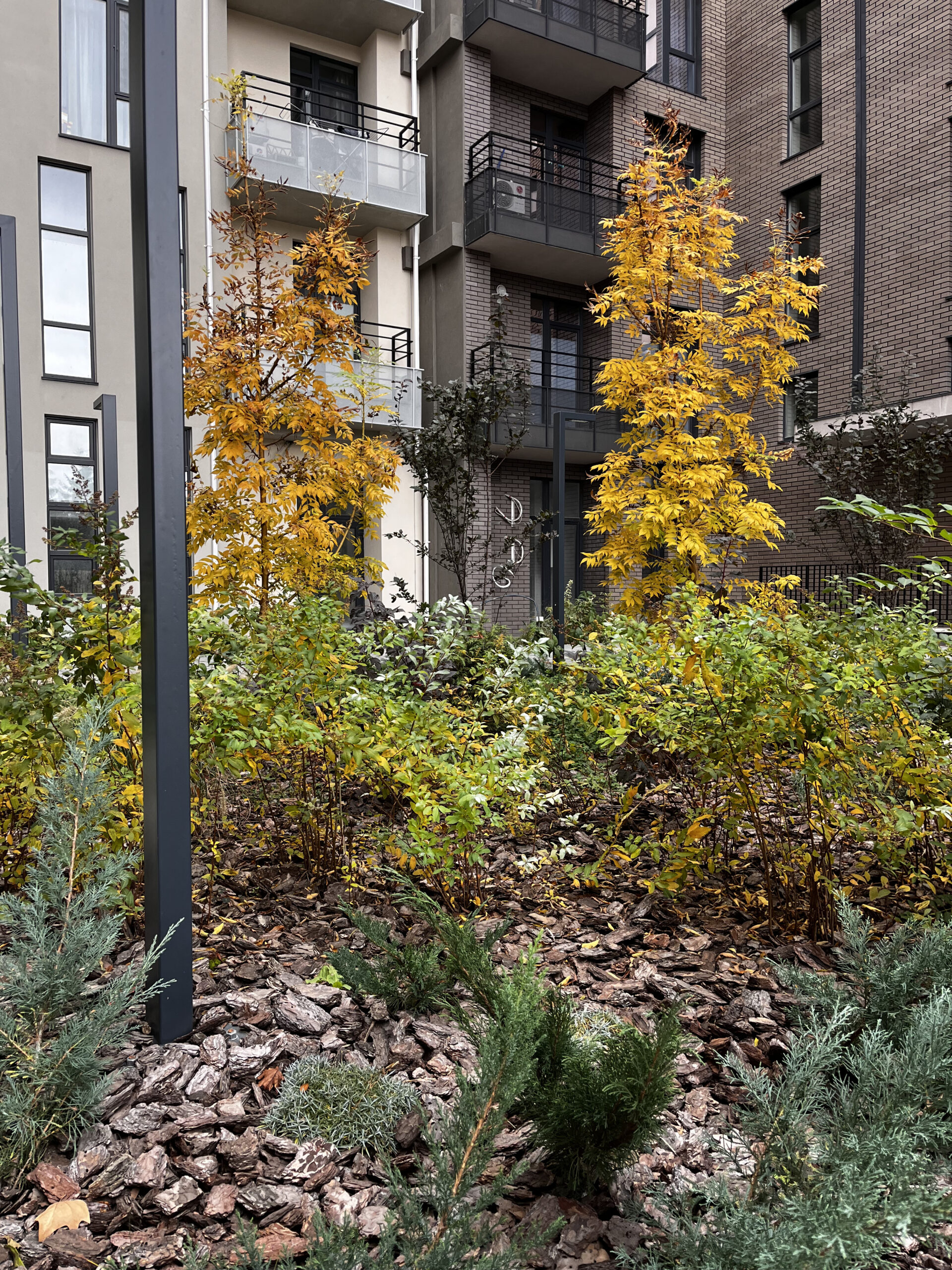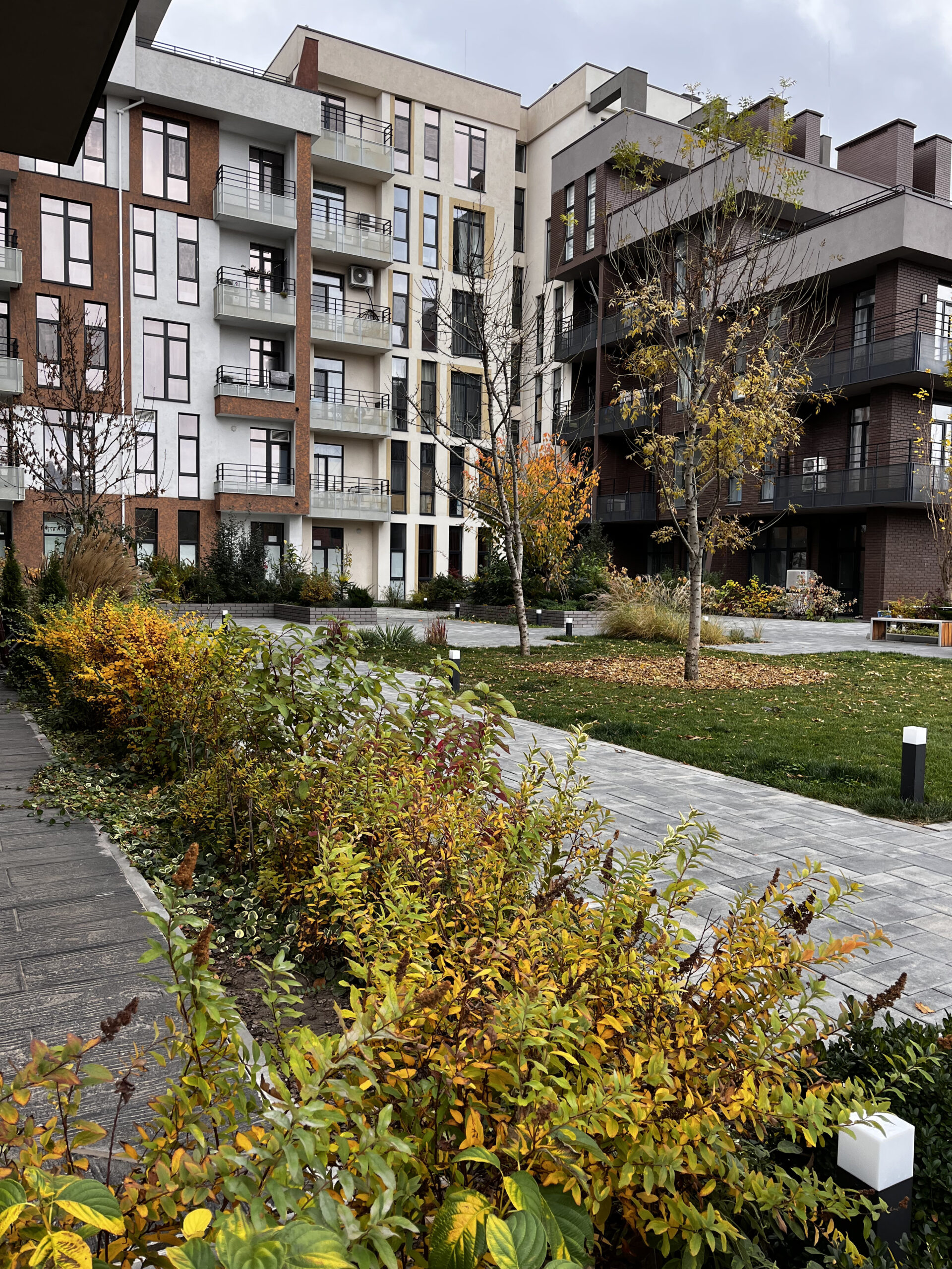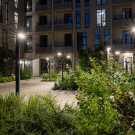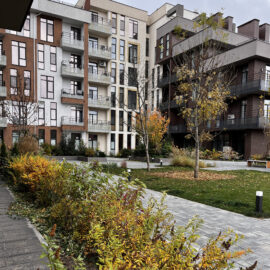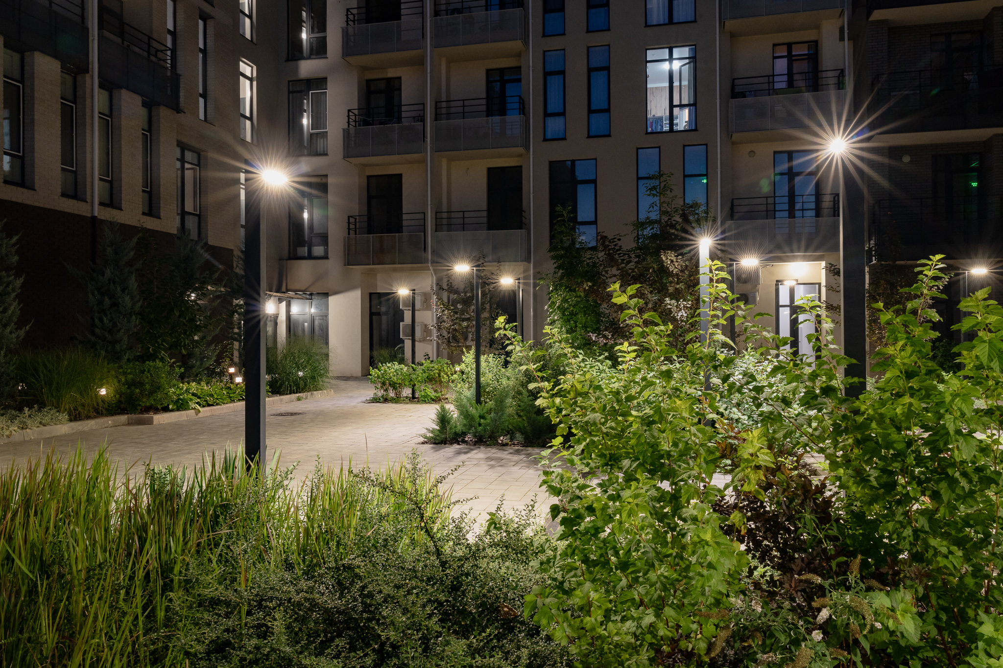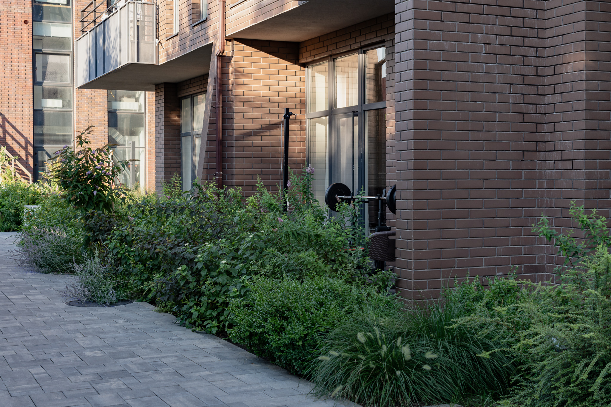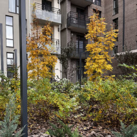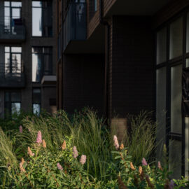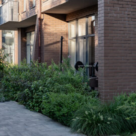 В атріумах відокремили індивідуальні патіо-зони від громадських просторів міксбордерами з багаторічників та декоративних злаків. Оскільки на першому поверсі ЖК розташована школа, громадські простори дизайнери озеленили малодоглядним садом із безперервним цвітінням, яке змінюється впродовж року та вчить дітей споглядати природу.