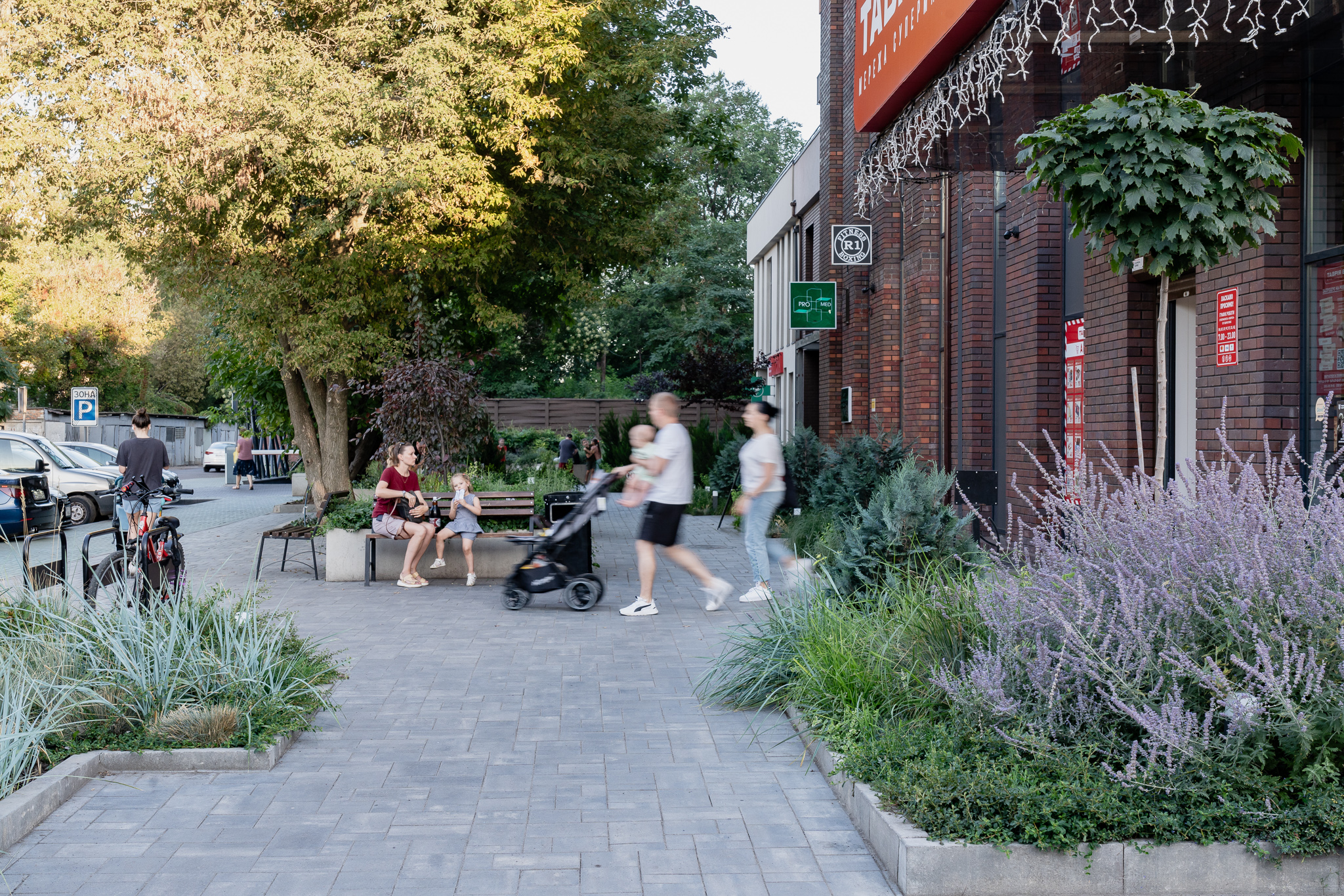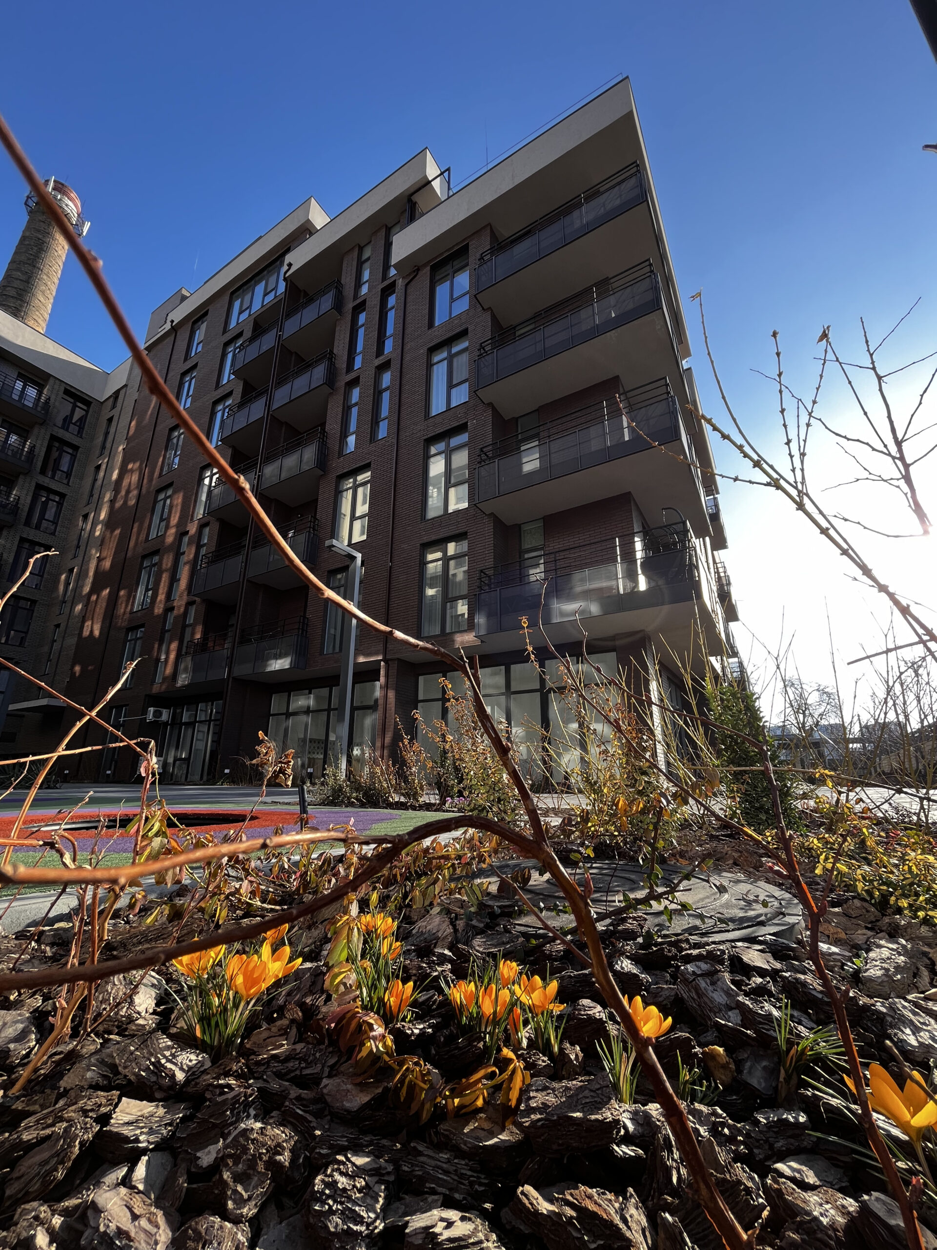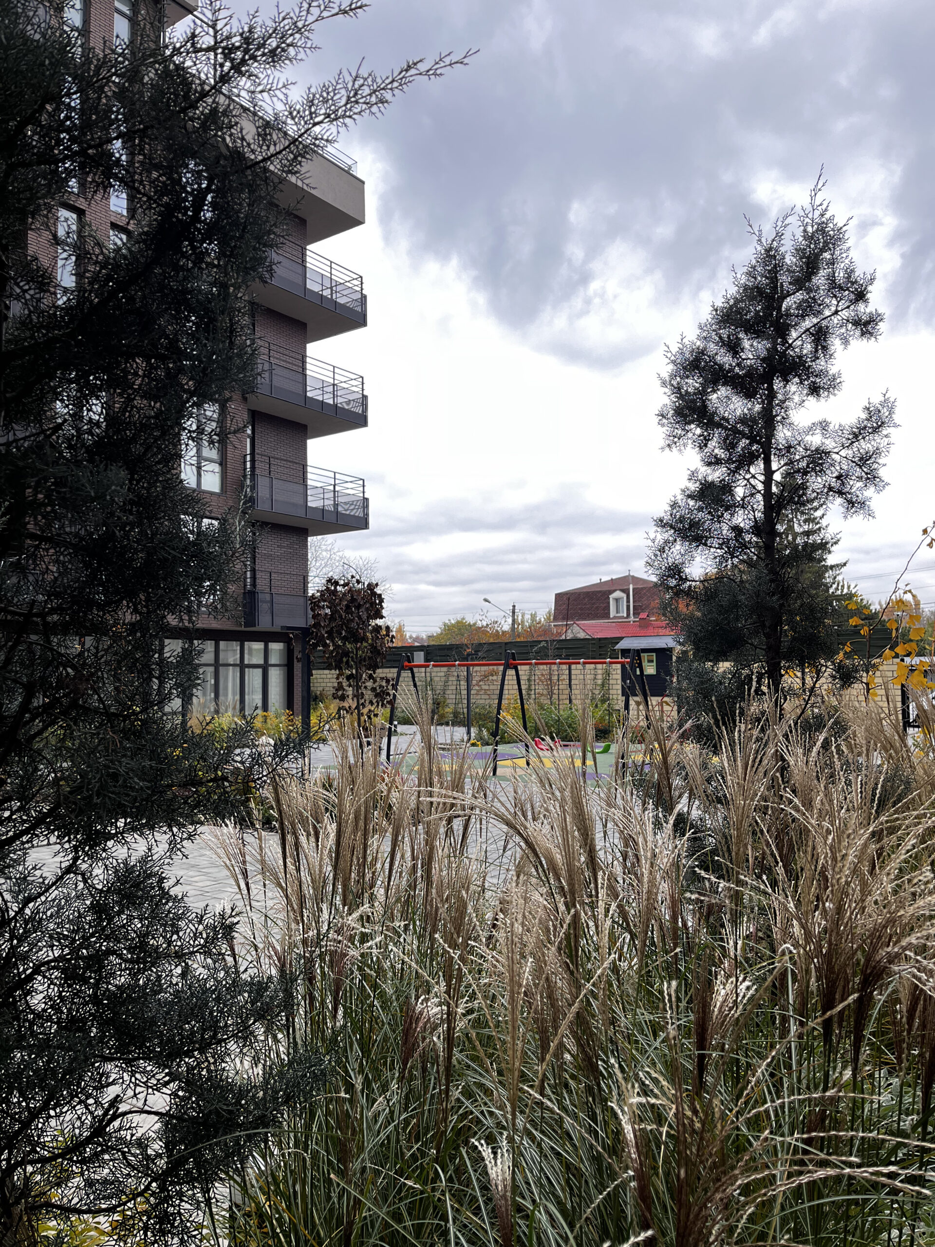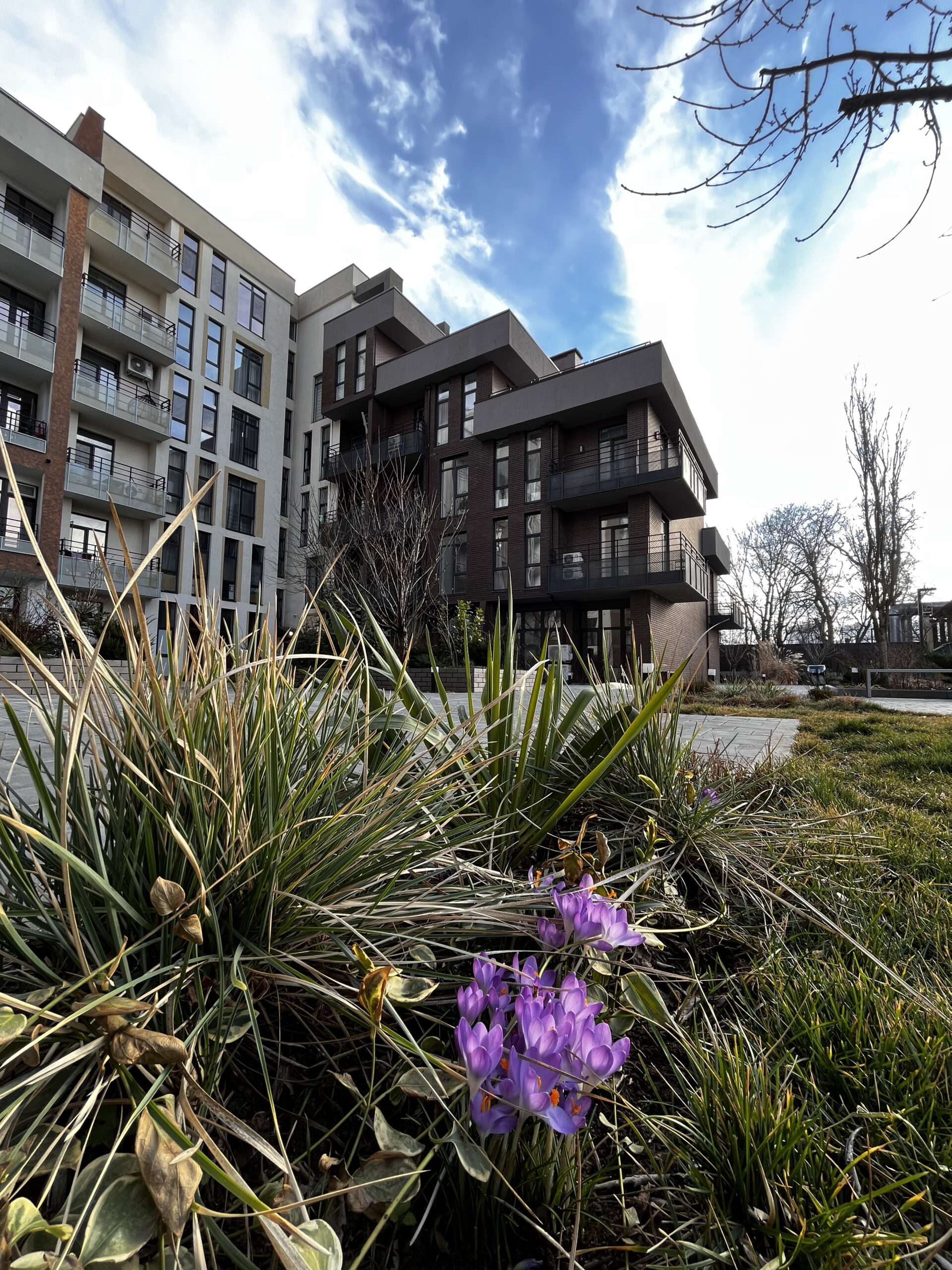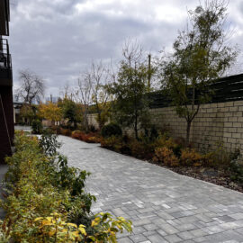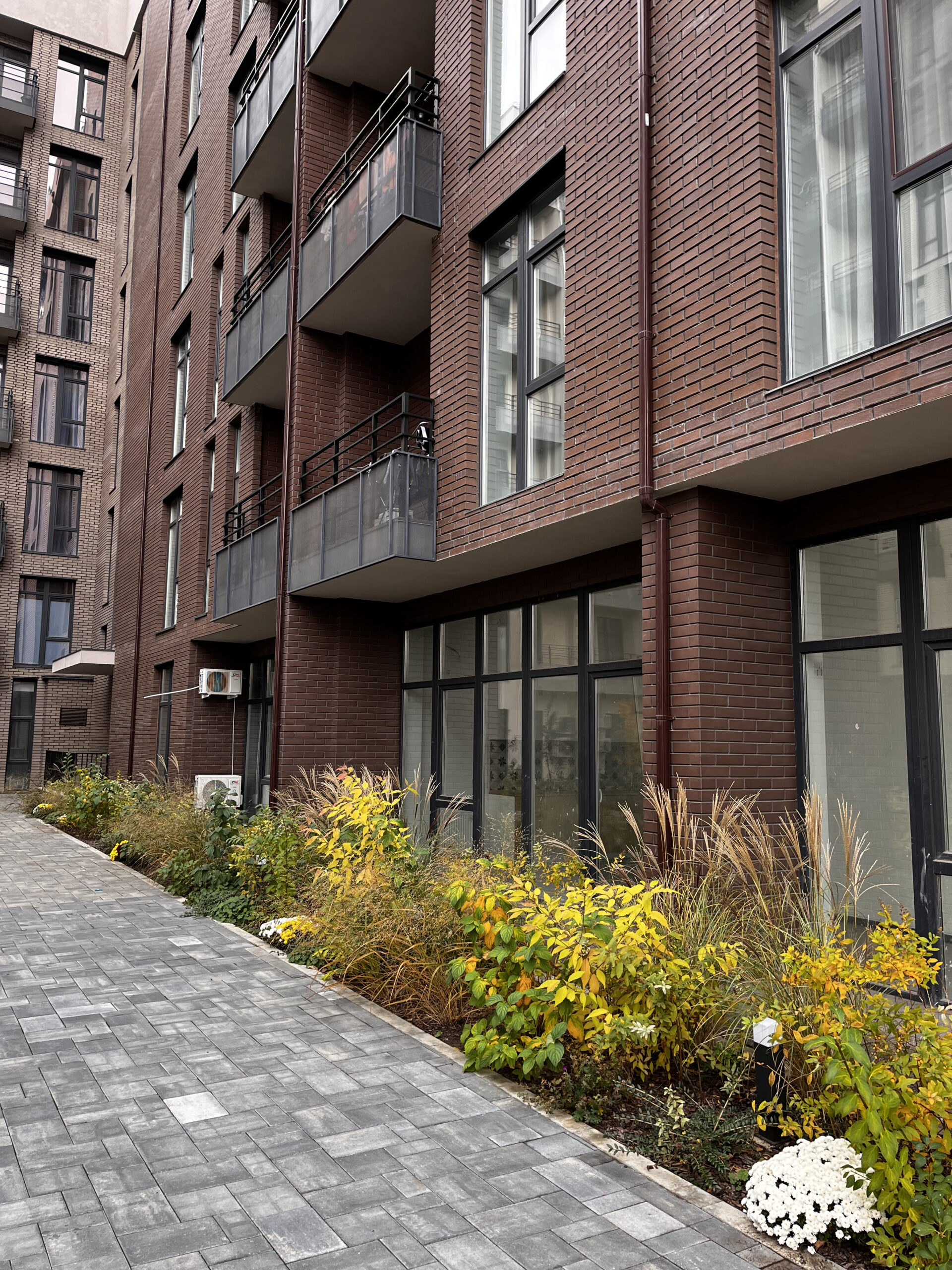 В атріумах відокремили індивідуальні патіо-зони від громадських просторів міксбордерами з багаторічників та декоративних злаків. Оскільки на першому поверсі ЖК розташована школа, громадські простори дизайнери озеленили малодоглядним садом із безперервним цвітінням, яке змінюється впродовж року та вчить дітей споглядати природу.