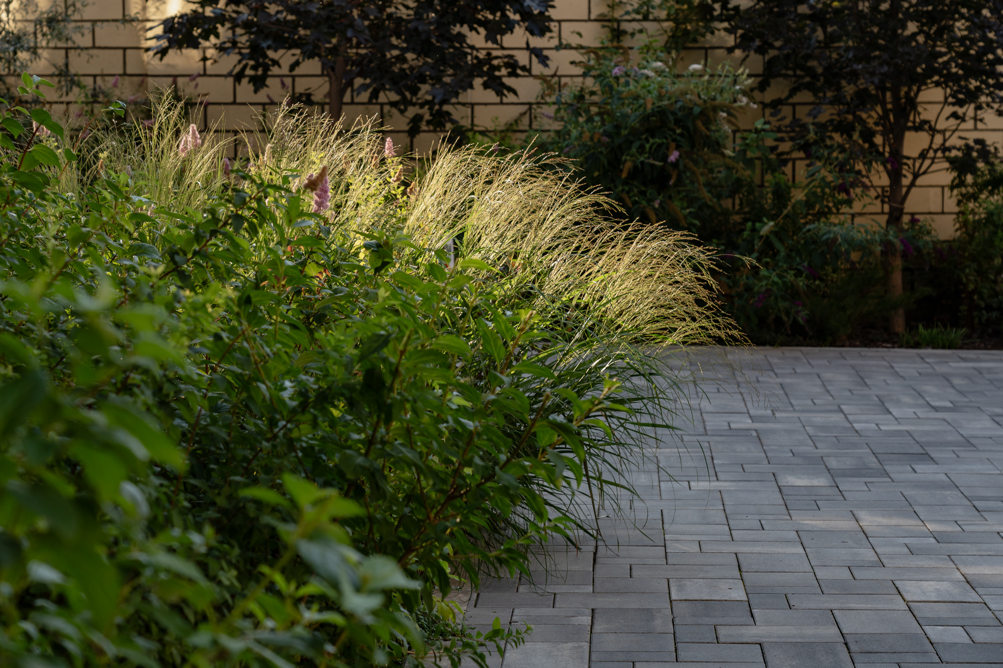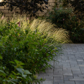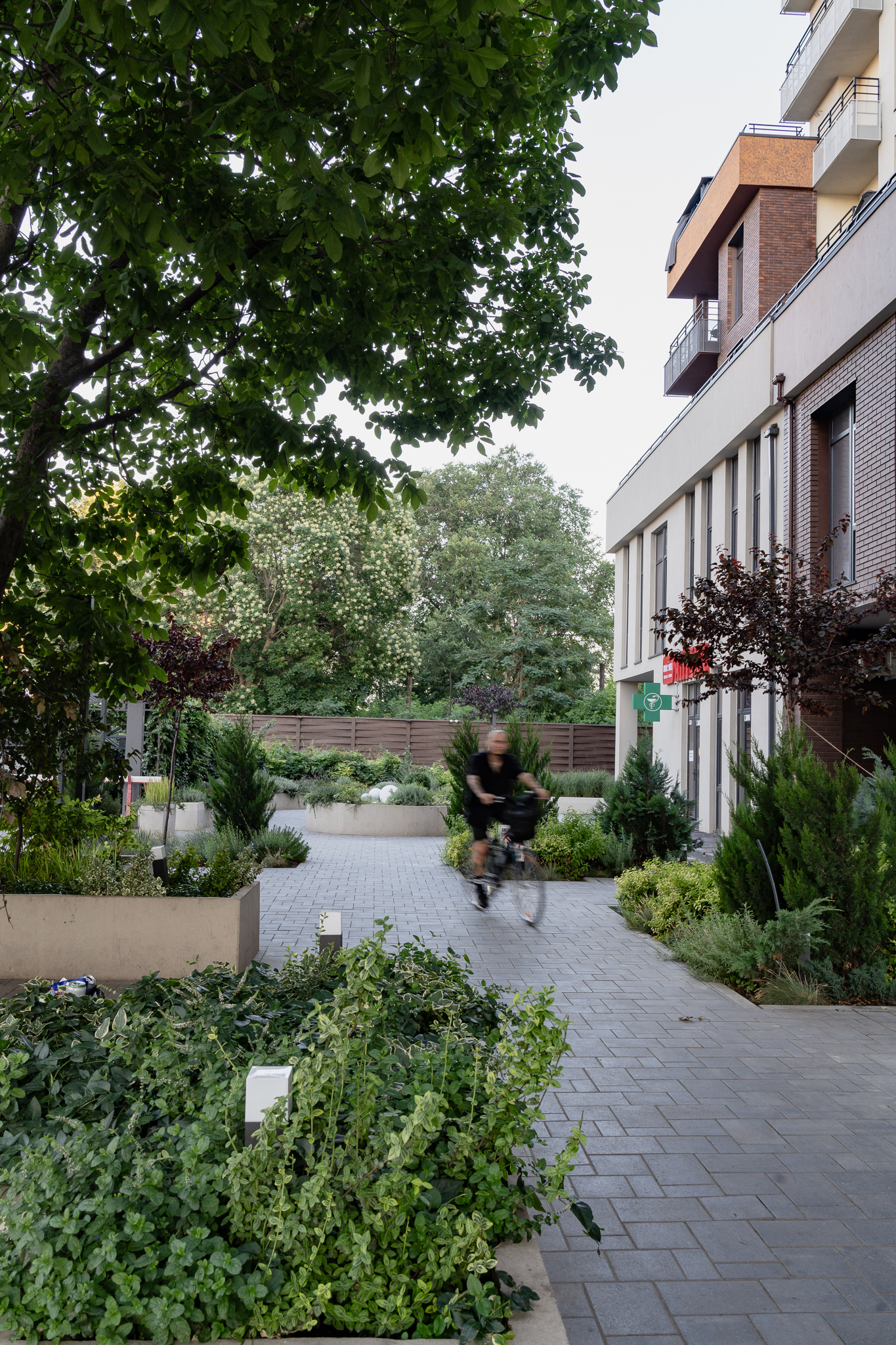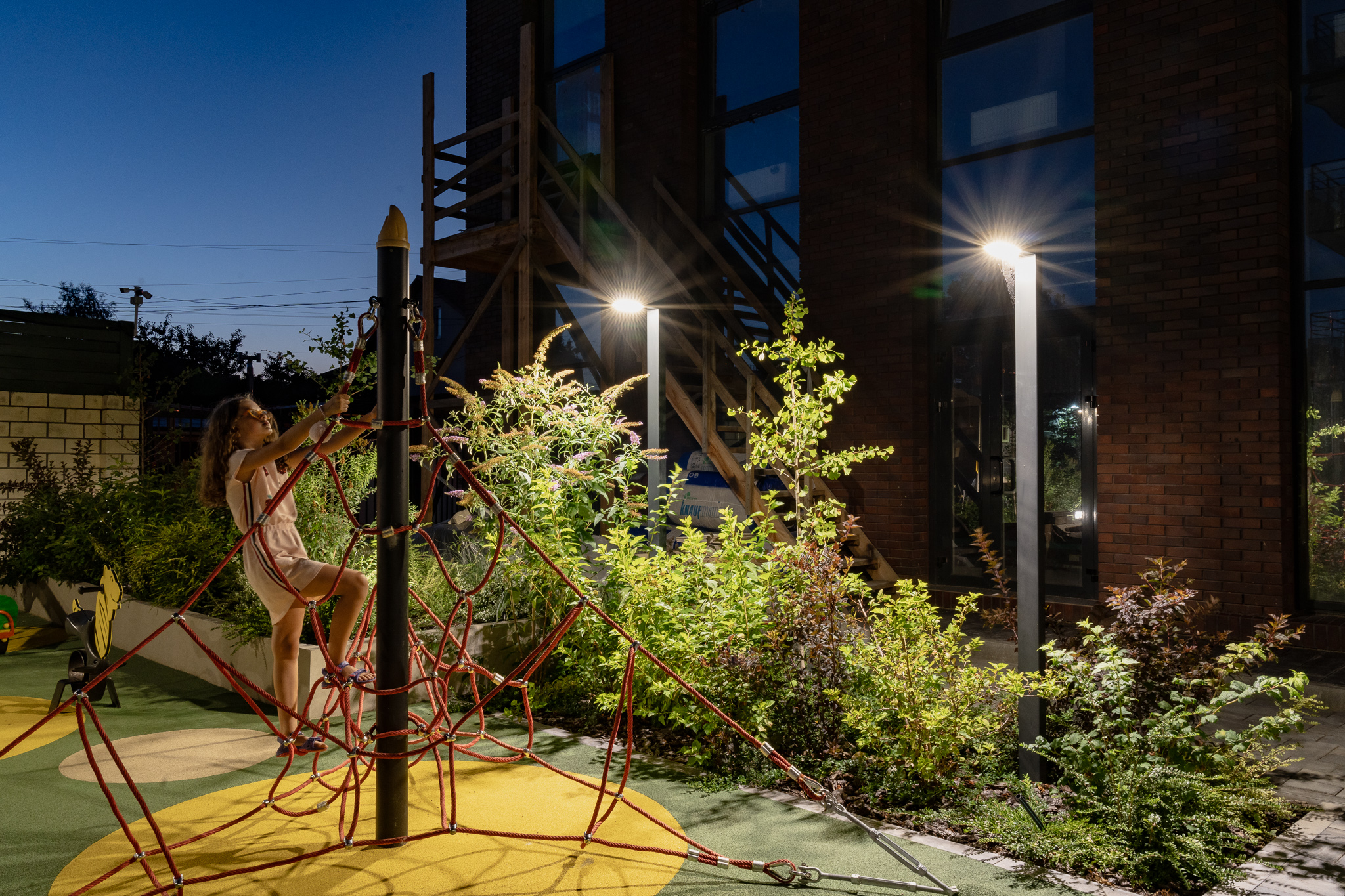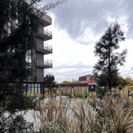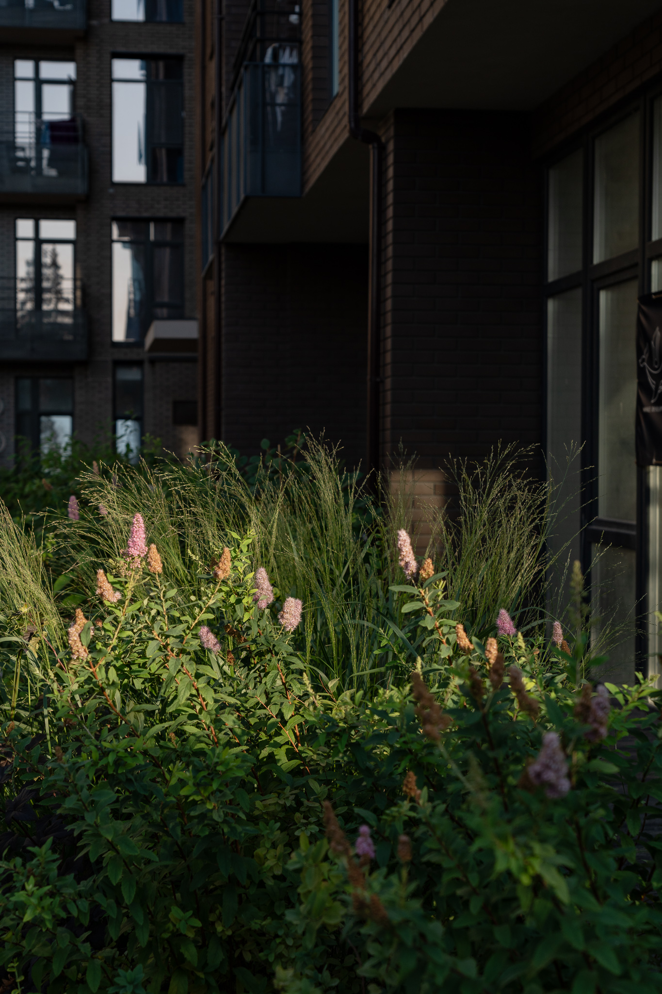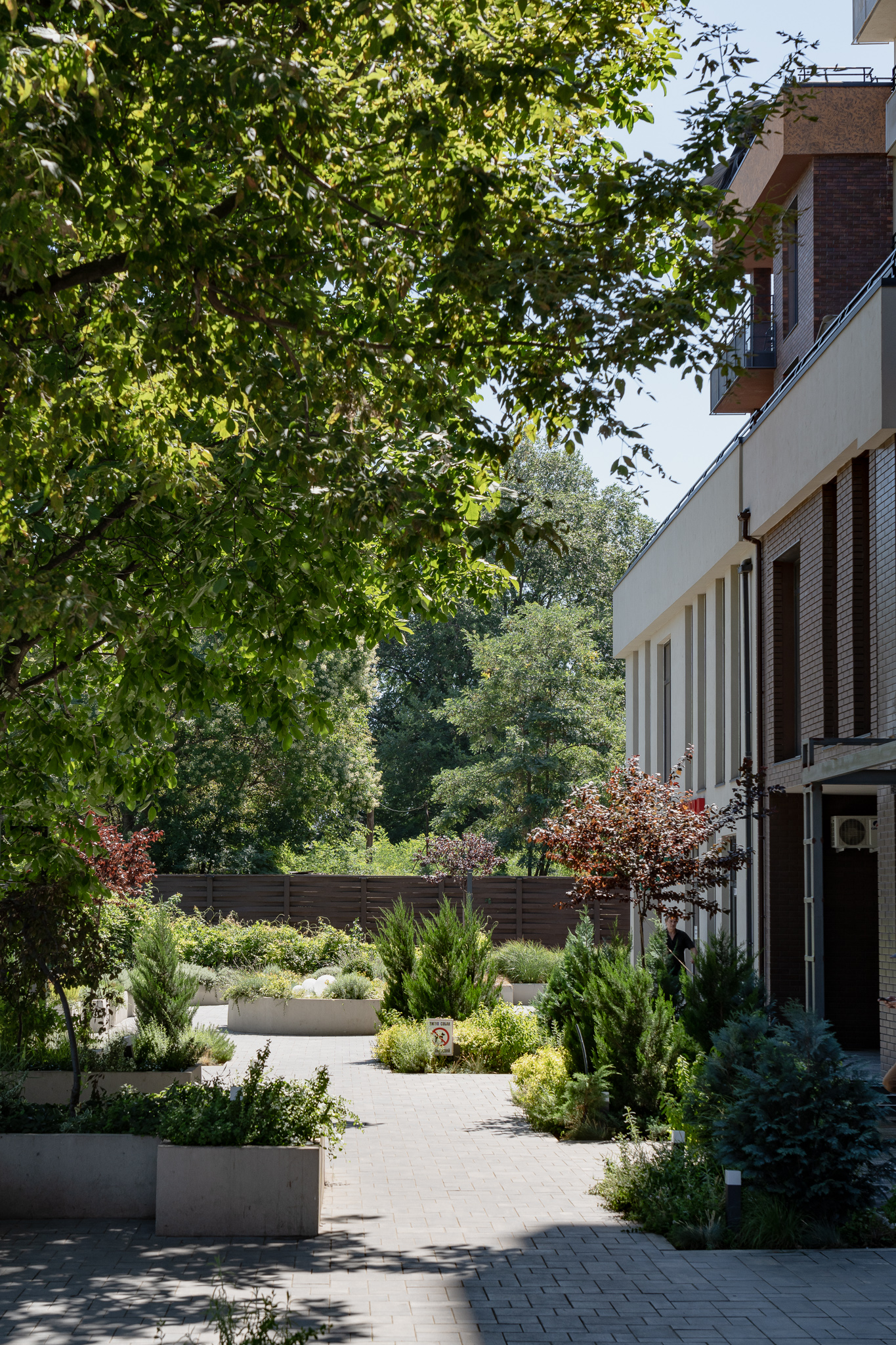 В атріумах відокремили індивідуальні патіо-зони від громадських просторів міксбордерами з багаторічників та декоративних злаків. Оскільки на першому поверсі ЖК розташована школа, громадські простори дизайнери озеленили малодоглядним садом із безперервним цвітінням, яке змінюється впродовж року та вчить дітей споглядати природу.
