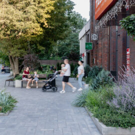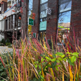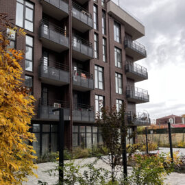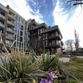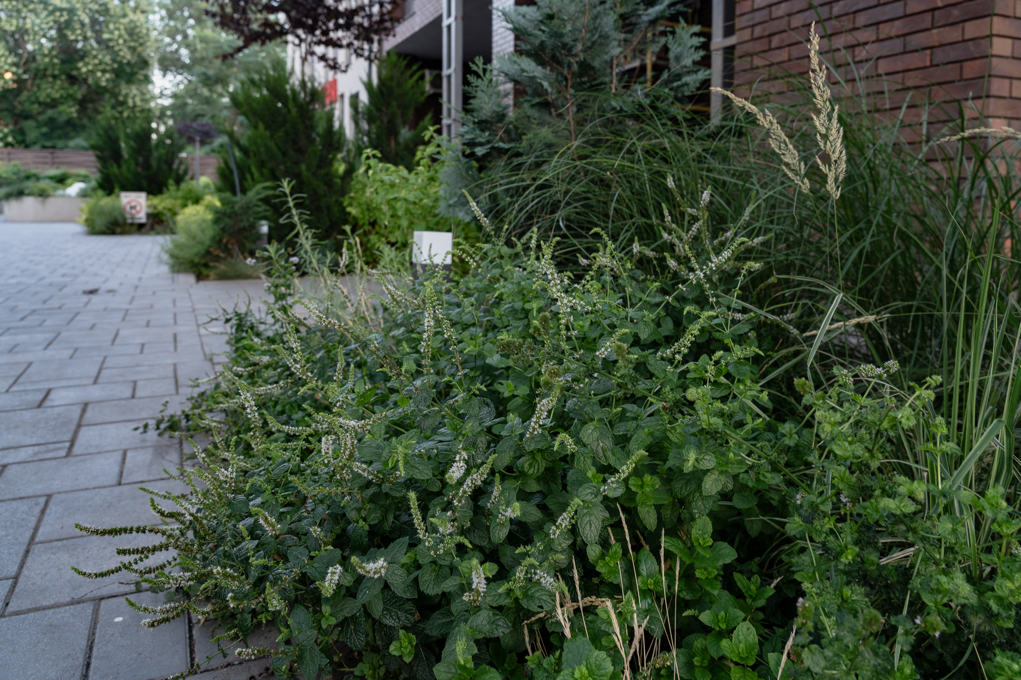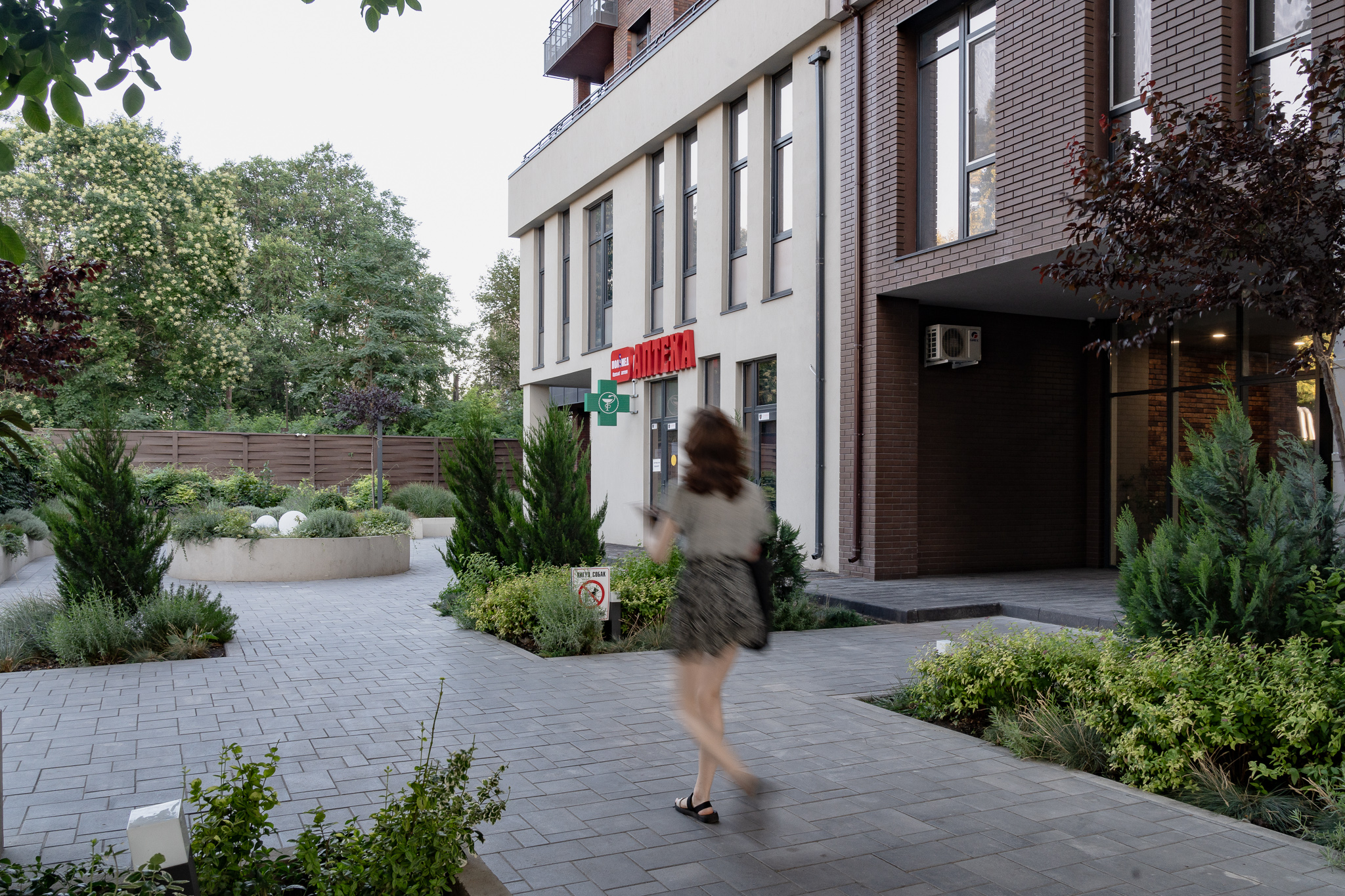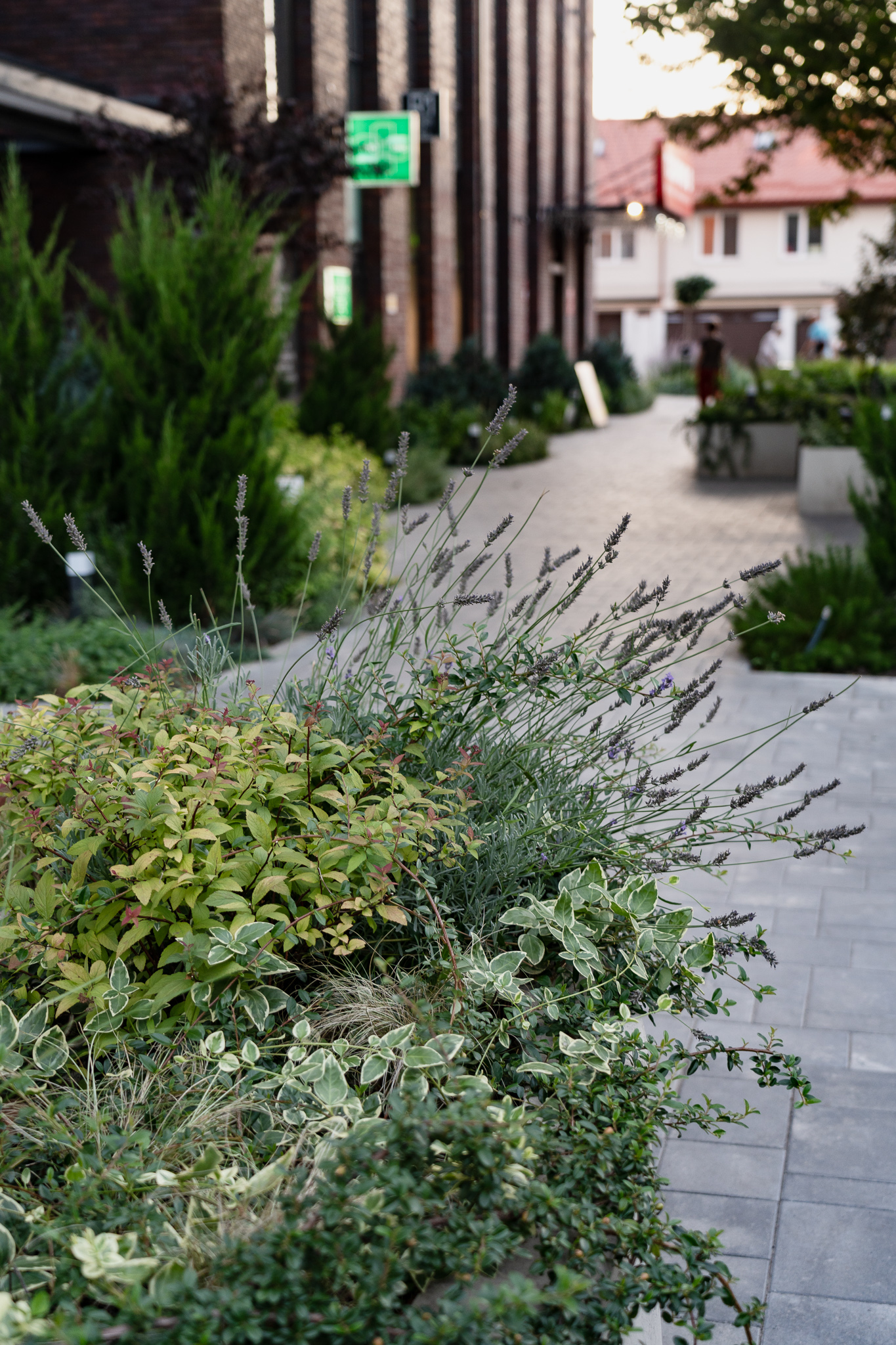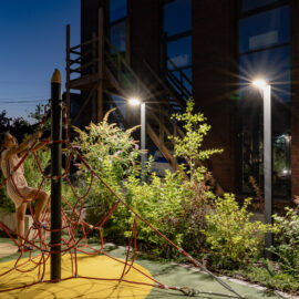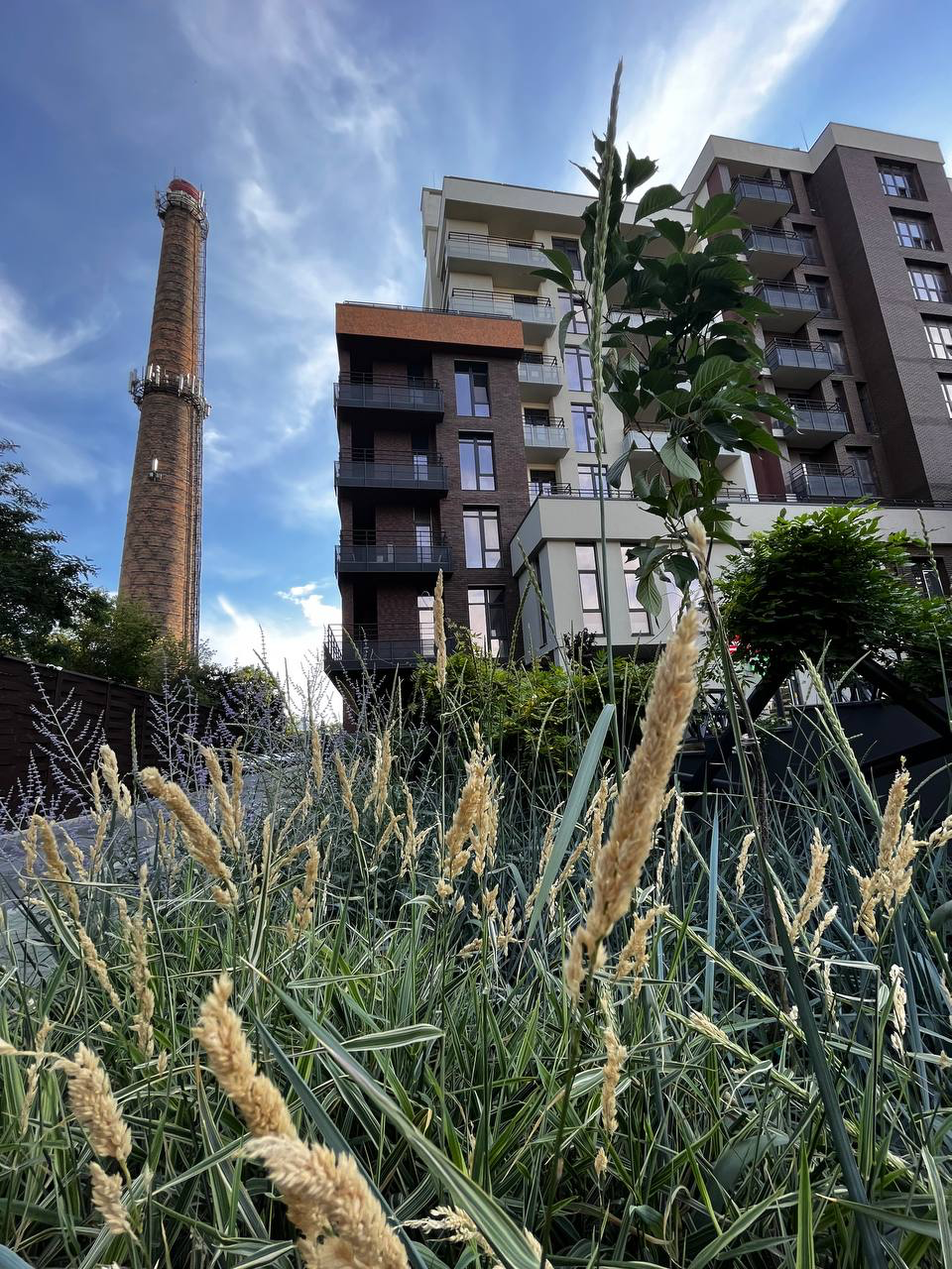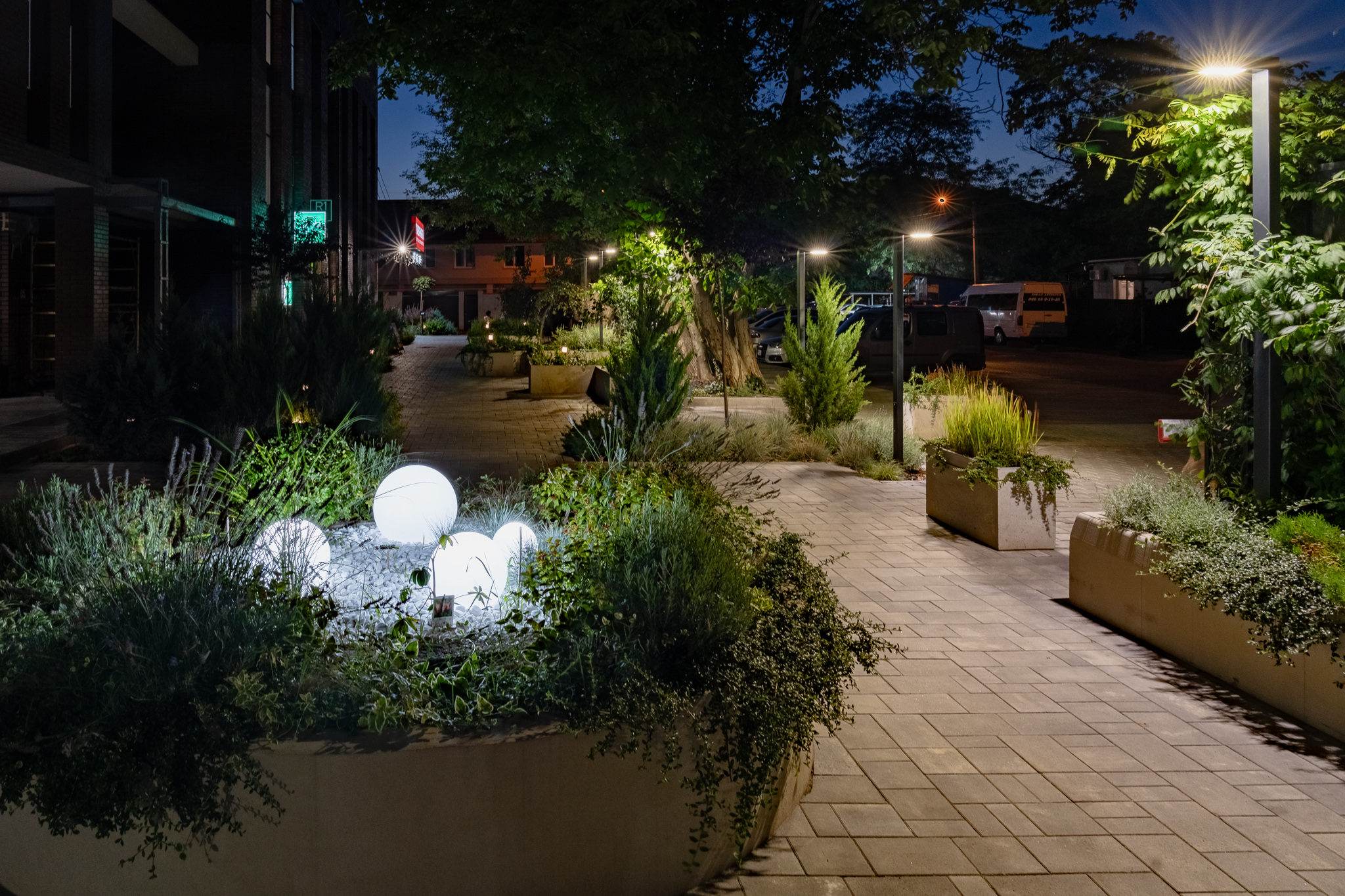 В атріумах відокремили індивідуальні патіо-зони від громадських просторів міксбордерами з багаторічників та декоративних злаків. Оскільки на першому поверсі ЖК розташована школа, громадські простори дизайнери озеленили малодоглядним садом із безперервним цвітінням, яке змінюється впродовж року та вчить дітей споглядати природу.