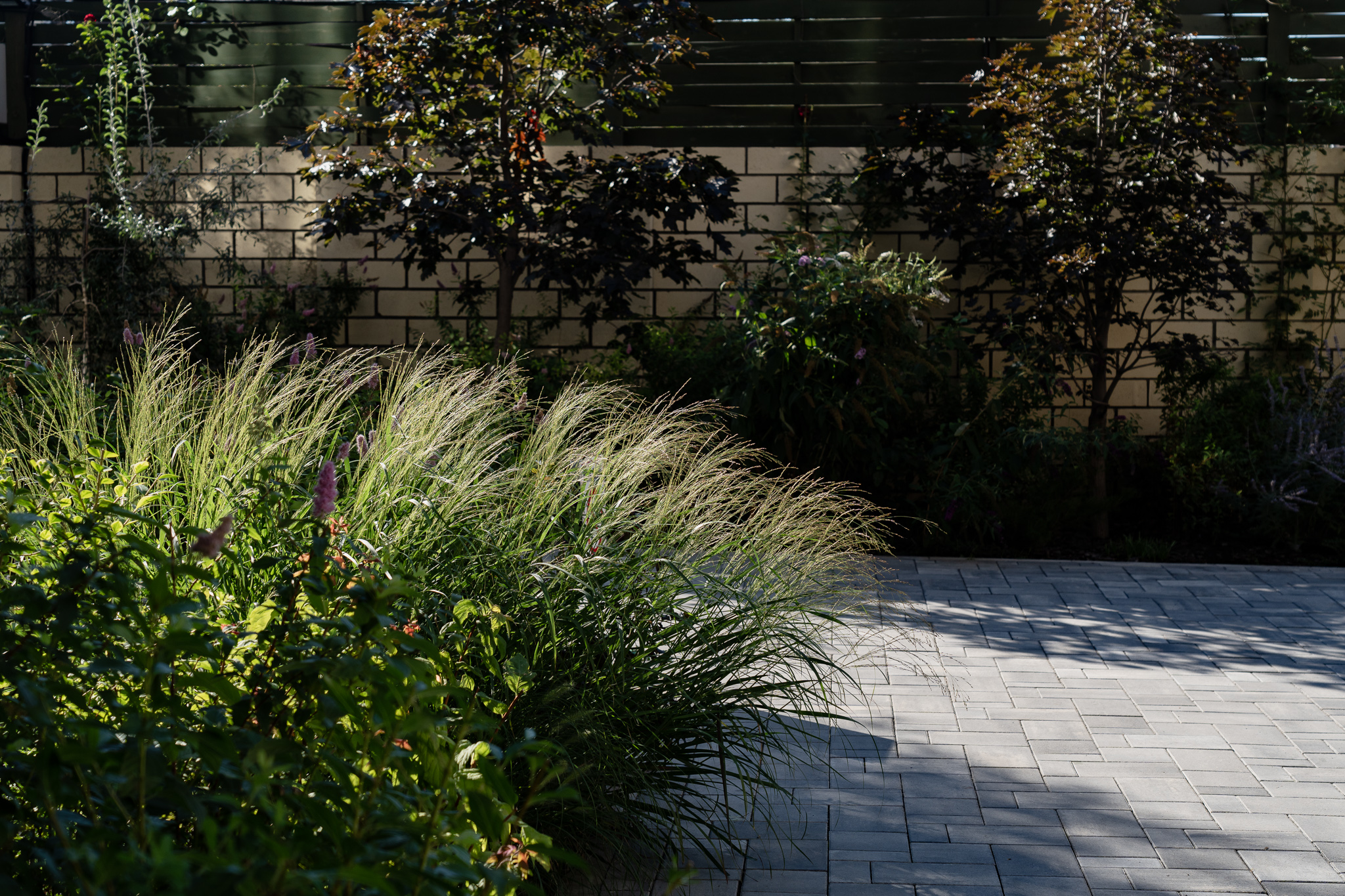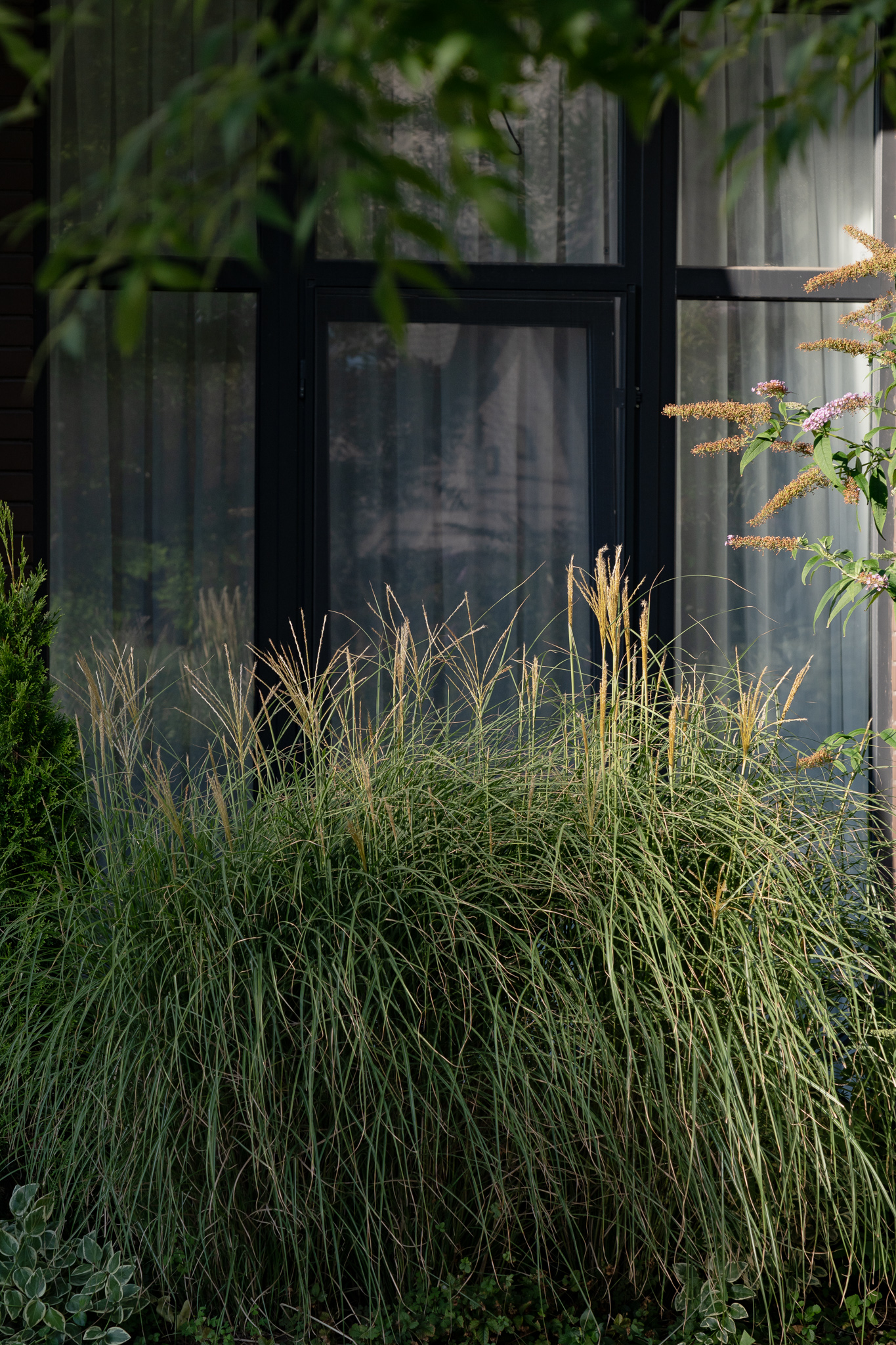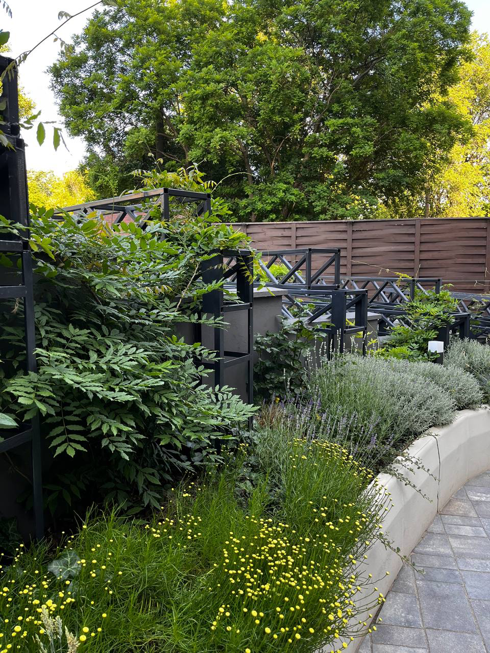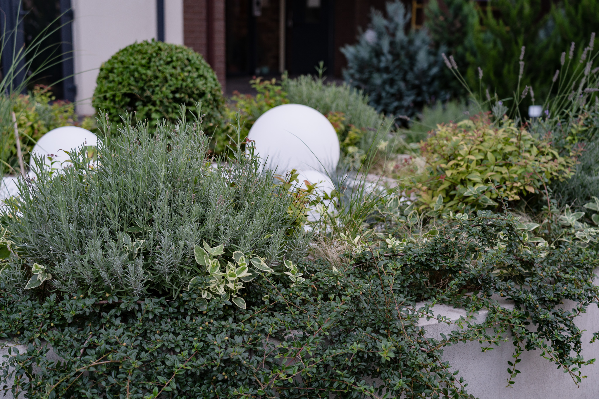 Фасадна частина у високих клумбах вирізняється різноманіттям духмяних трав, осок, бересклетів та барвінків, що гармонійно сплітаються між собою. Скелетом саду обрали кипарисовики, аби пов’язати між собою першу і другу частини об’єкта.