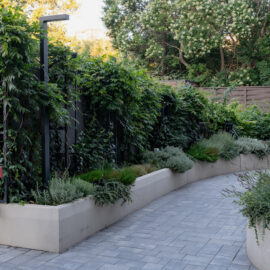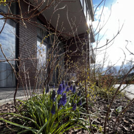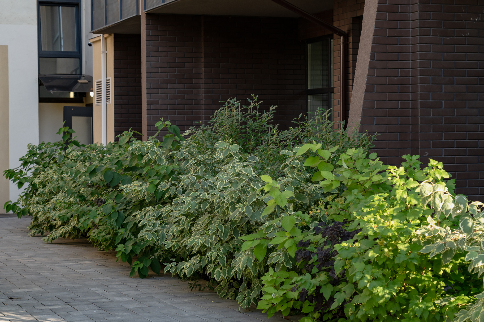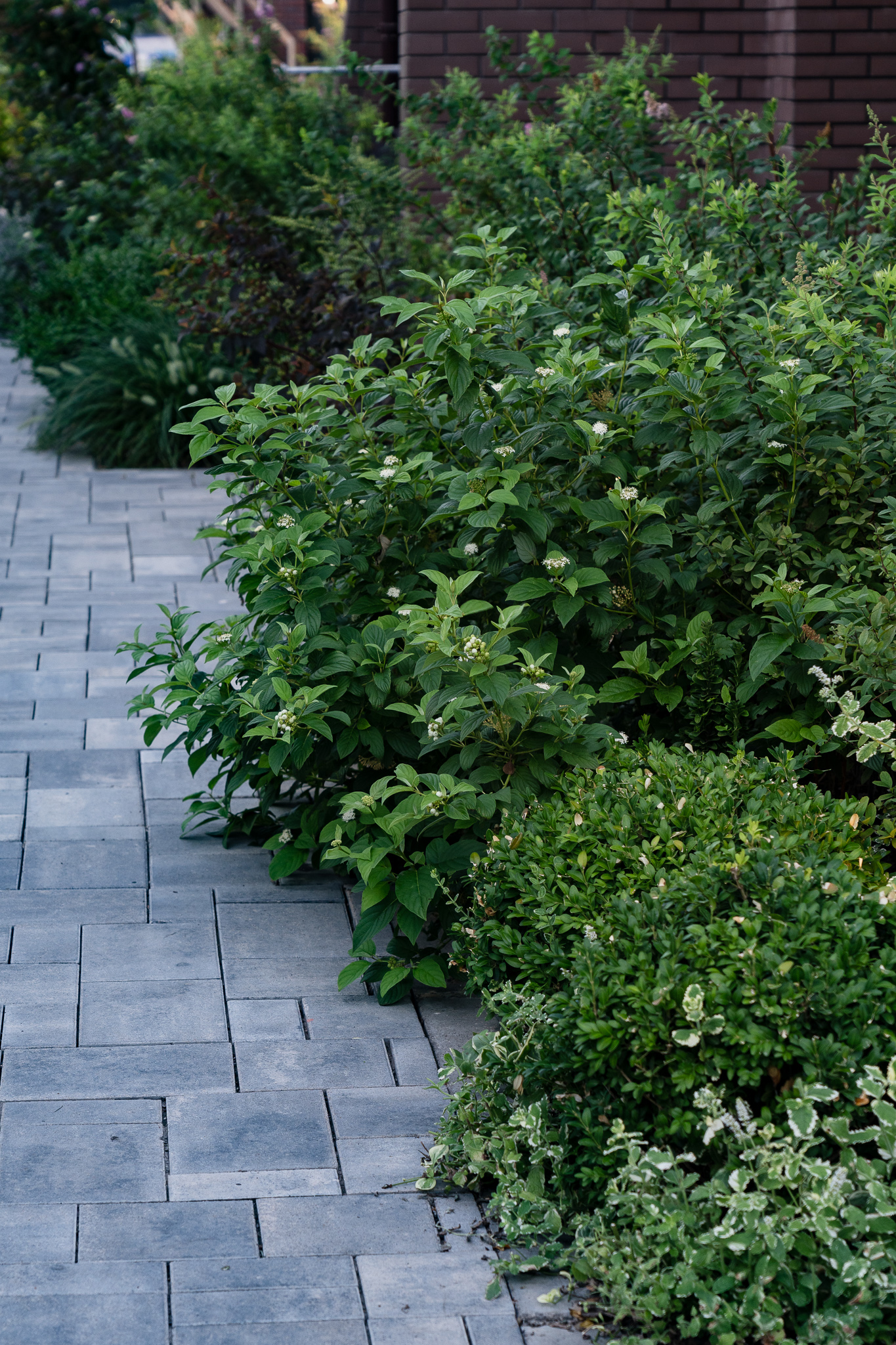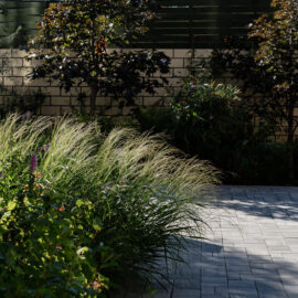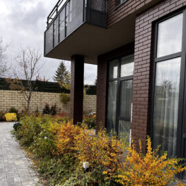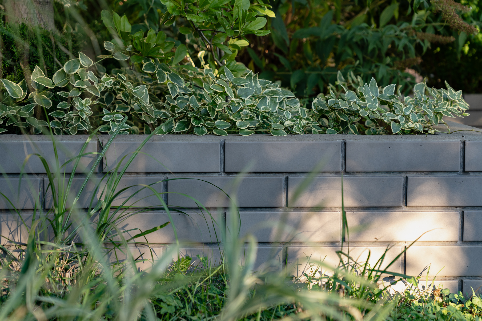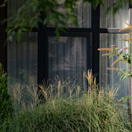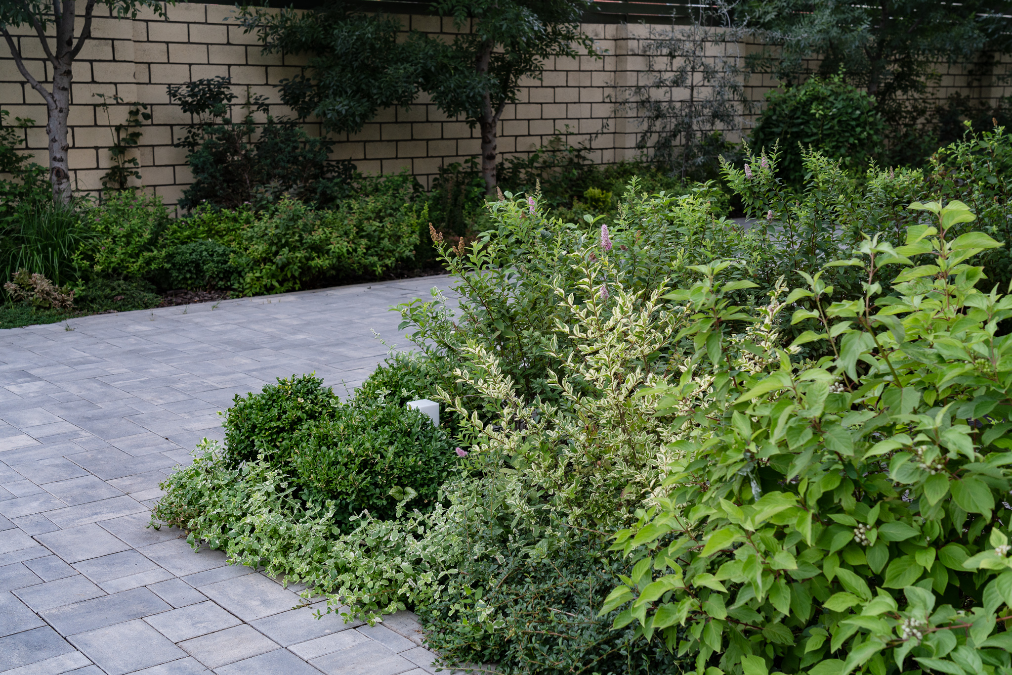 Фасадна частина у високих клумбах вирізняється різноманіттям духмяних трав, осок, бересклетів та барвінків, що гармонійно сплітаються між собою. Скелетом саду обрали кипарисовики, аби пов’язати між собою першу і другу частини об’єкта.
