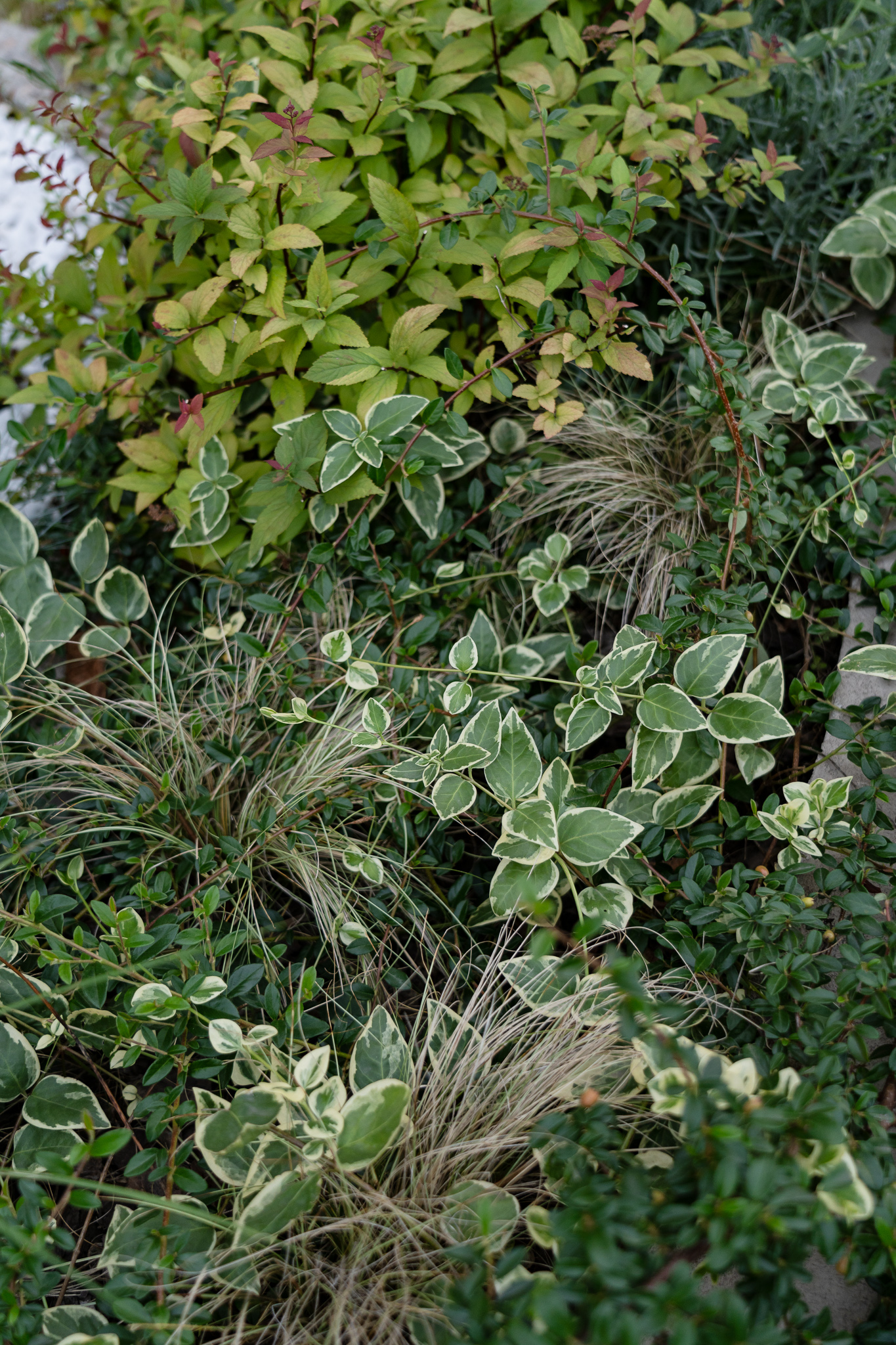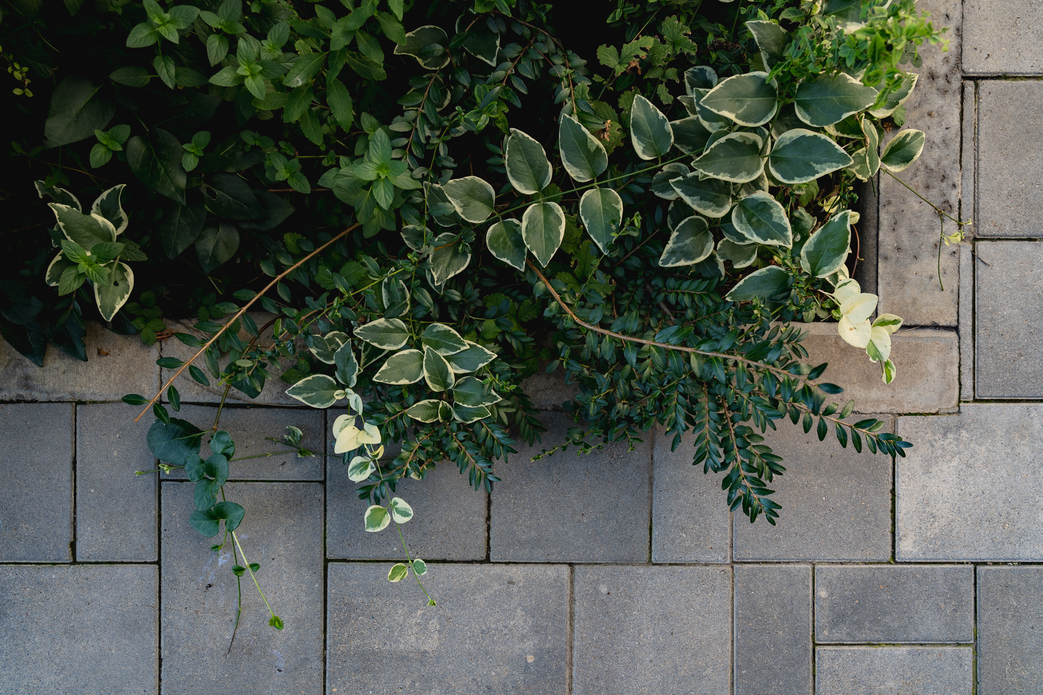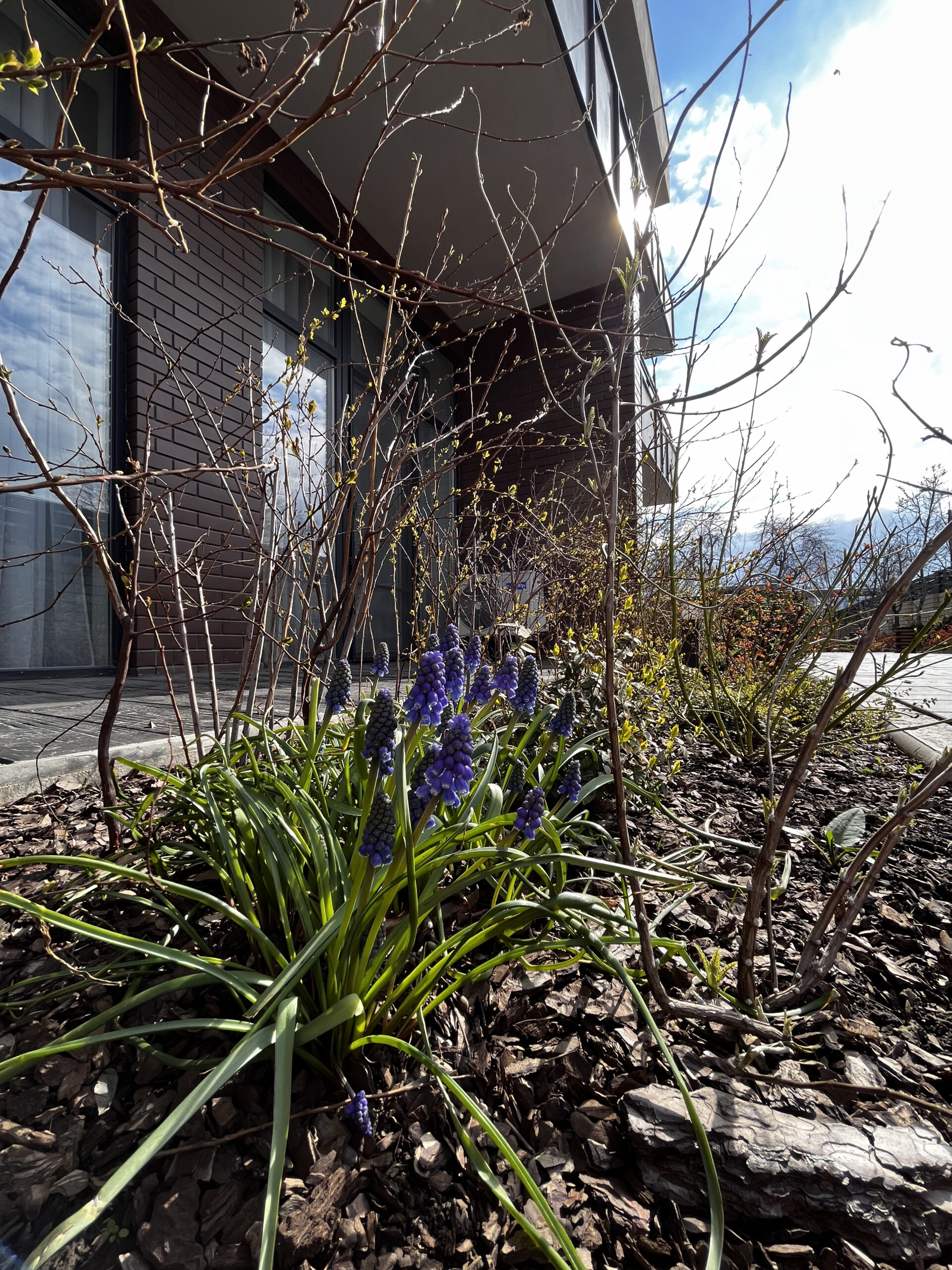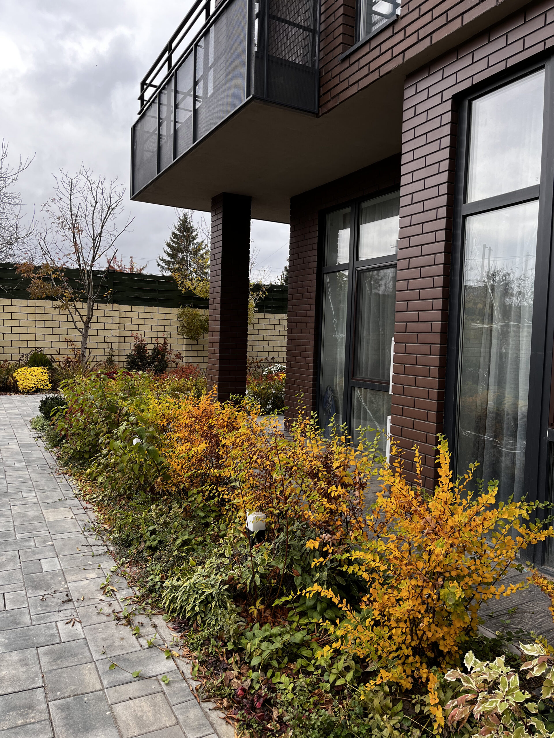 Перша частина, висаджена у 2019 році, включає рулонні газони, петунії, загущену висадку хвойних та чагарників, підбір рослин по 2–5 штук кожного виду та форми — все, що було доступне на ринку. У результаті — один великий хаос, за яким потрібно постійно доглядати: вичісувати газони, відсаджувати занадто великі рослини через нестачу простору, часто формувати ті, які неможливо відсадити, та лікувати самшити.