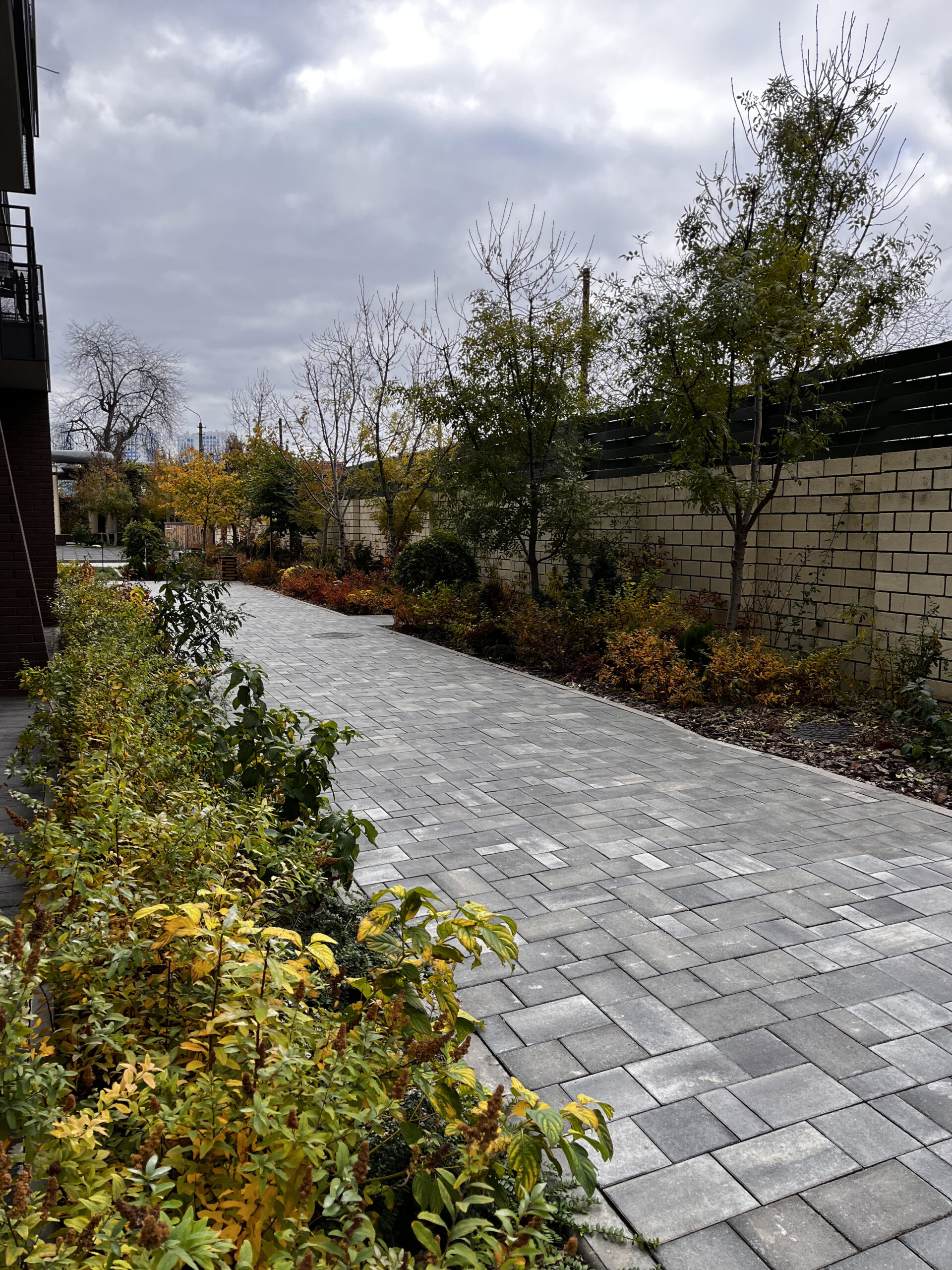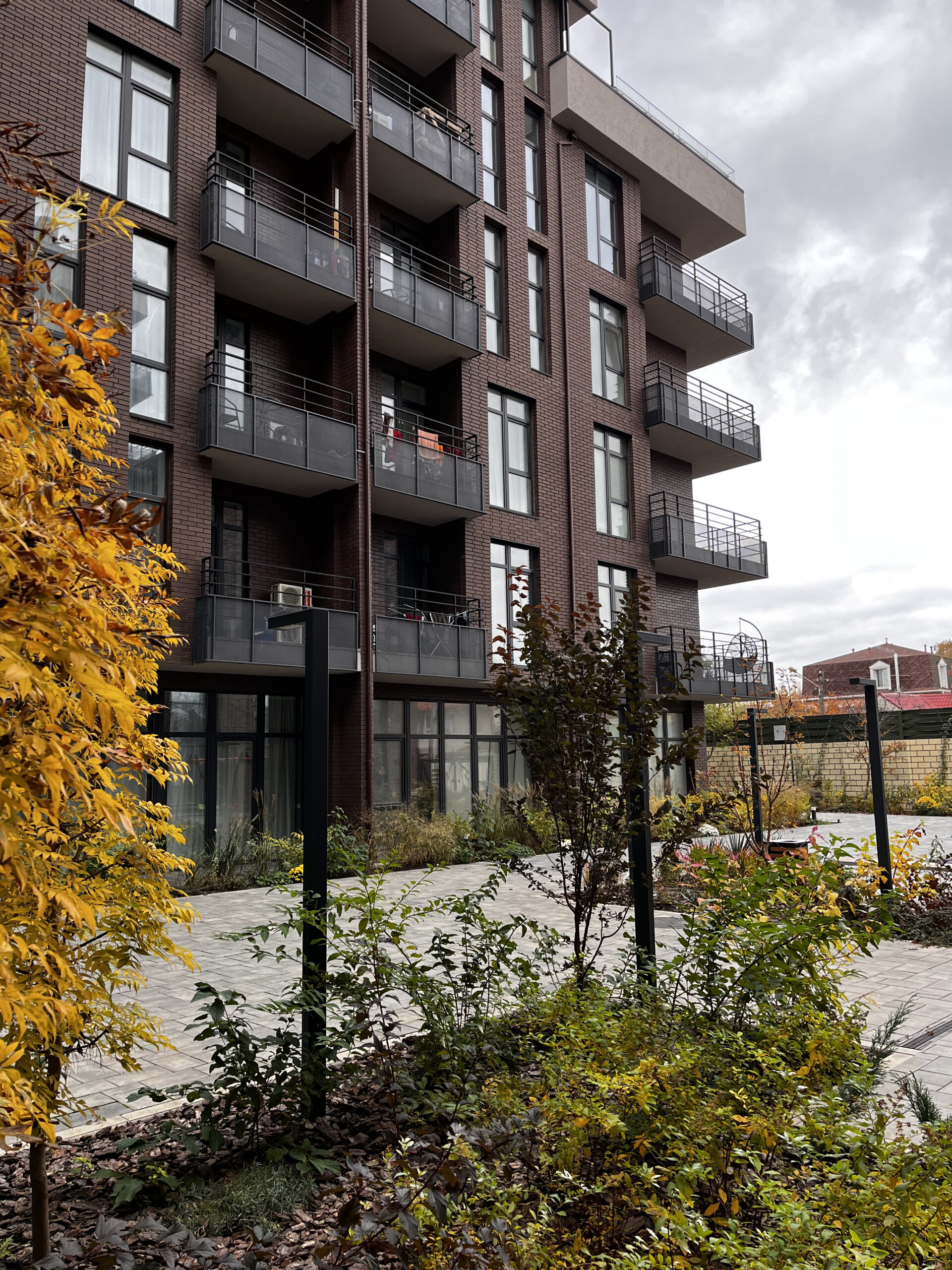 Величезна територія ЖК із двома атріумами, зоною паркування та фасадною частиною, що об’єднує два світи — те, як озеленення бачить замовник, і те, як хотіла б, аби його сприймали сучасні замовники, команда проєкту.
