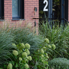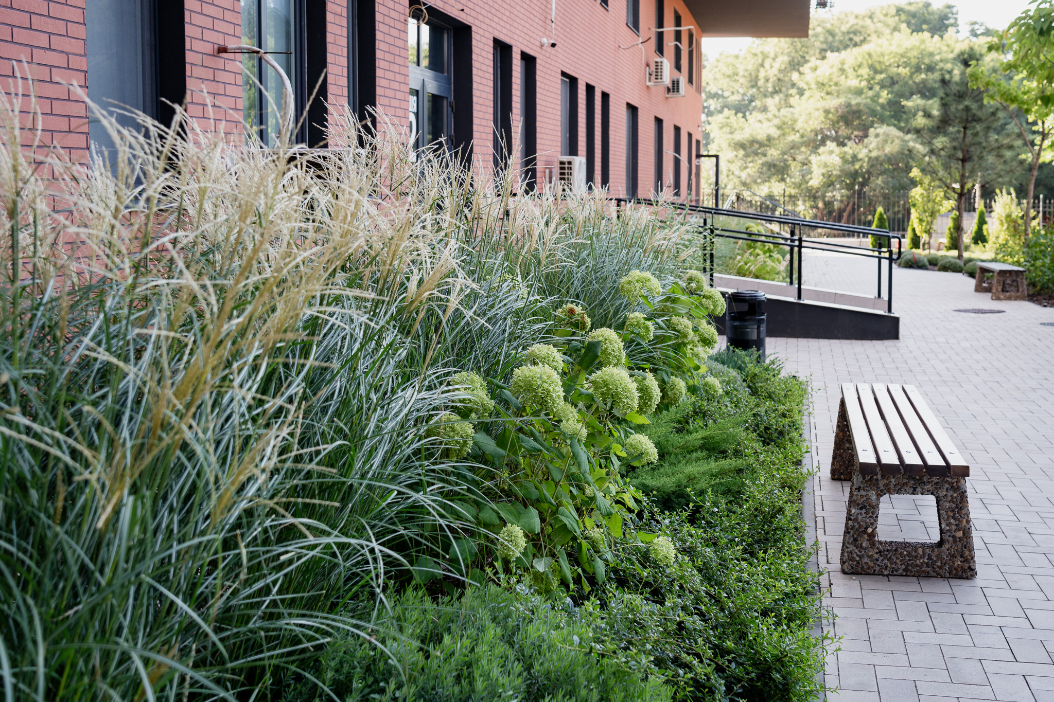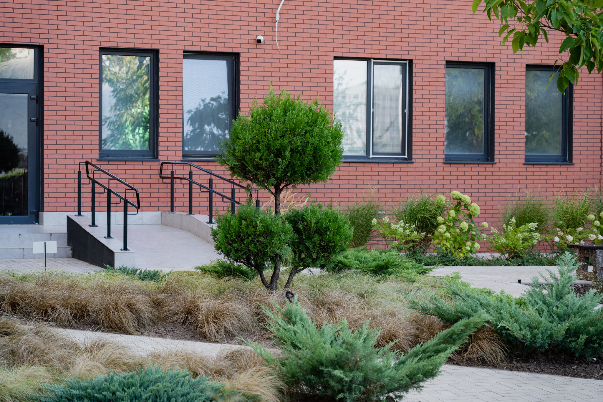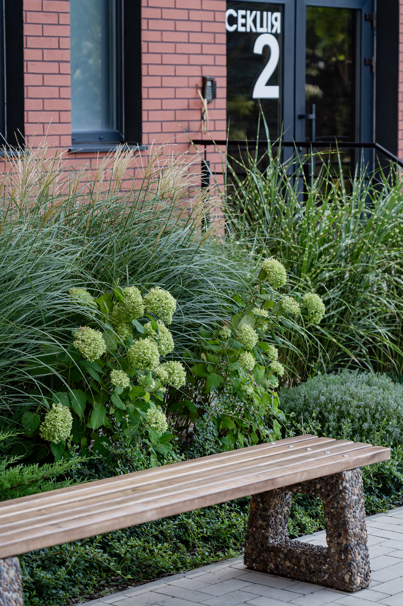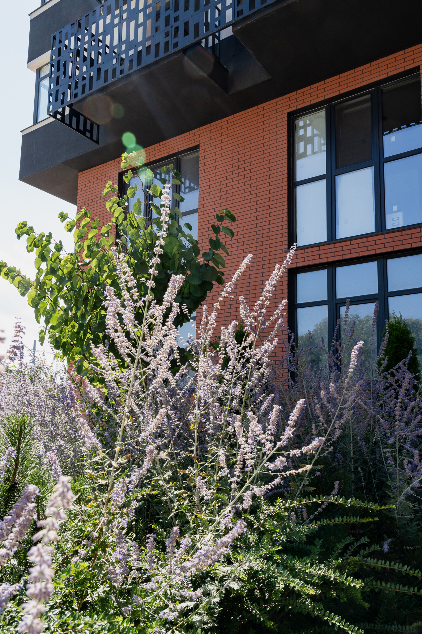 Під яскравий фасад будинку команда посадила групами гортензії та міскантуси Зебрина. Для створення тіні використовували альбіції, сакури, глід Пол Скарлетт, сосни та катальпи, які ще й змінюють цвітіння один одного з травня по серпень. А від вулиці прикрили двір масивами перовськії та міскантуса китайського.