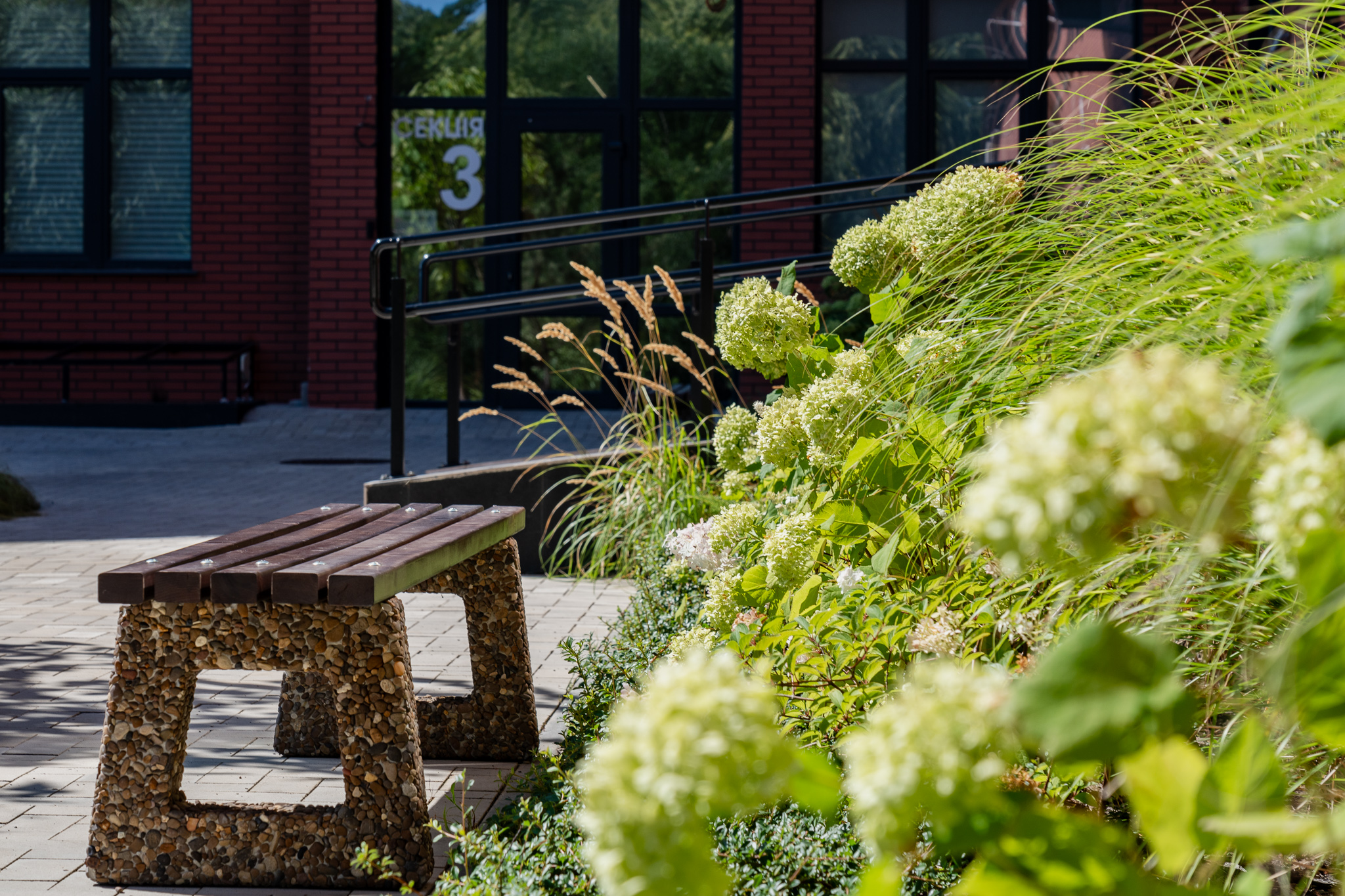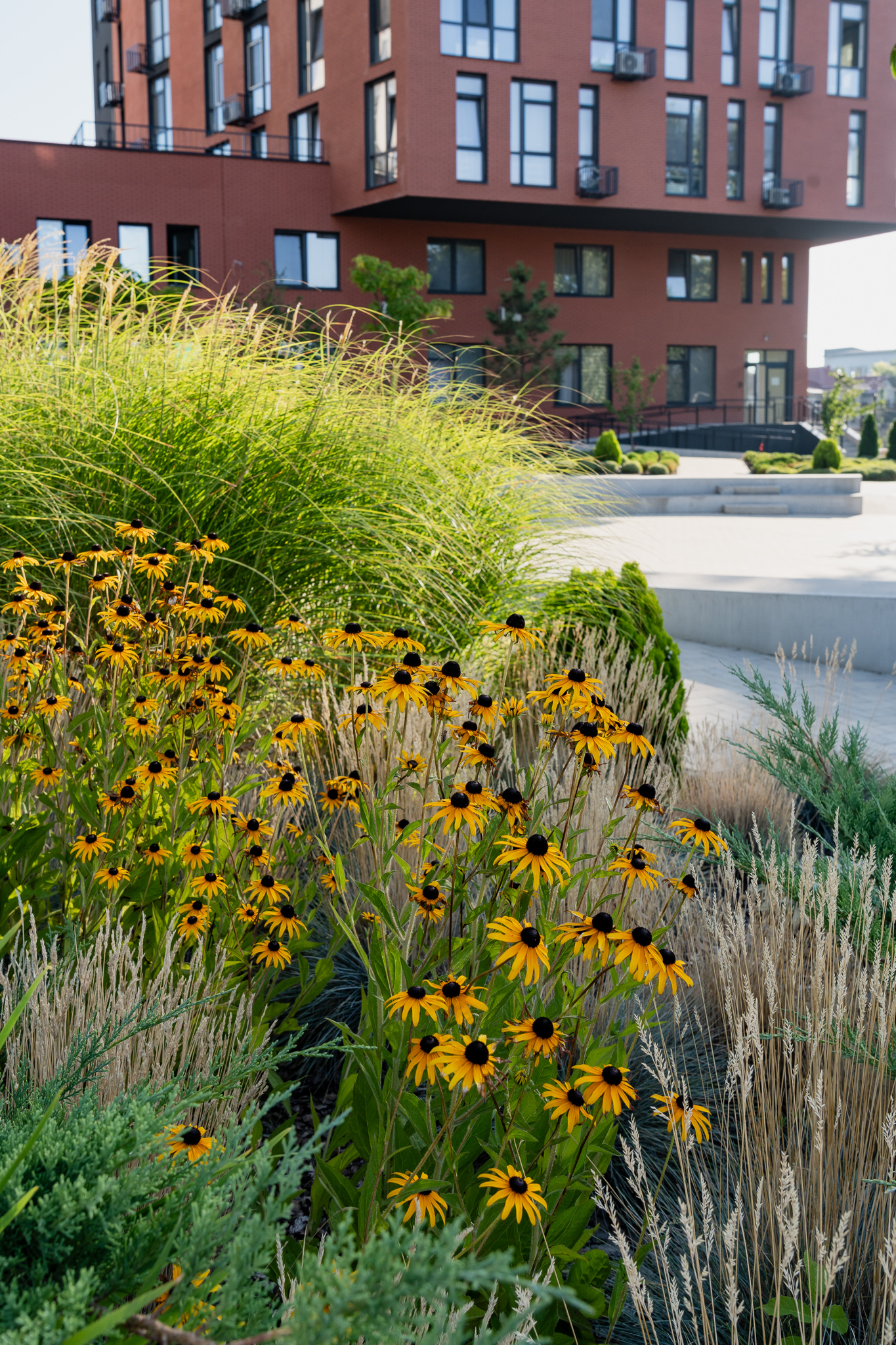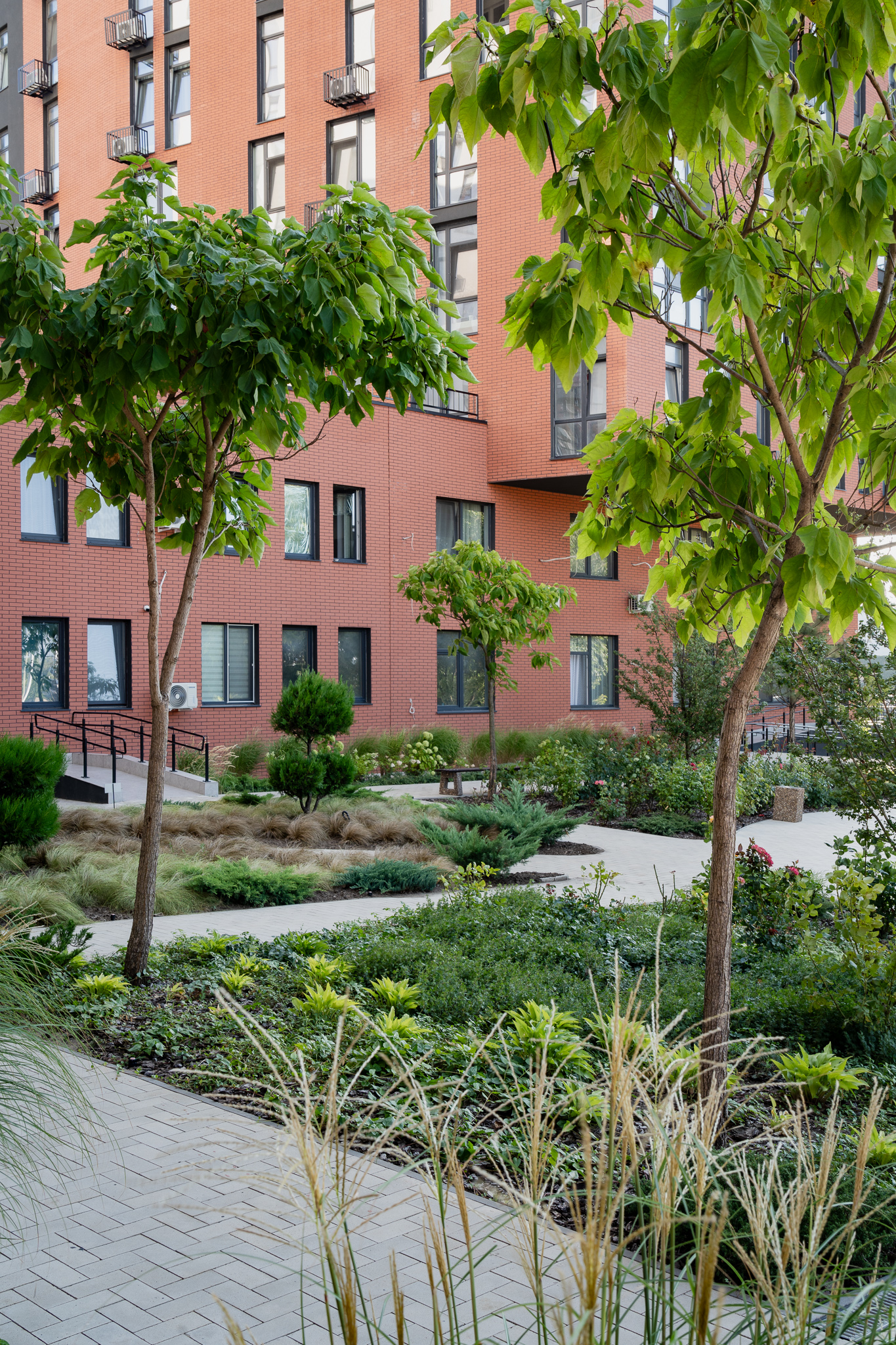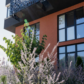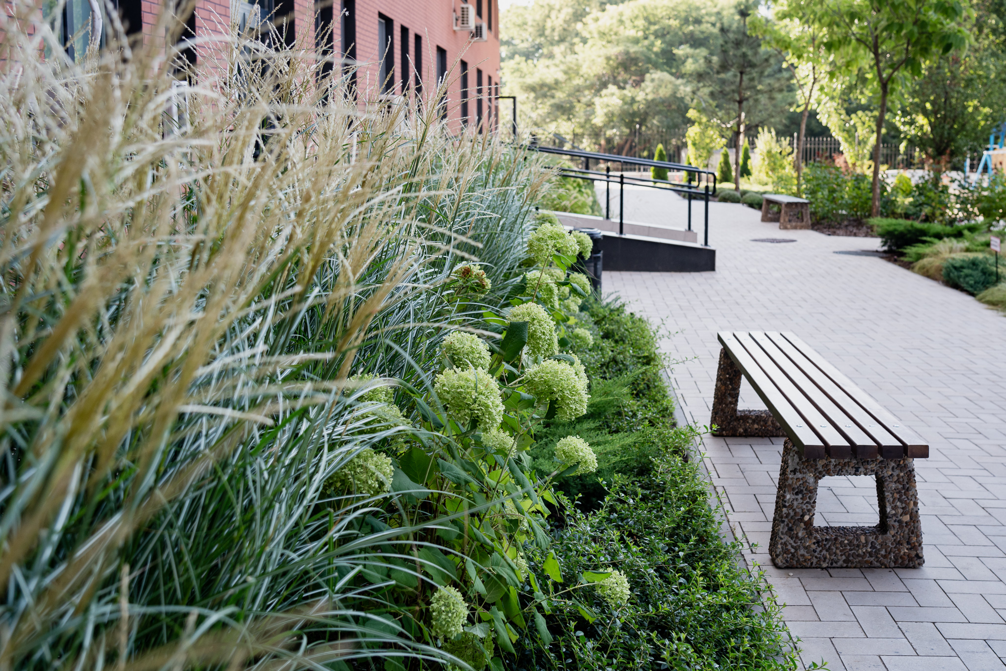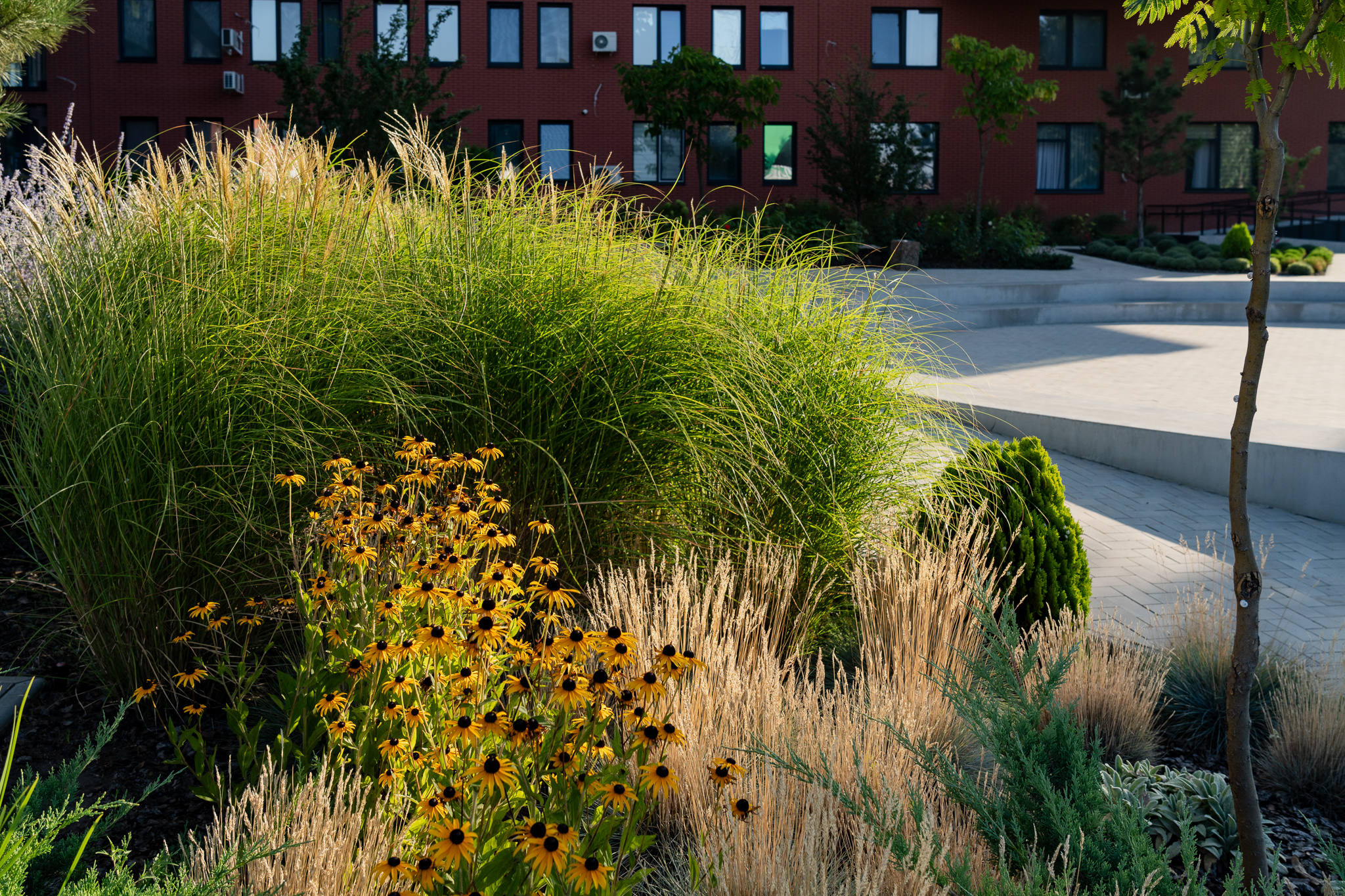 Під яскравий фасад будинку команда посадила групами гортензії та міскантуси Зебрина. Для створення тіні використовували альбіції, сакури, глід Пол Скарлетт, сосни та катальпи, які ще й змінюють цвітіння один одного з травня по серпень. А від вулиці прикрили двір масивами перовськії та міскантуса китайського.