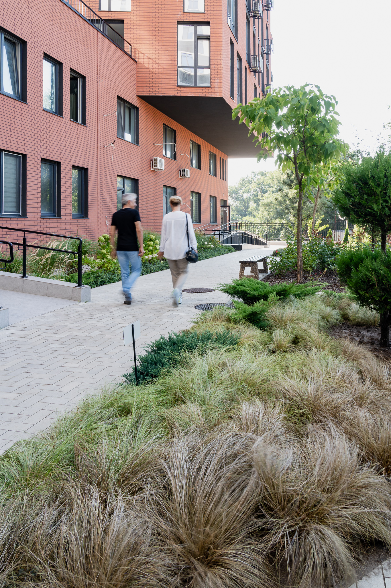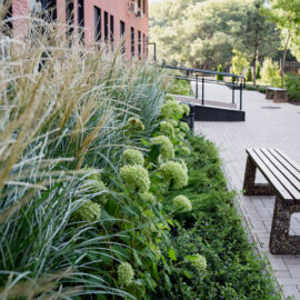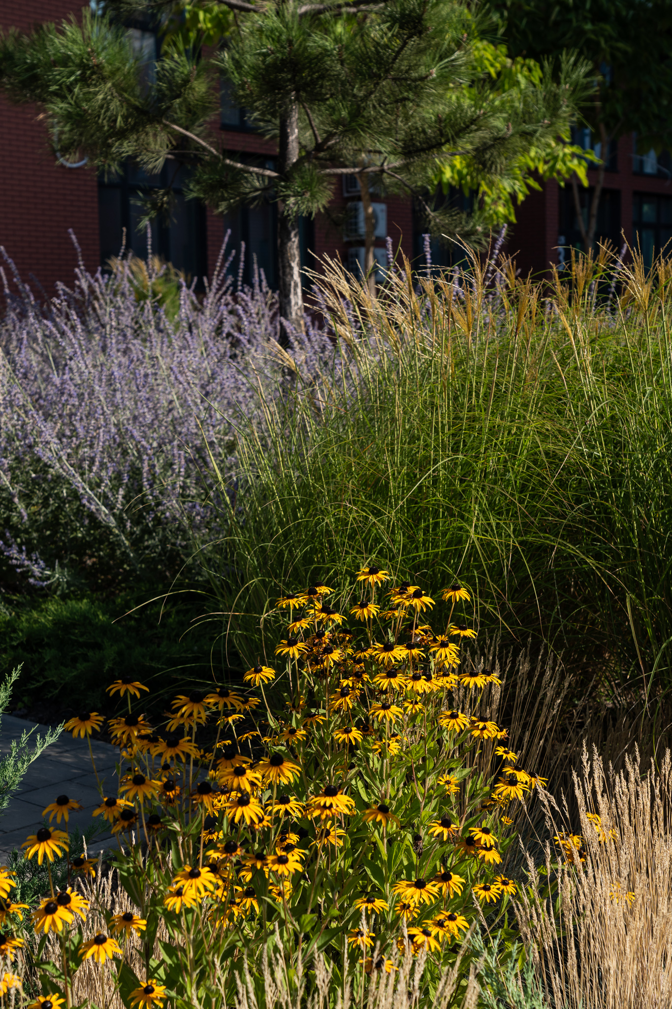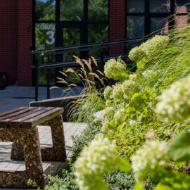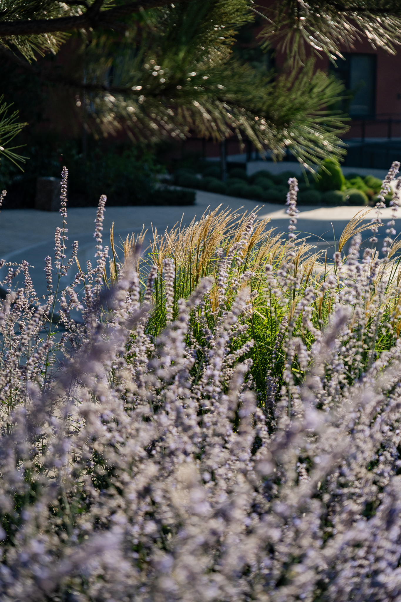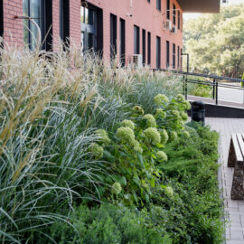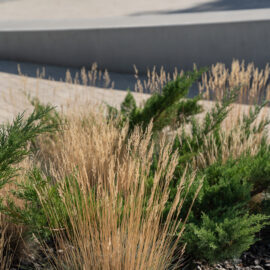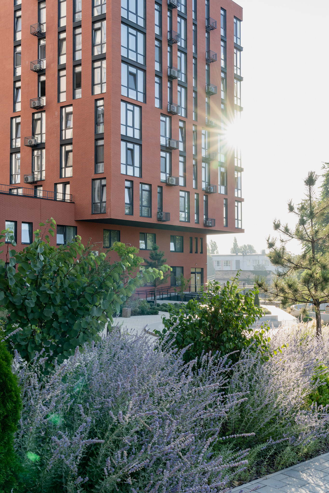 Під яскравий фасад будинку команда посадила групами гортензії та міскантуси Зебрина. Для створення тіні використовували альбіції, сакури, глід Пол Скарлетт, сосни та катальпи, які ще й змінюють цвітіння один одного з травня по серпень. А від вулиці прикрили двір масивами перовськії та міскантуса китайського.