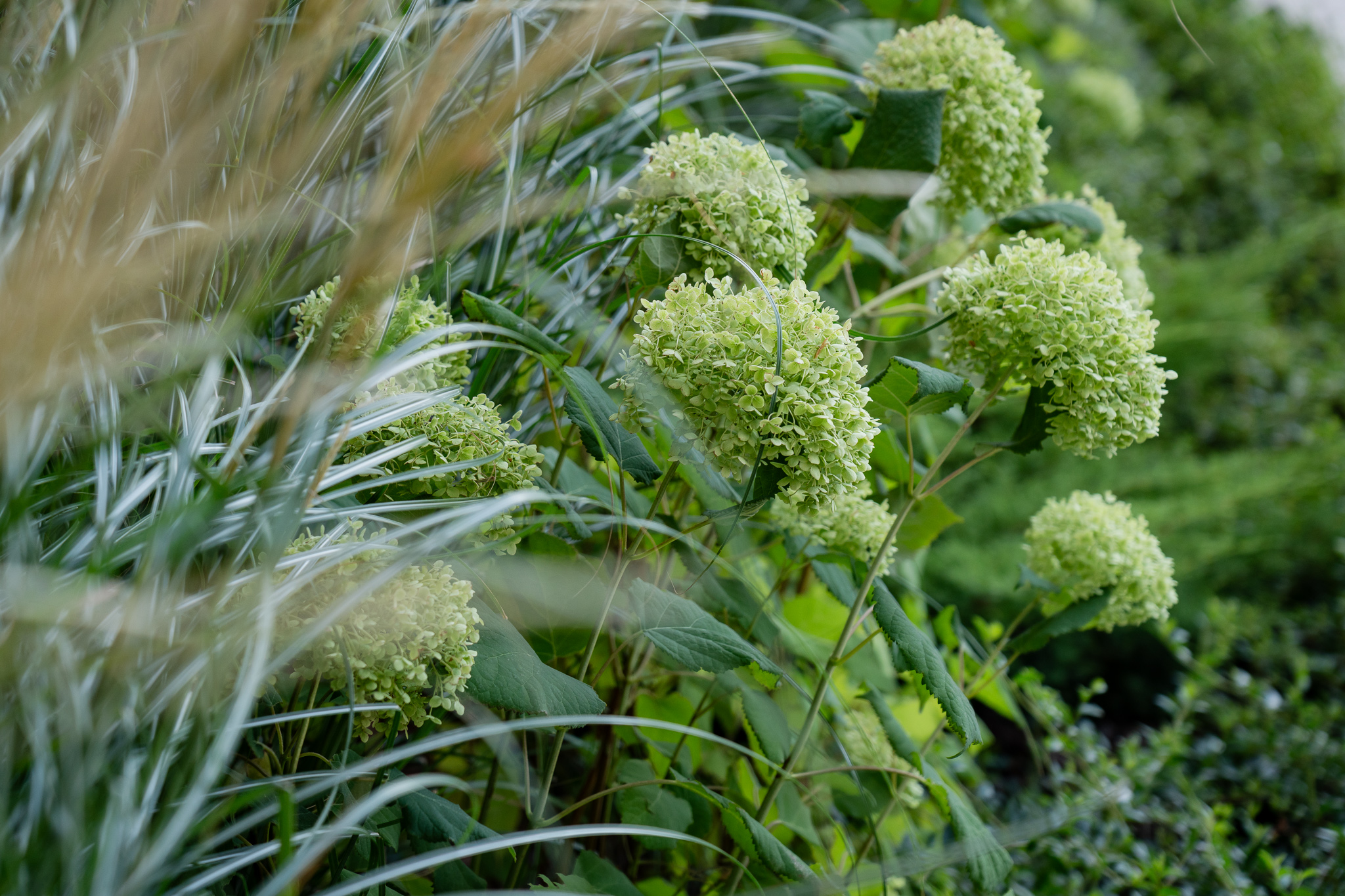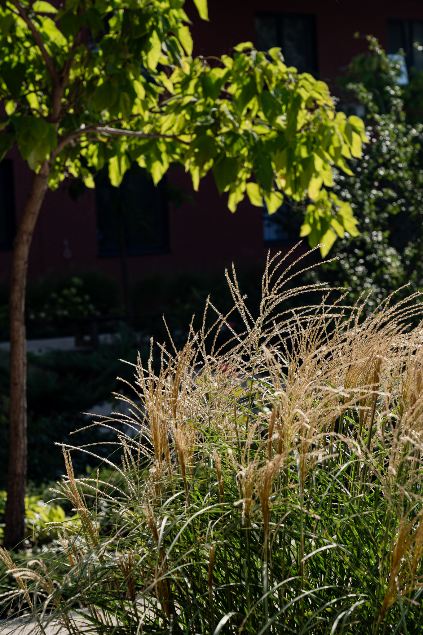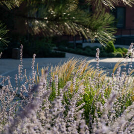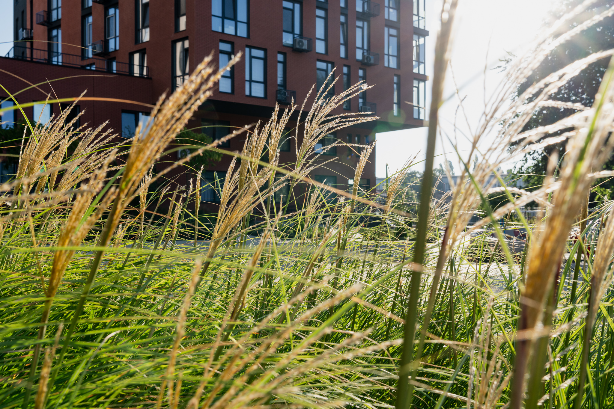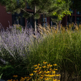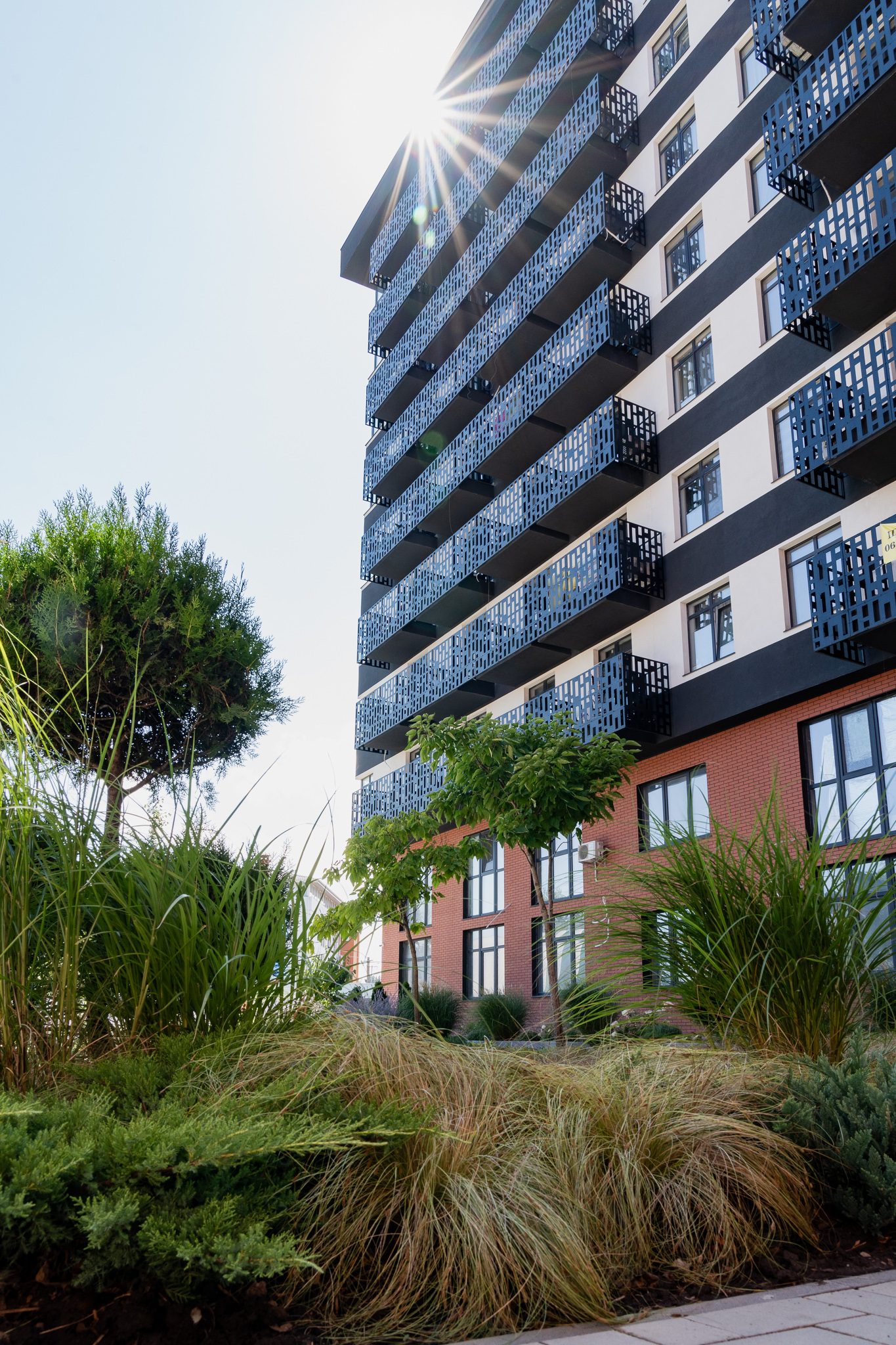 Під яскравий фасад будинку команда посадила групами гортензії та міскантуси Зебрина. Для створення тіні використовували альбіції, сакури, глід Пол Скарлетт, сосни та катальпи, які ще й змінюють цвітіння один одного з травня по серпень. А від вулиці прикрили двір масивами перовськії та міскантуса китайського.