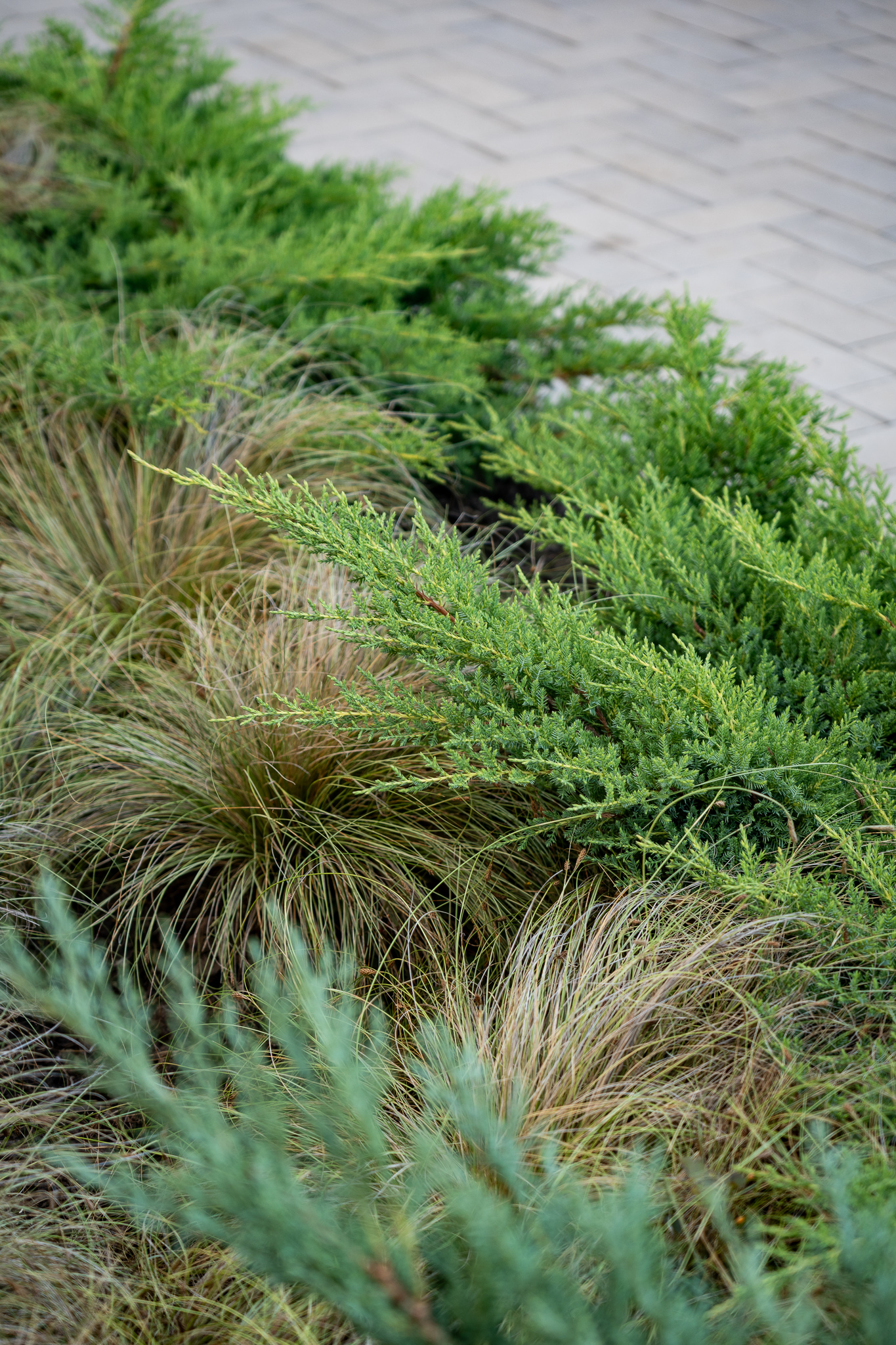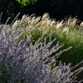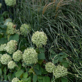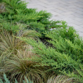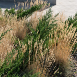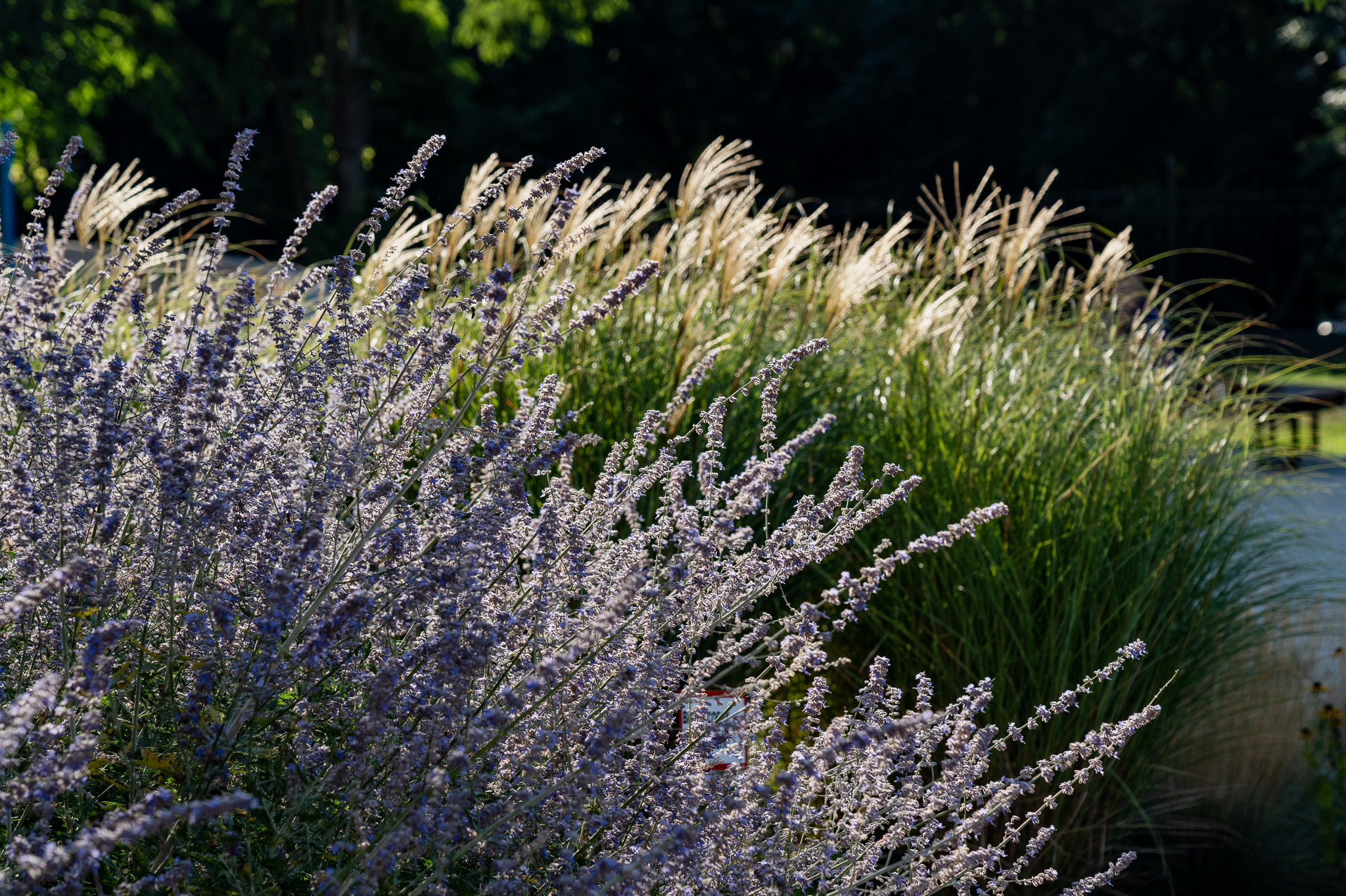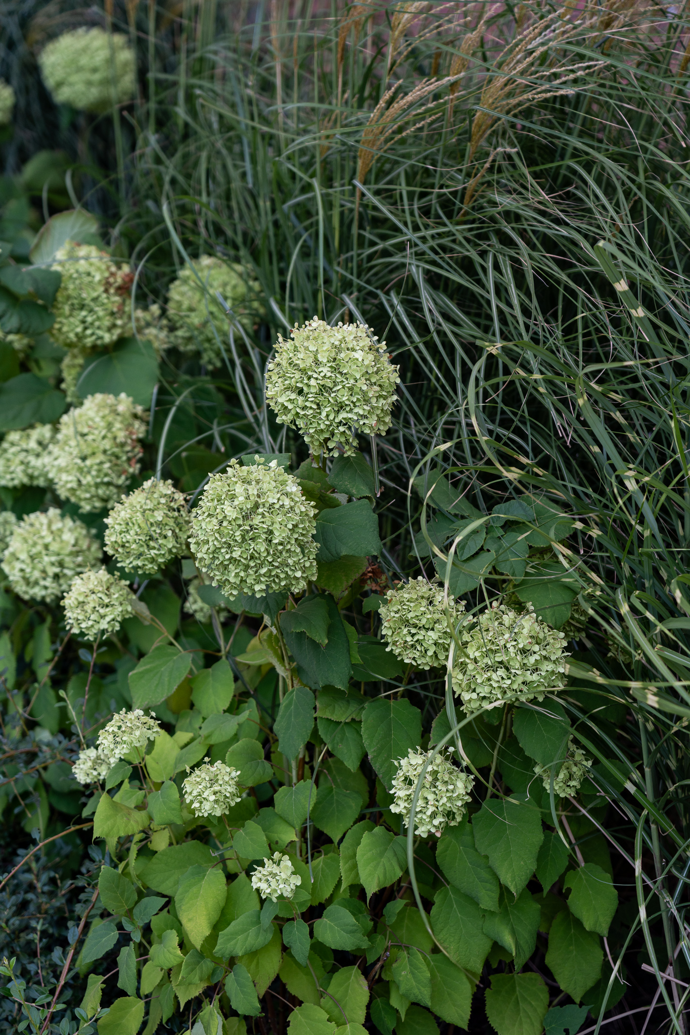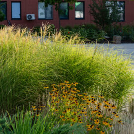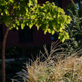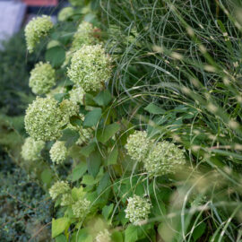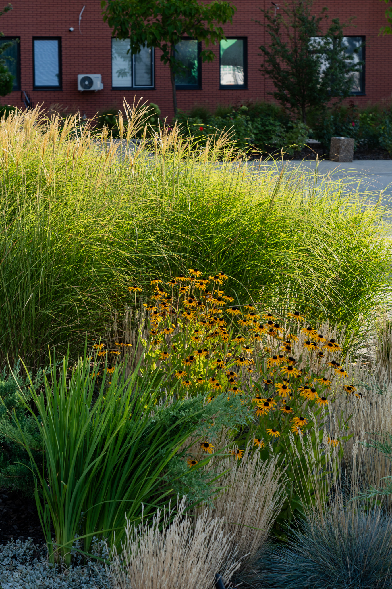 Під яскравий фасад будинку команда посадила групами гортензії та міскантуси Зебрина. Для створення тіні використовували альбіції, сакури, глід Пол Скарлетт, сосни та катальпи, які ще й змінюють цвітіння один одного з травня по серпень. А від вулиці прикрили двір масивами перовськії та міскантуса китайського.