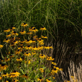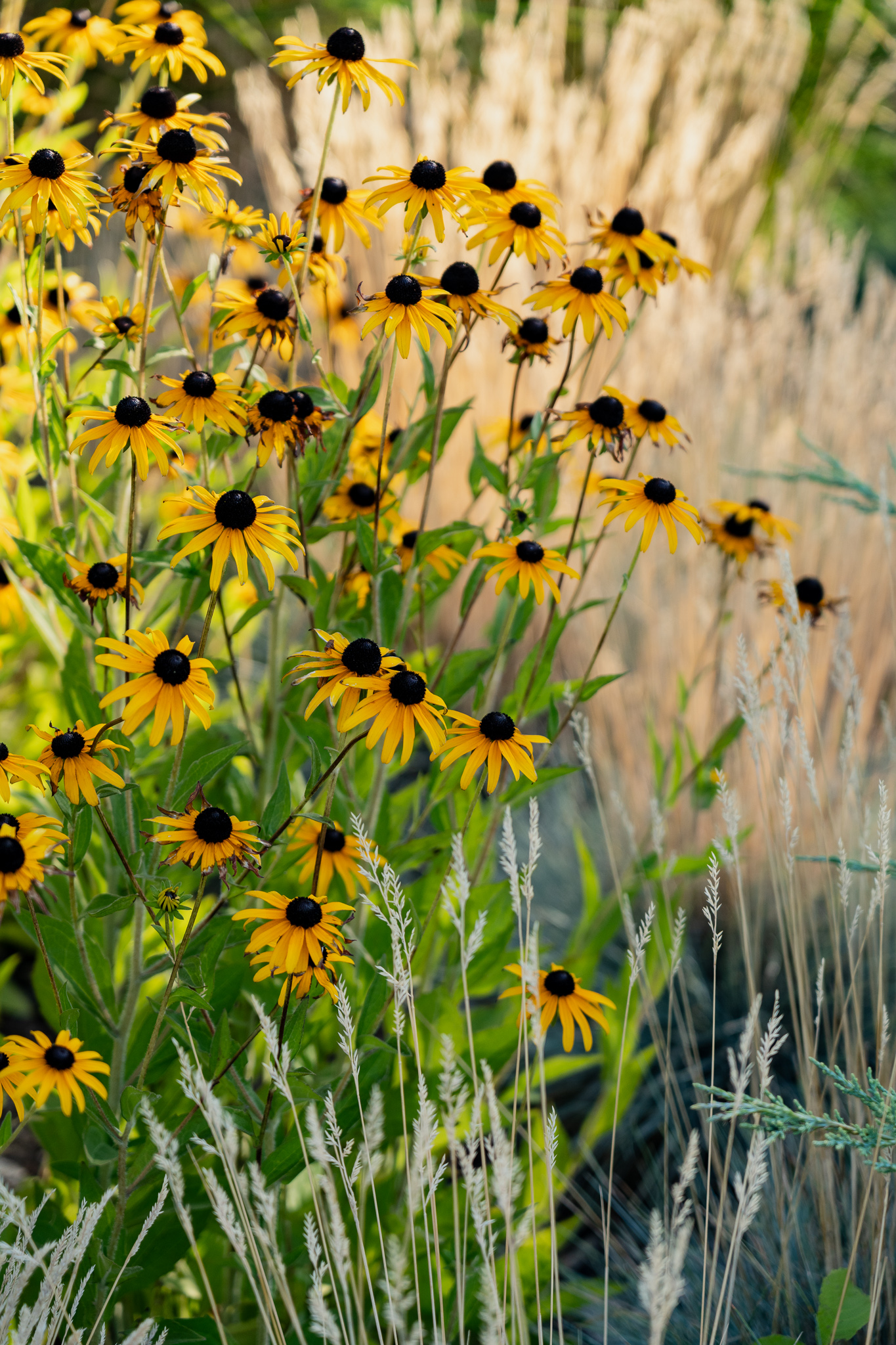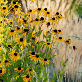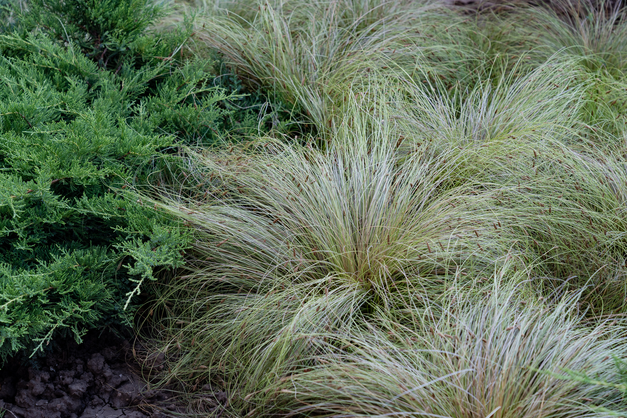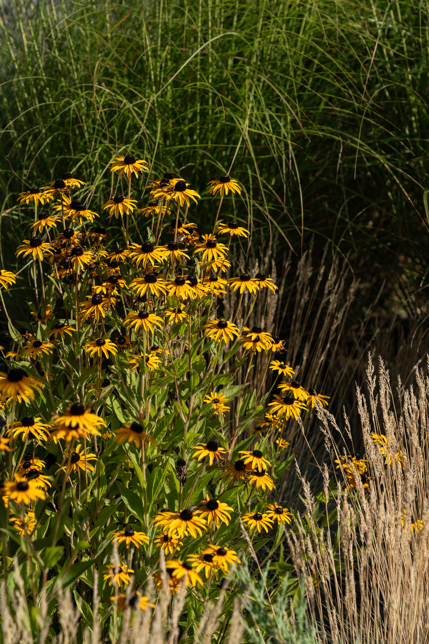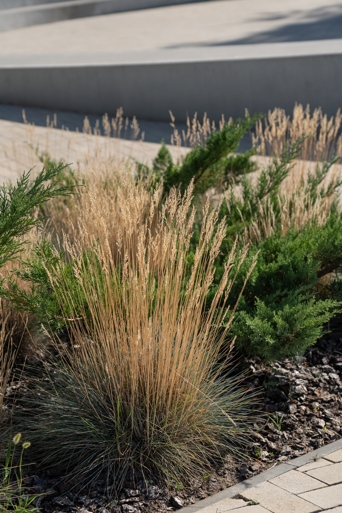 Під яскравий фасад будинку команда посадила групами гортензії та міскантуси Зебрина. Для створення тіні використовували альбіції, сакури, глід Пол Скарлетт, сосни та катальпи, які ще й змінюють цвітіння один одного з травня по серпень. А від вулиці прикрили двір масивами перовськії та міскантуса китайського.